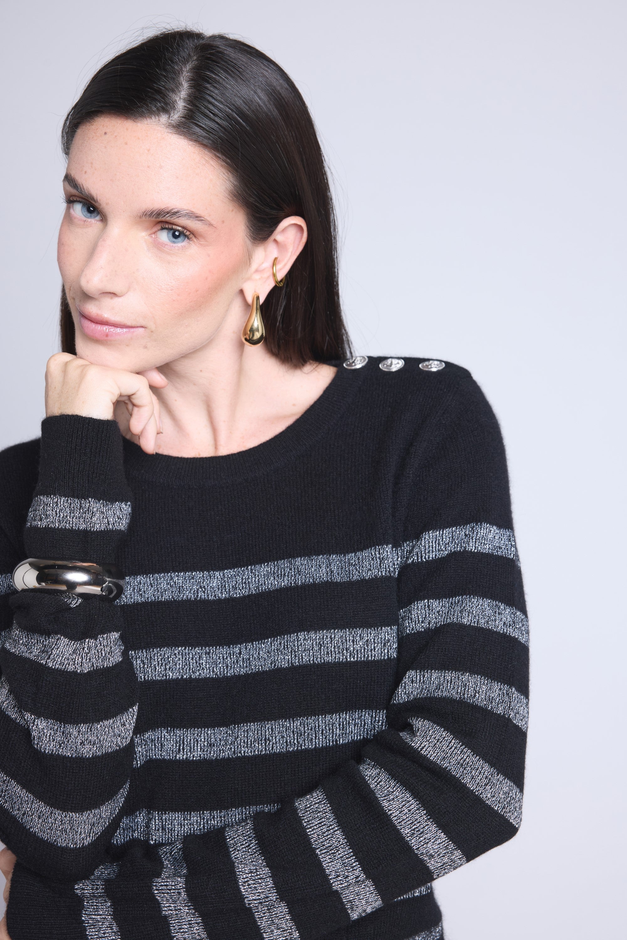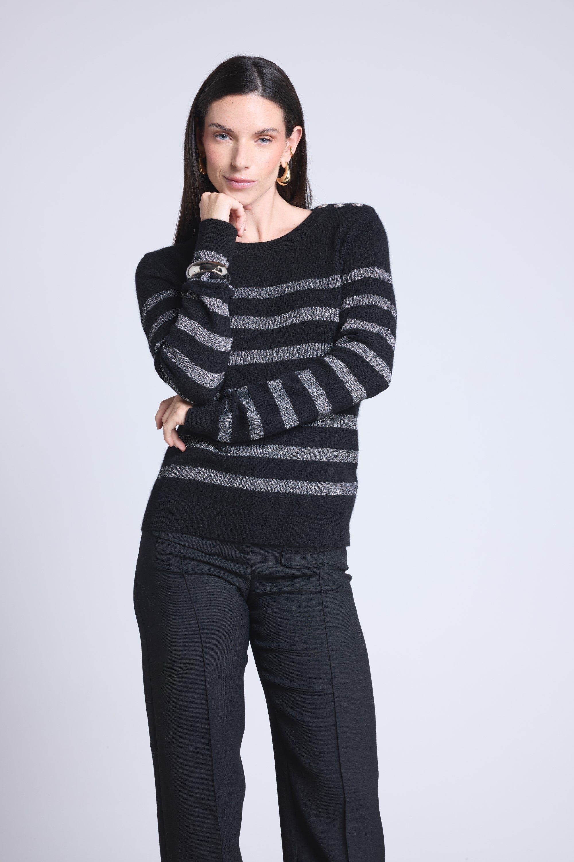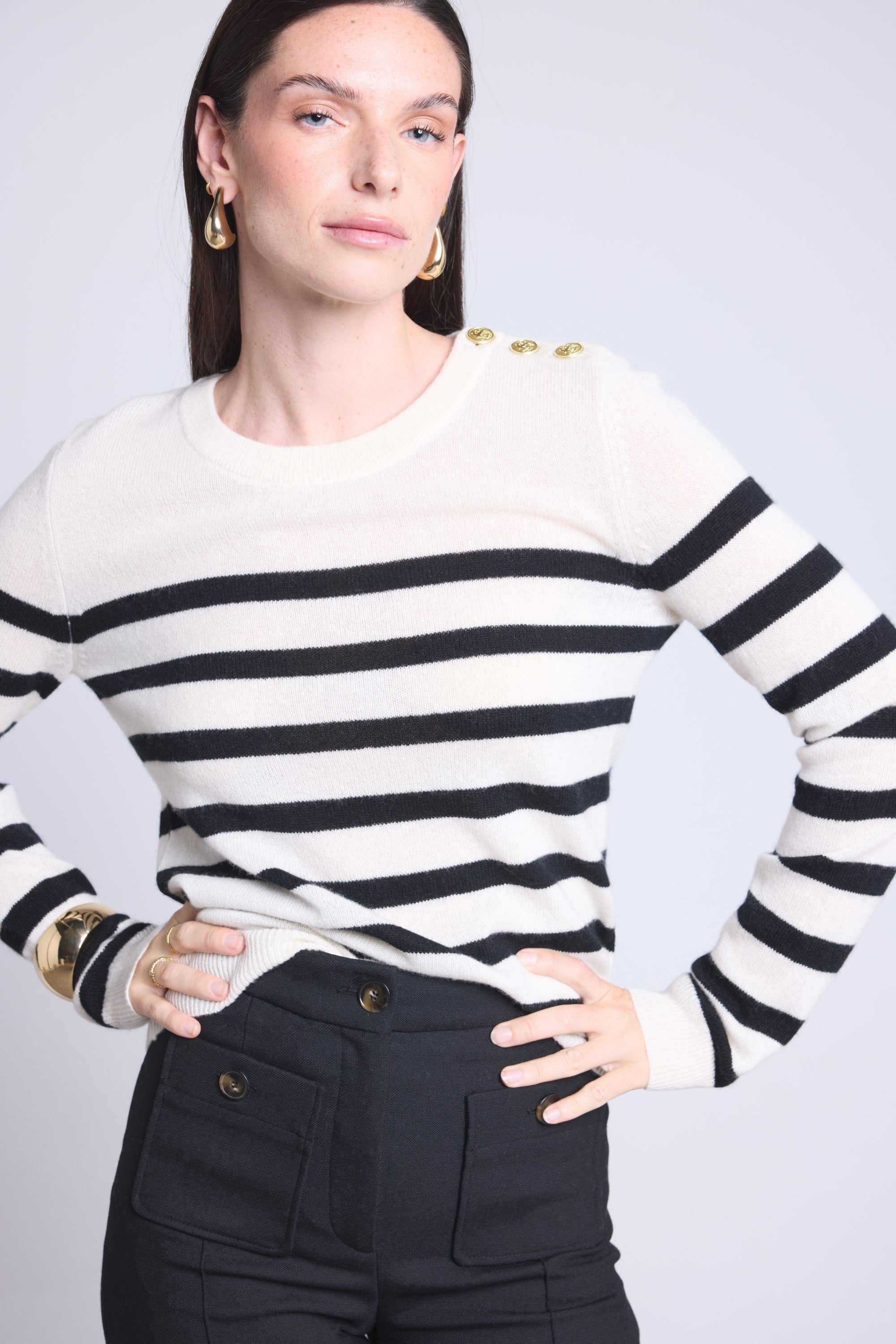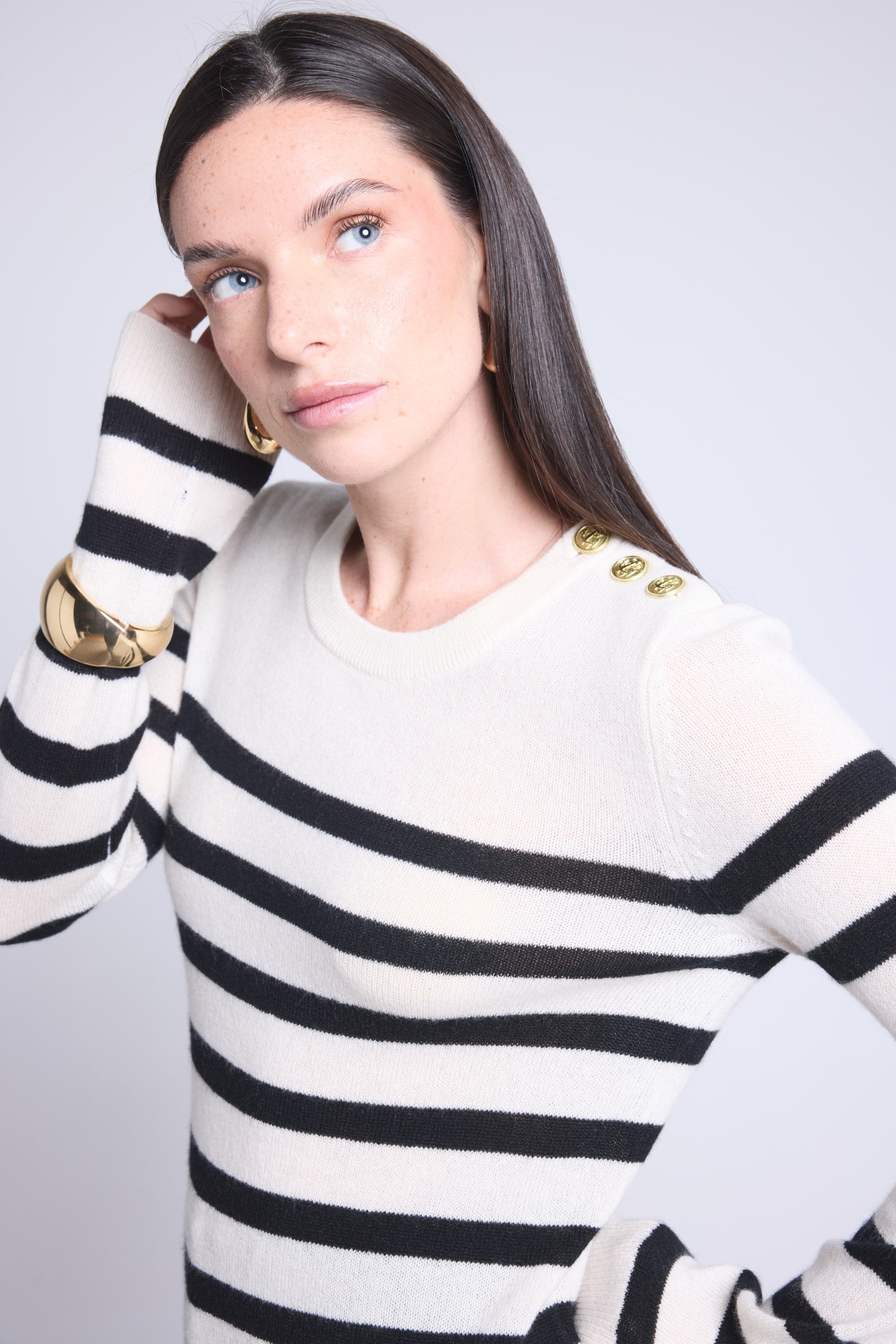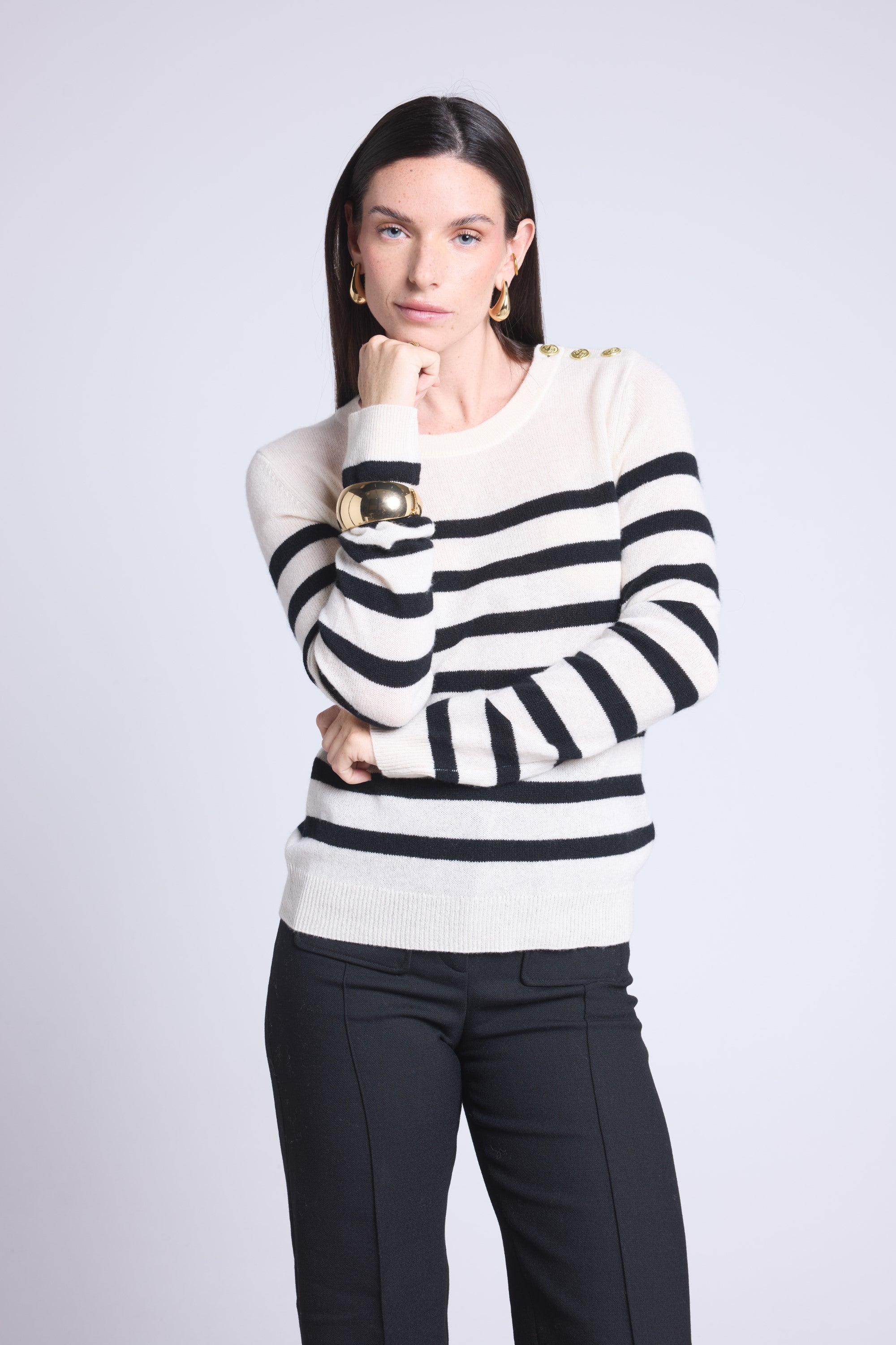 Un esprit marin revisité avec une touche chic : des rayures fines et équilibrées. sublimées par une patte épaule ornée de trois boutons. Une pièce à la fois raffinée et intemporelle, parfaite pour rehausser une silhouette simple avec élégance.