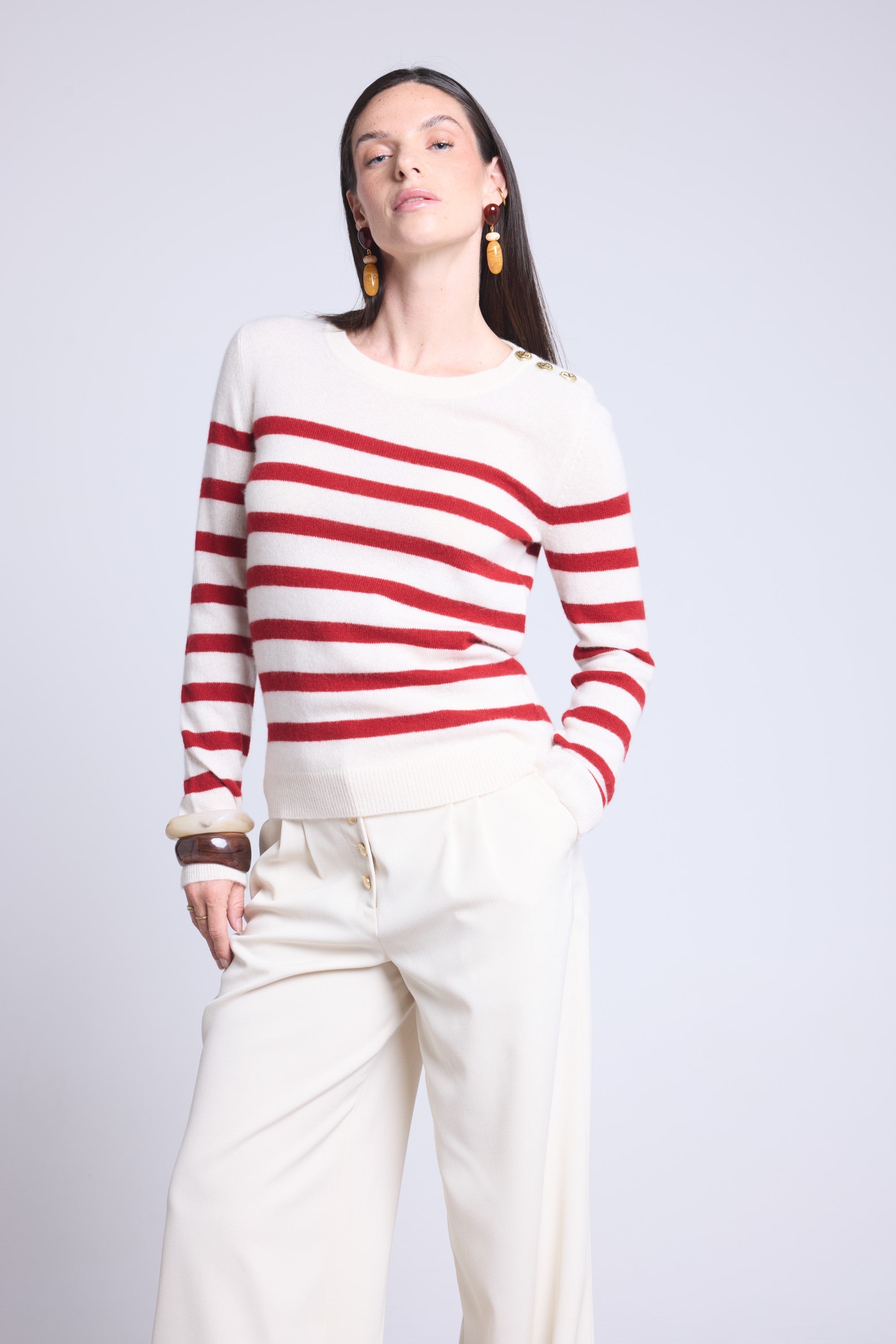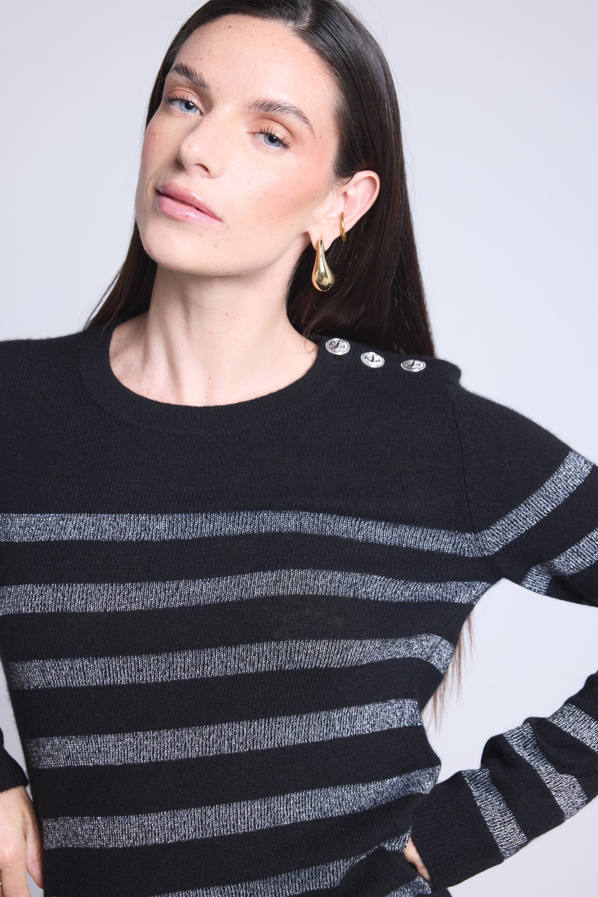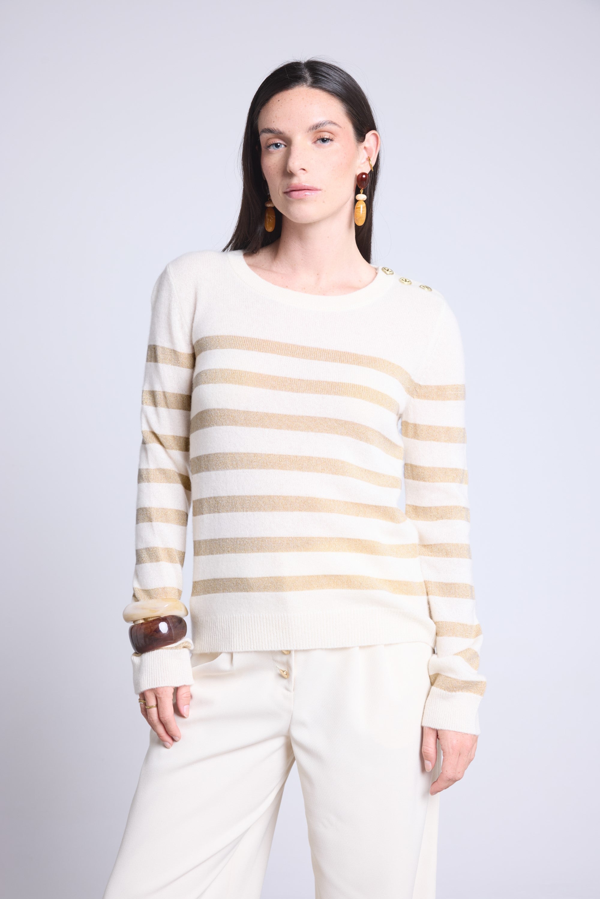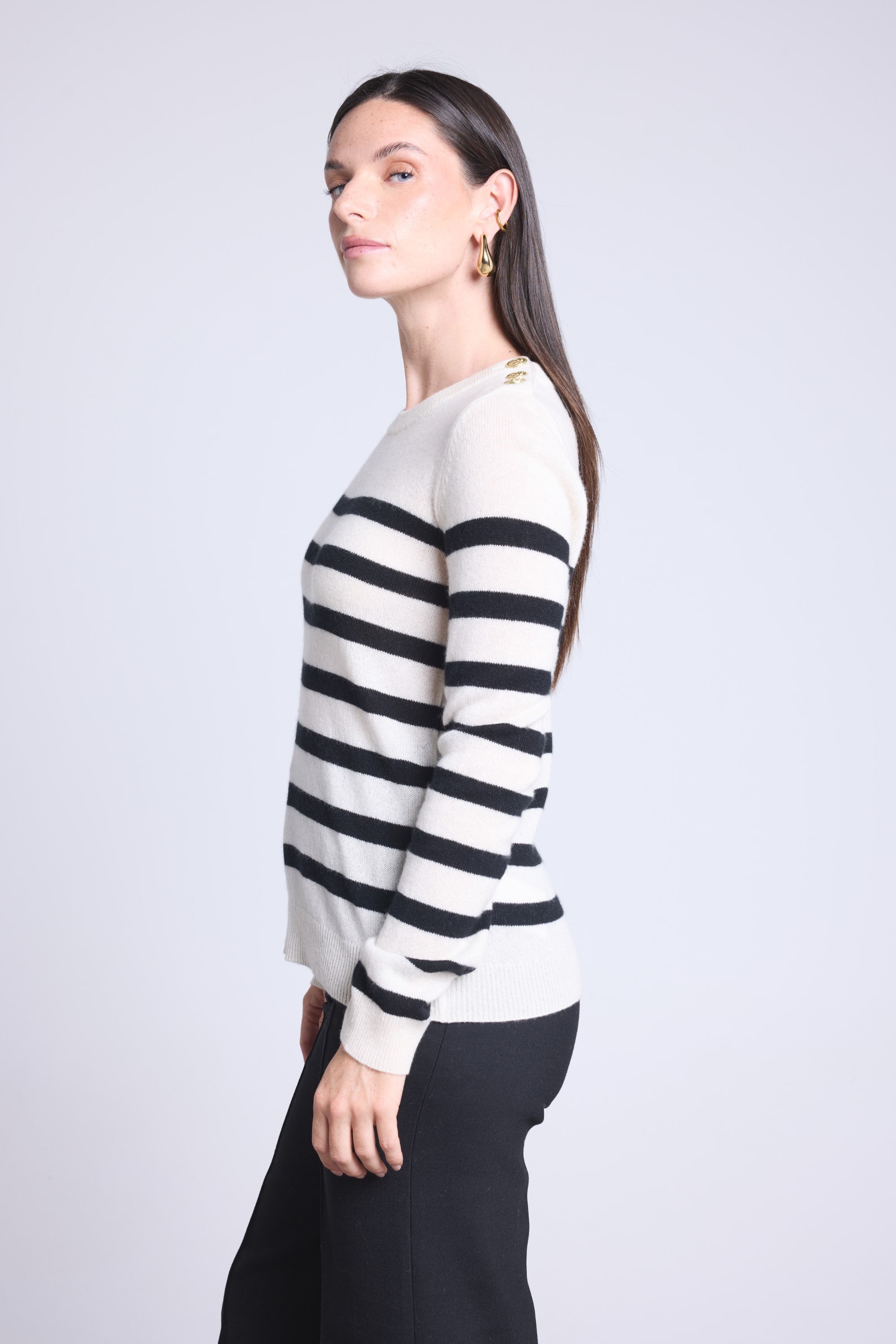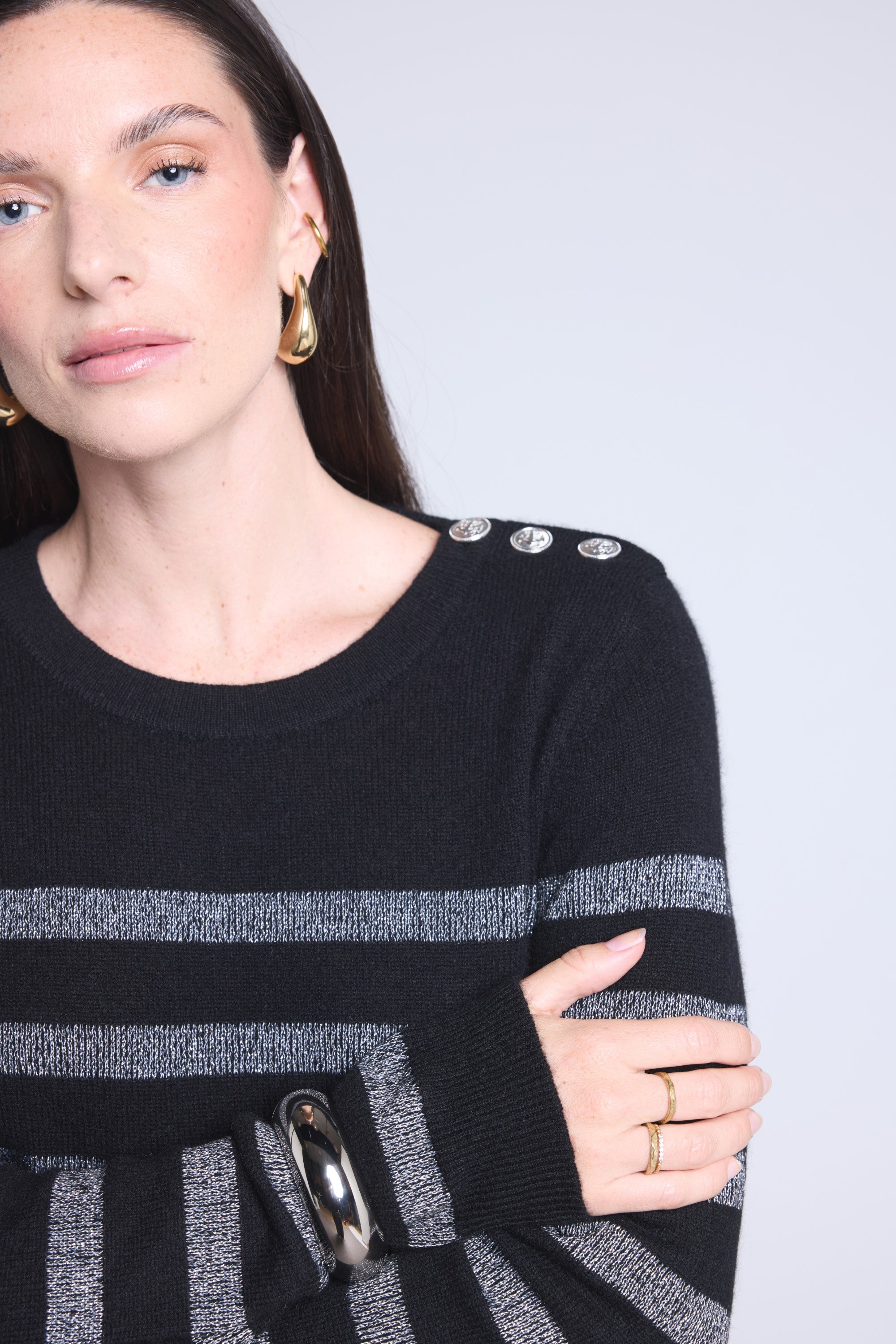 Un esprit marin revisité avec une touche chic : des rayures fines et équilibrées. sublimées par une patte épaule ornée de trois boutons. Une pièce à la fois raffinée et intemporelle, parfaite pour rehausser une silhouette simple avec élégance.