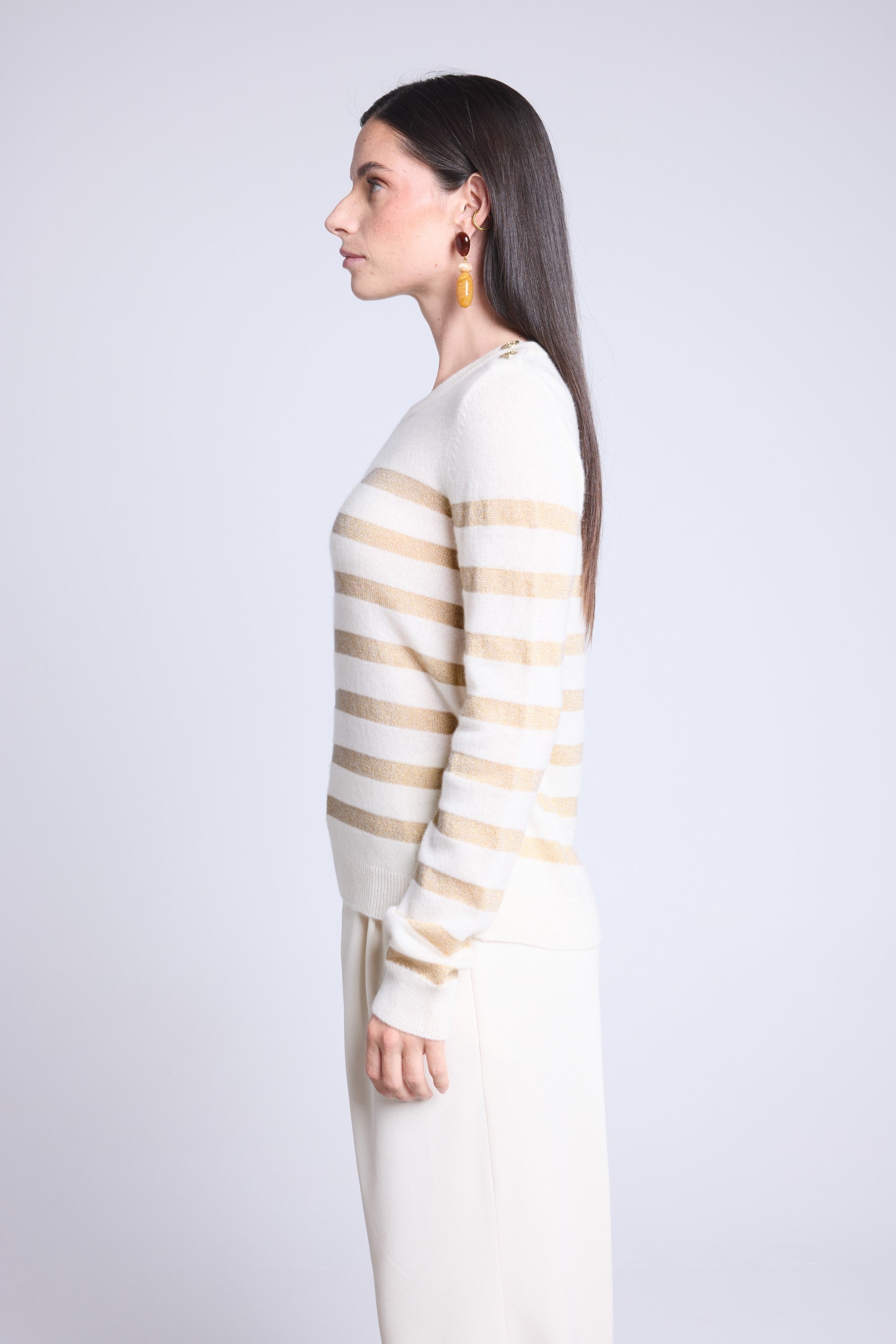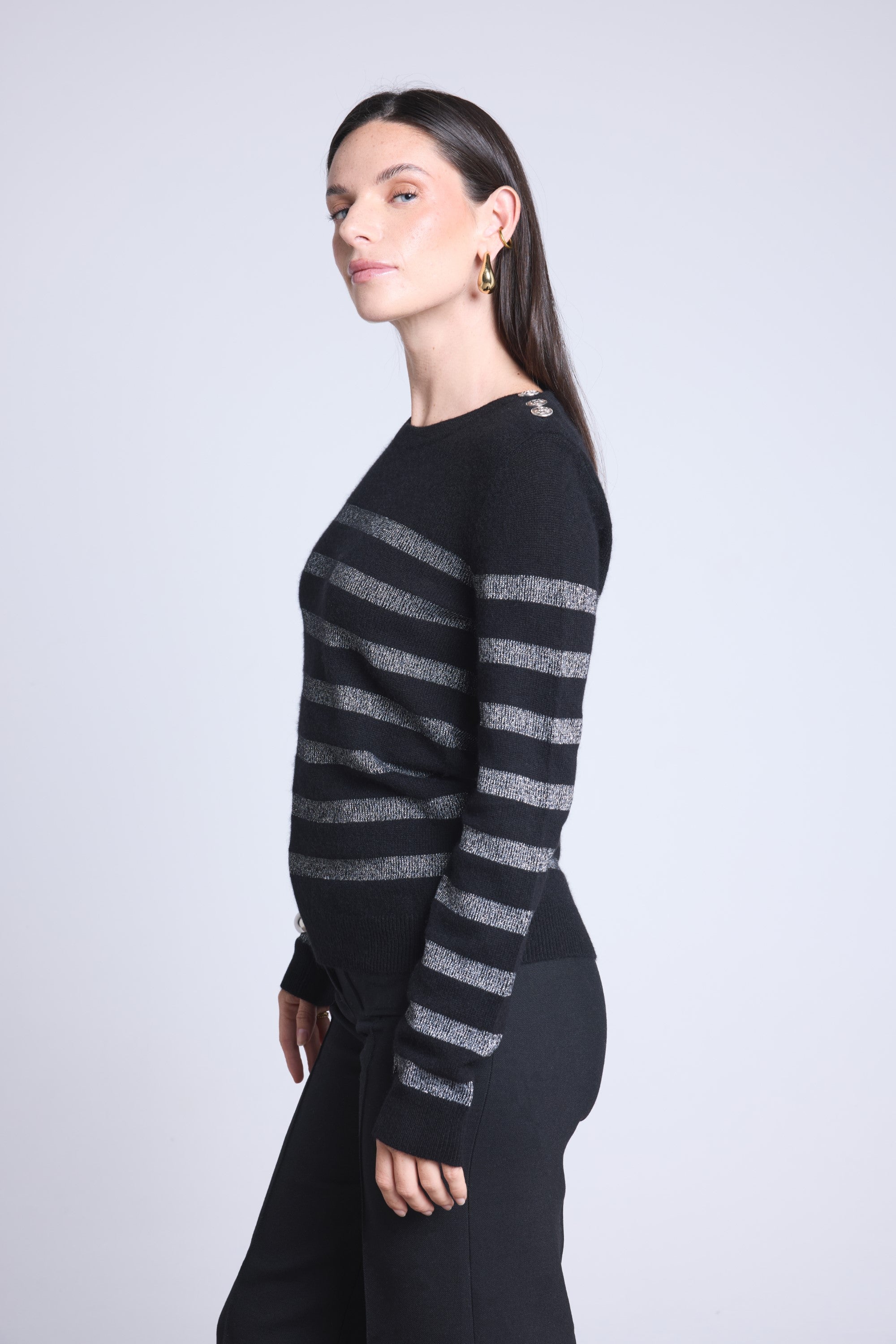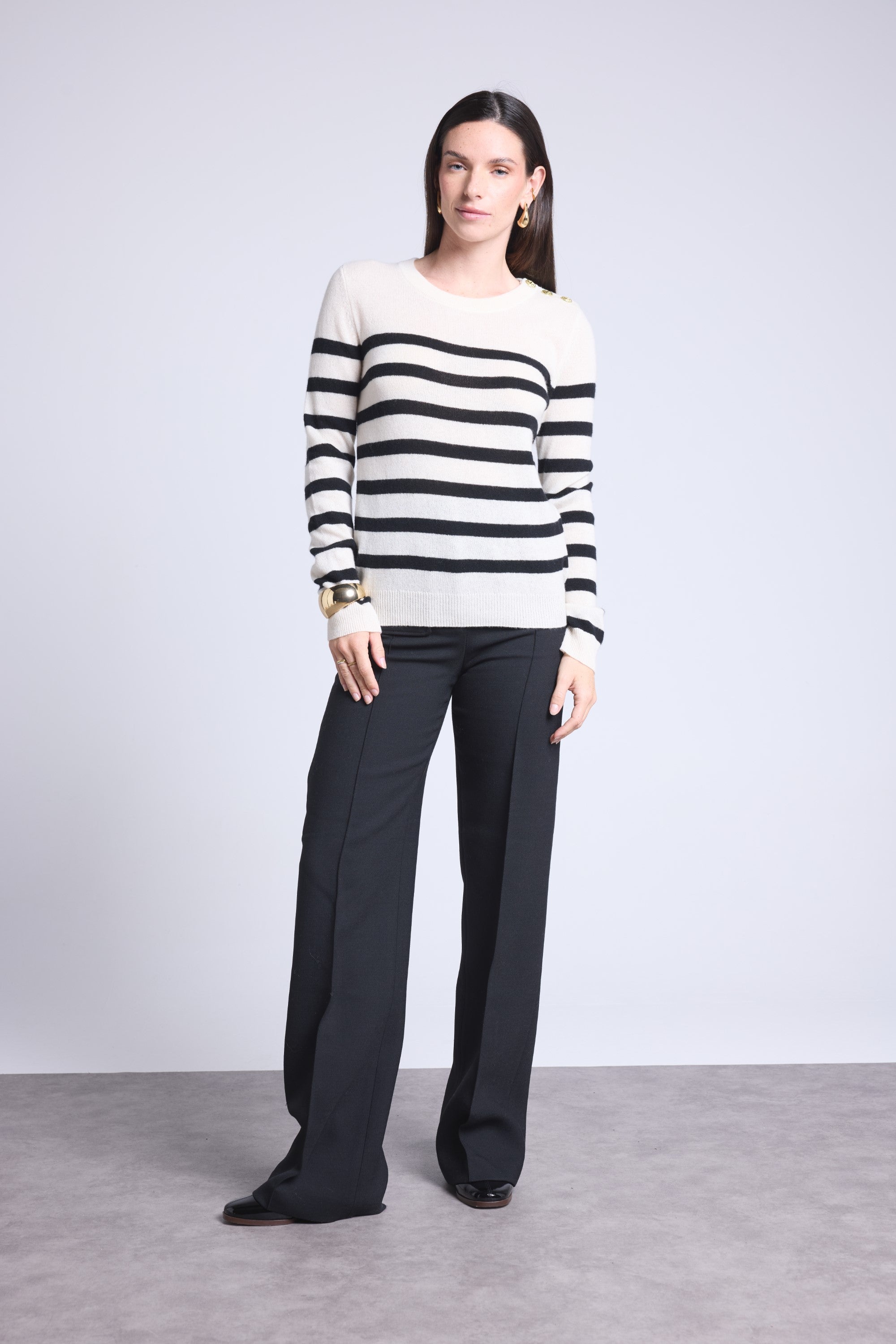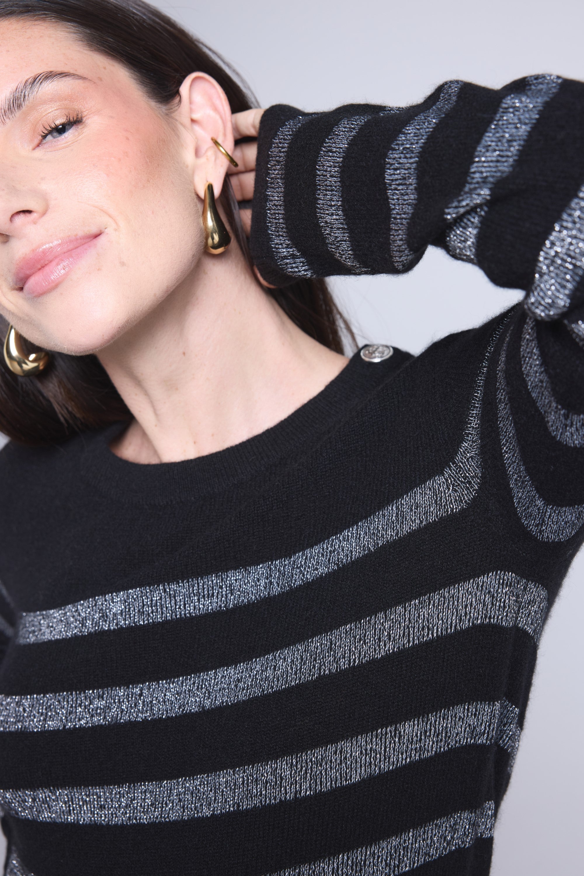 Un esprit marin revisité avec une touche chic : des rayures fines et équilibrées. sublimées par une patte épaule ornée de trois boutons. Une pièce à la fois raffinée et intemporelle, parfaite pour rehausser une silhouette simple avec élégance.