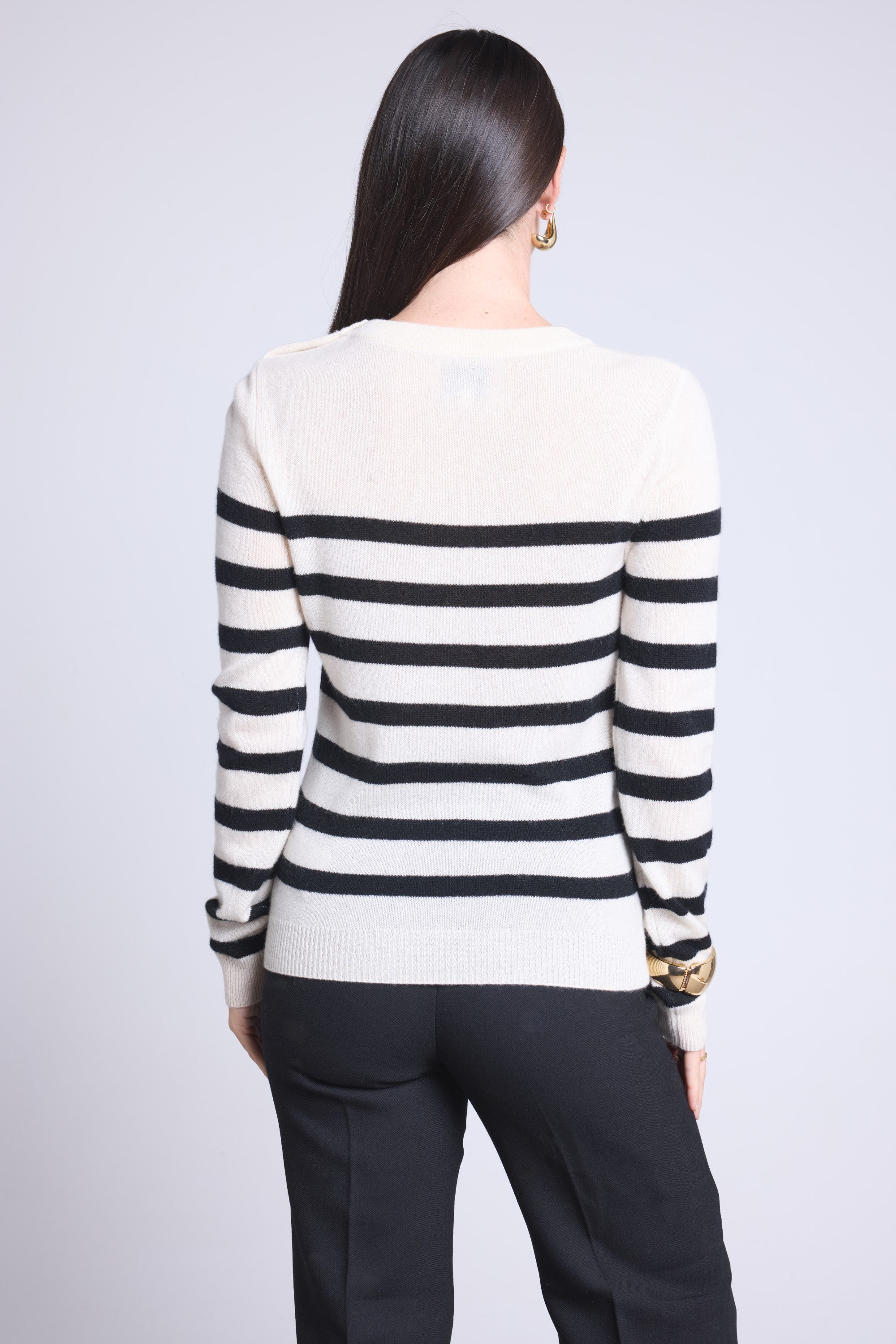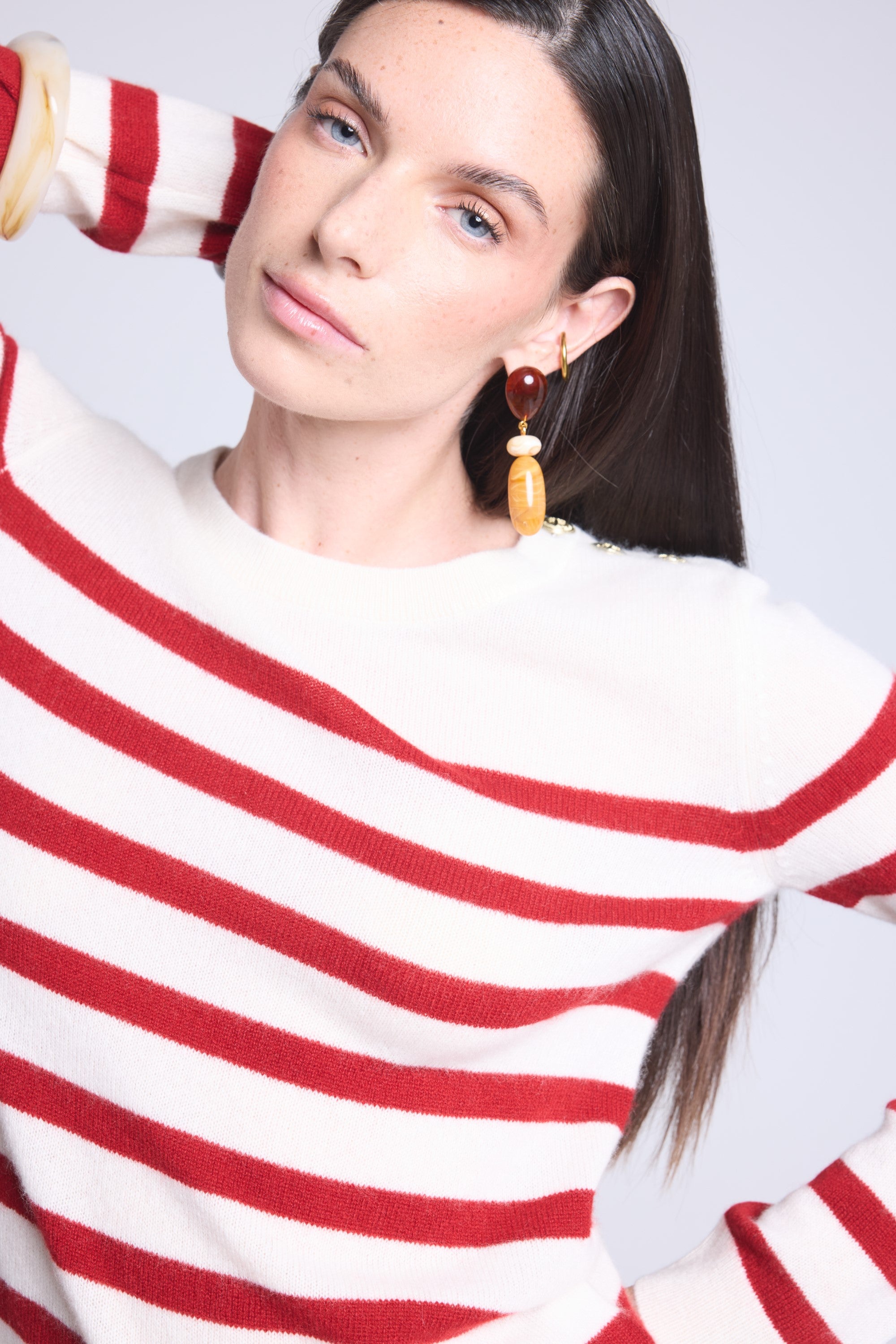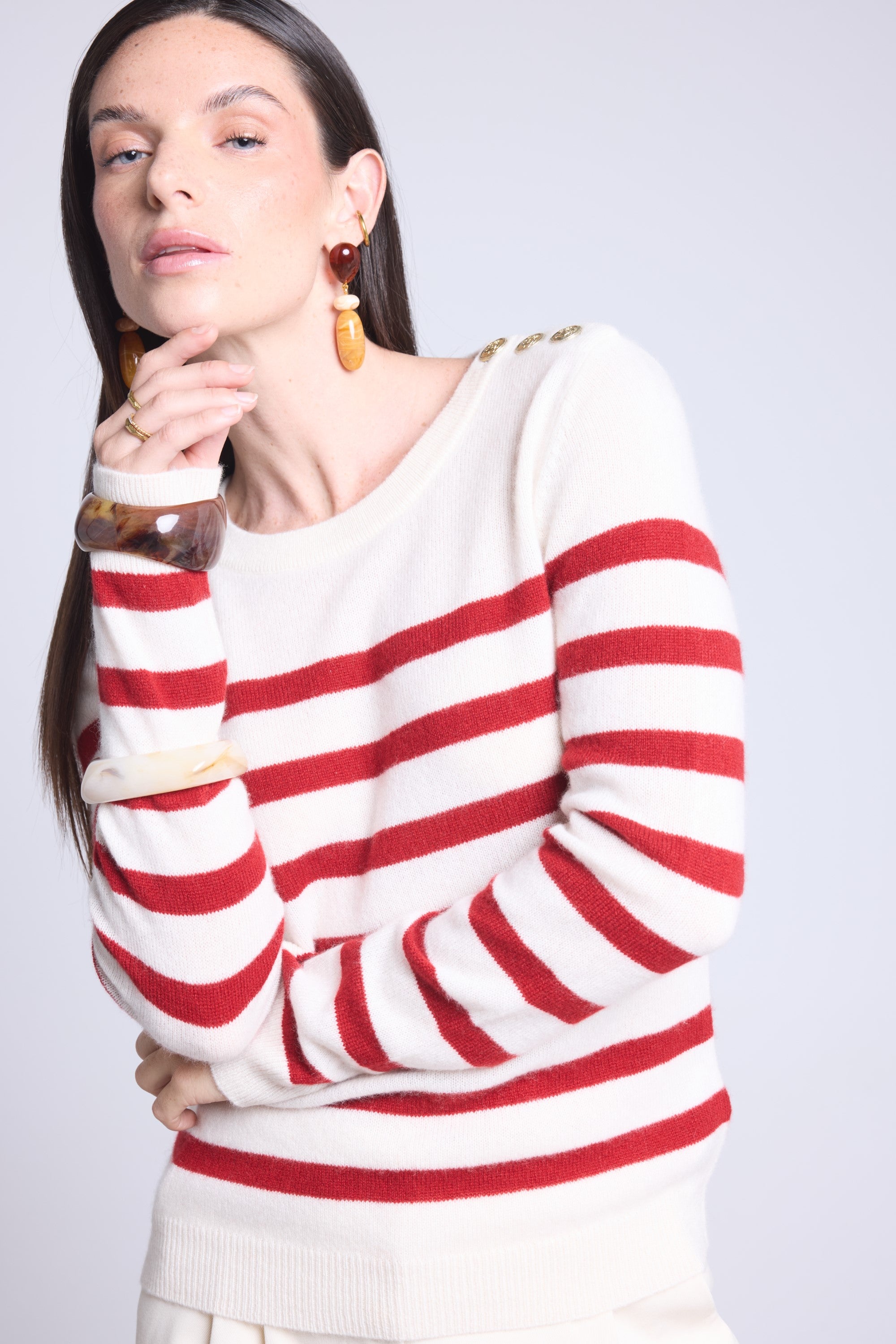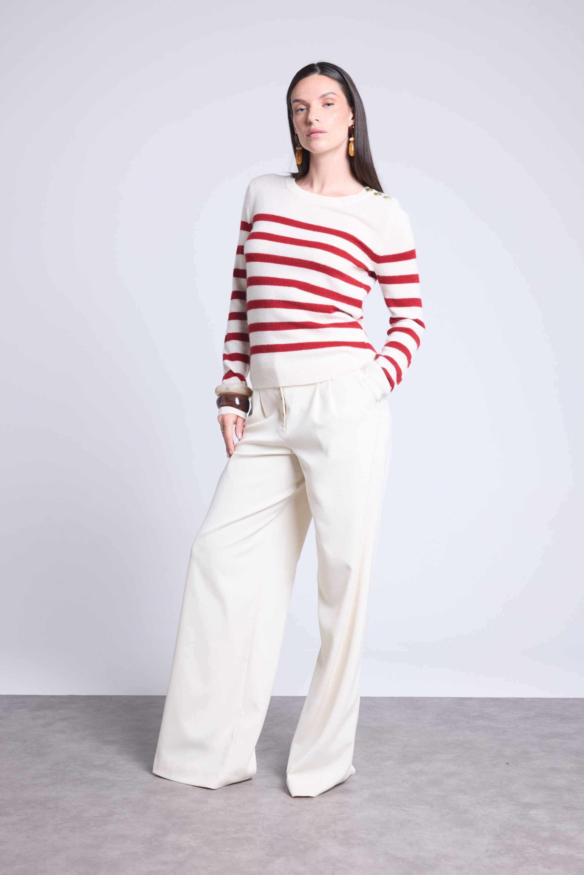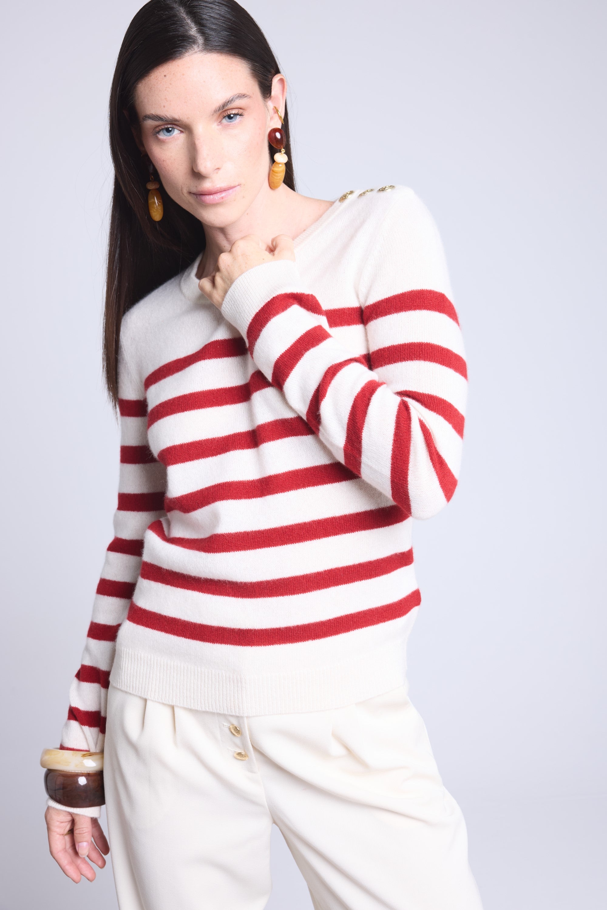 Un esprit marin revisité avec une touche chic : des rayures fines et équilibrées. sublimées par une patte épaule ornée de trois boutons. Une pièce à la fois raffinée et intemporelle, parfaite pour rehausser une silhouette simple avec élégance.