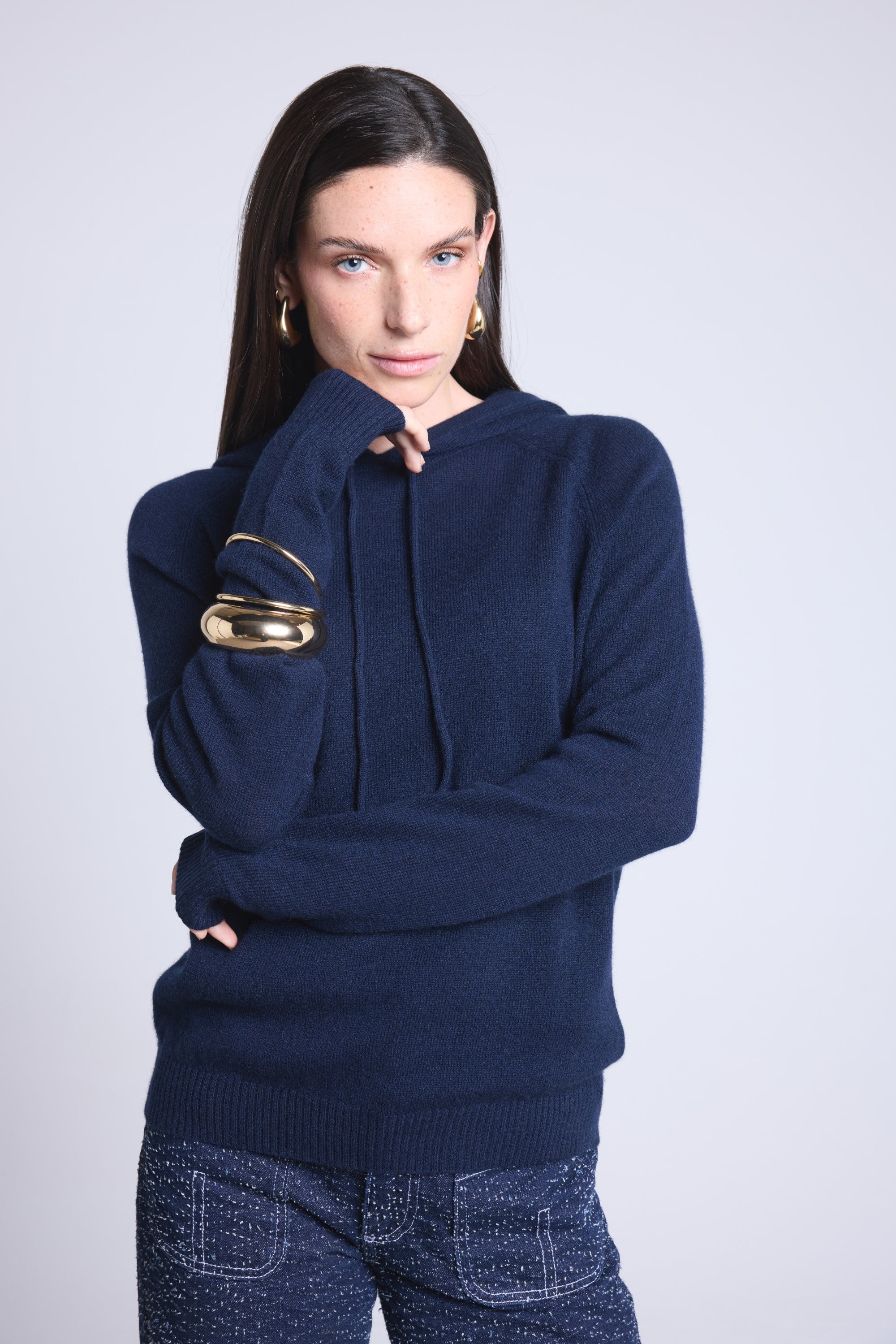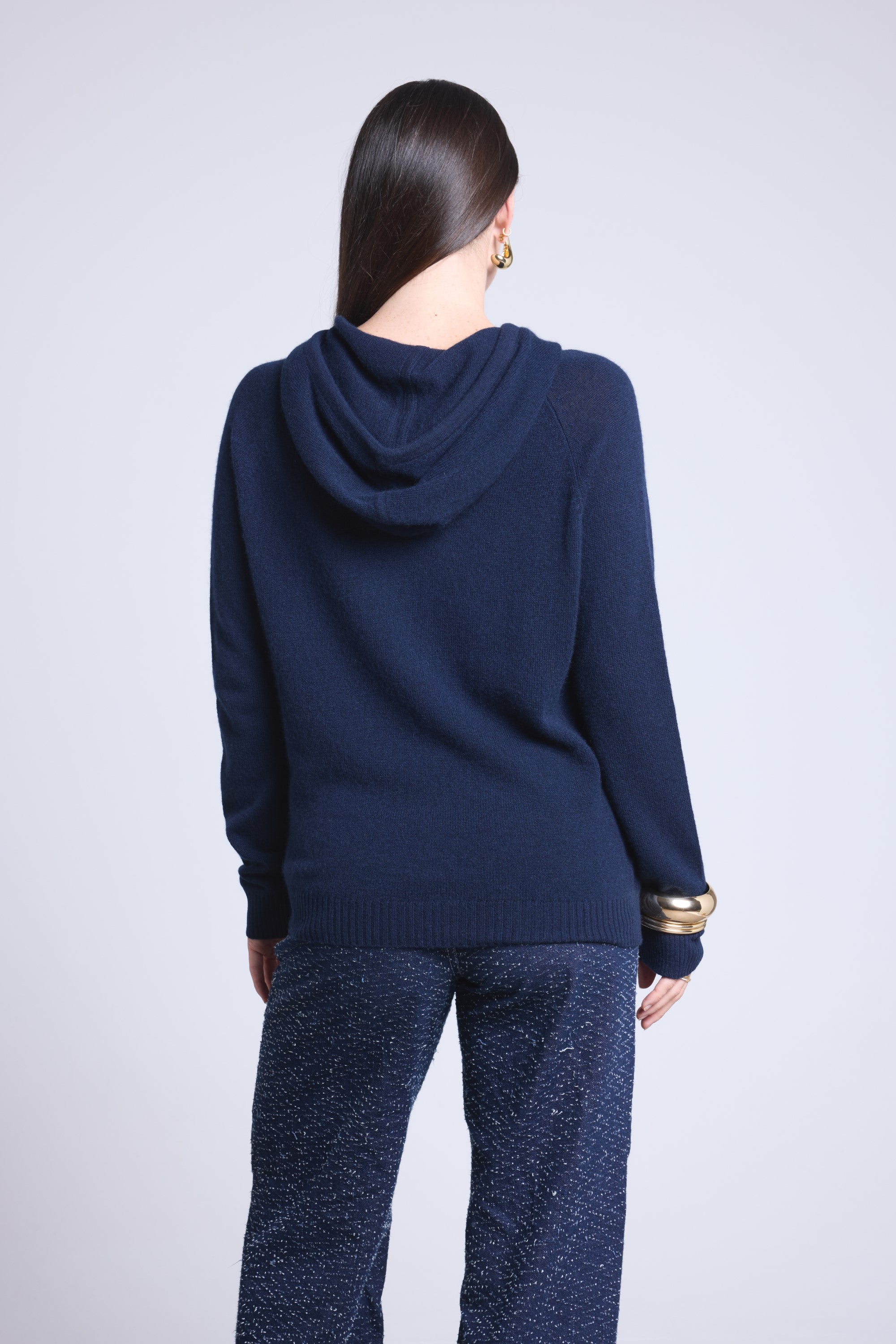 Pull sweat à capuche en 100% cachemire, tricoté en 2 fils, jauge 12GG, alliant chaleur, douceur et confort absolu.