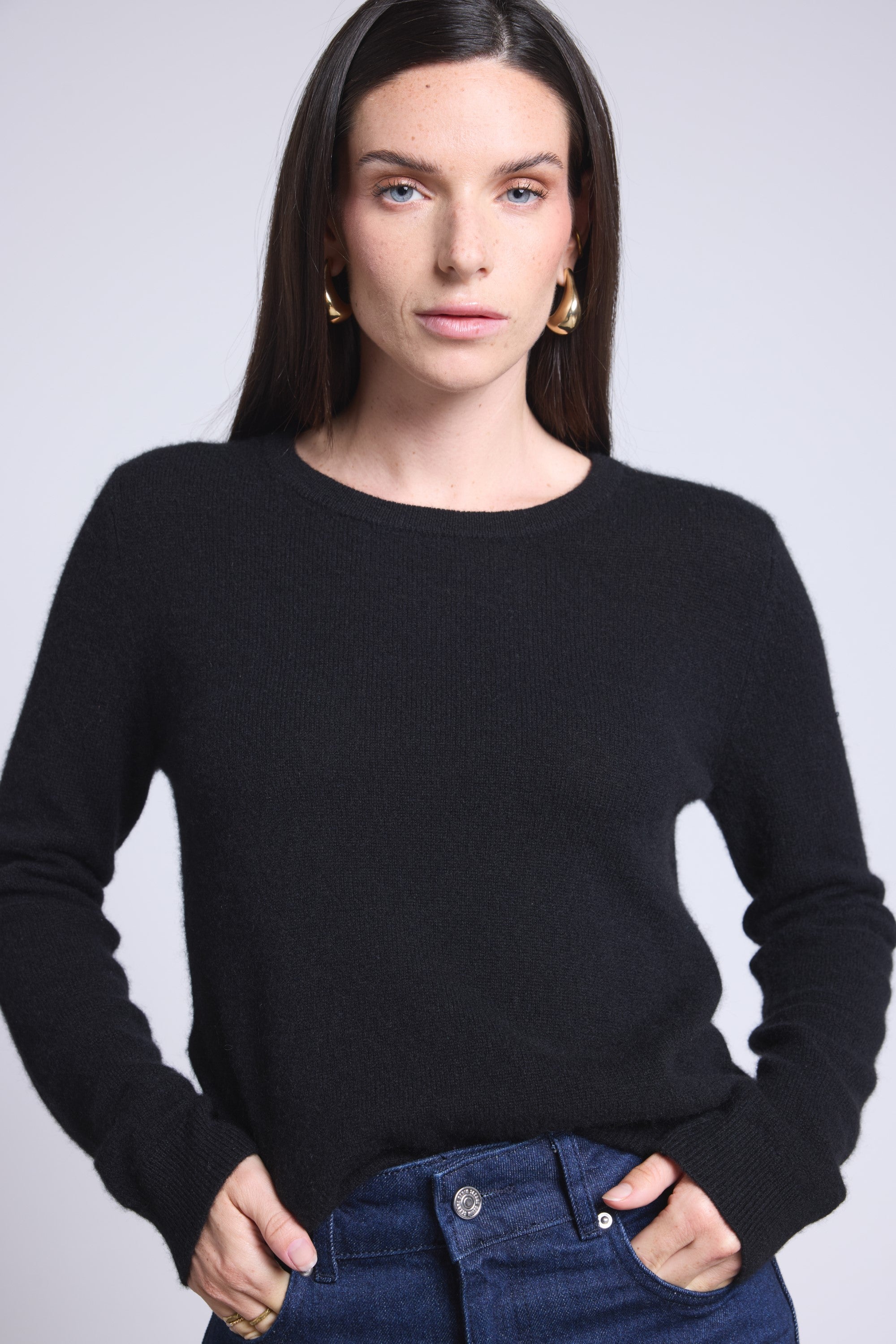 Ce pull col rond, en cachemire double fil, incarne la simplicité sophistiquée. Avec sa coupe légèrement ajustée et son col rond parfaitement dessiné, il se glisse aussi bien sous une veste tailleur qu’il se porte à même la peau, pour une allure élégante et sans effort.