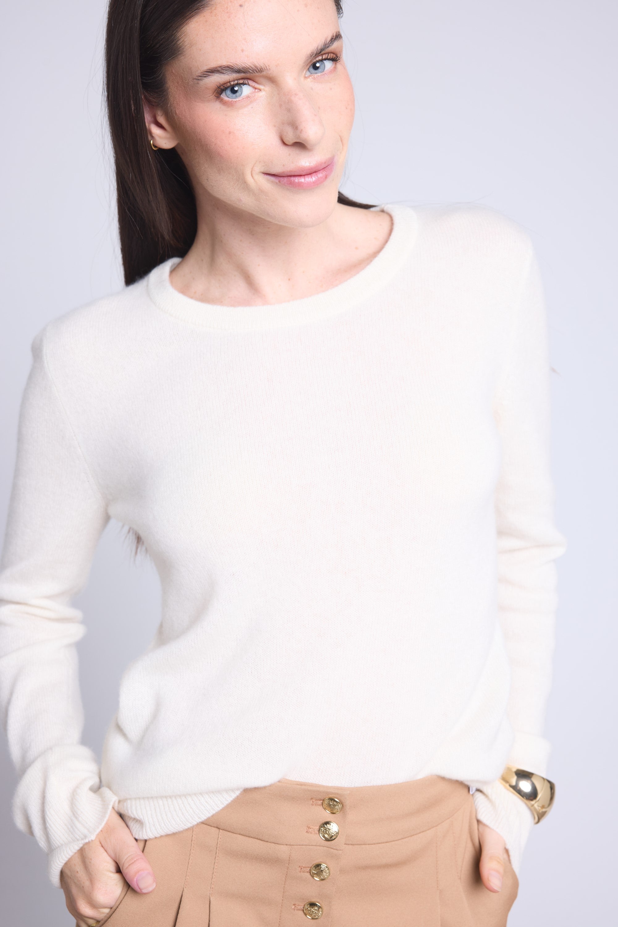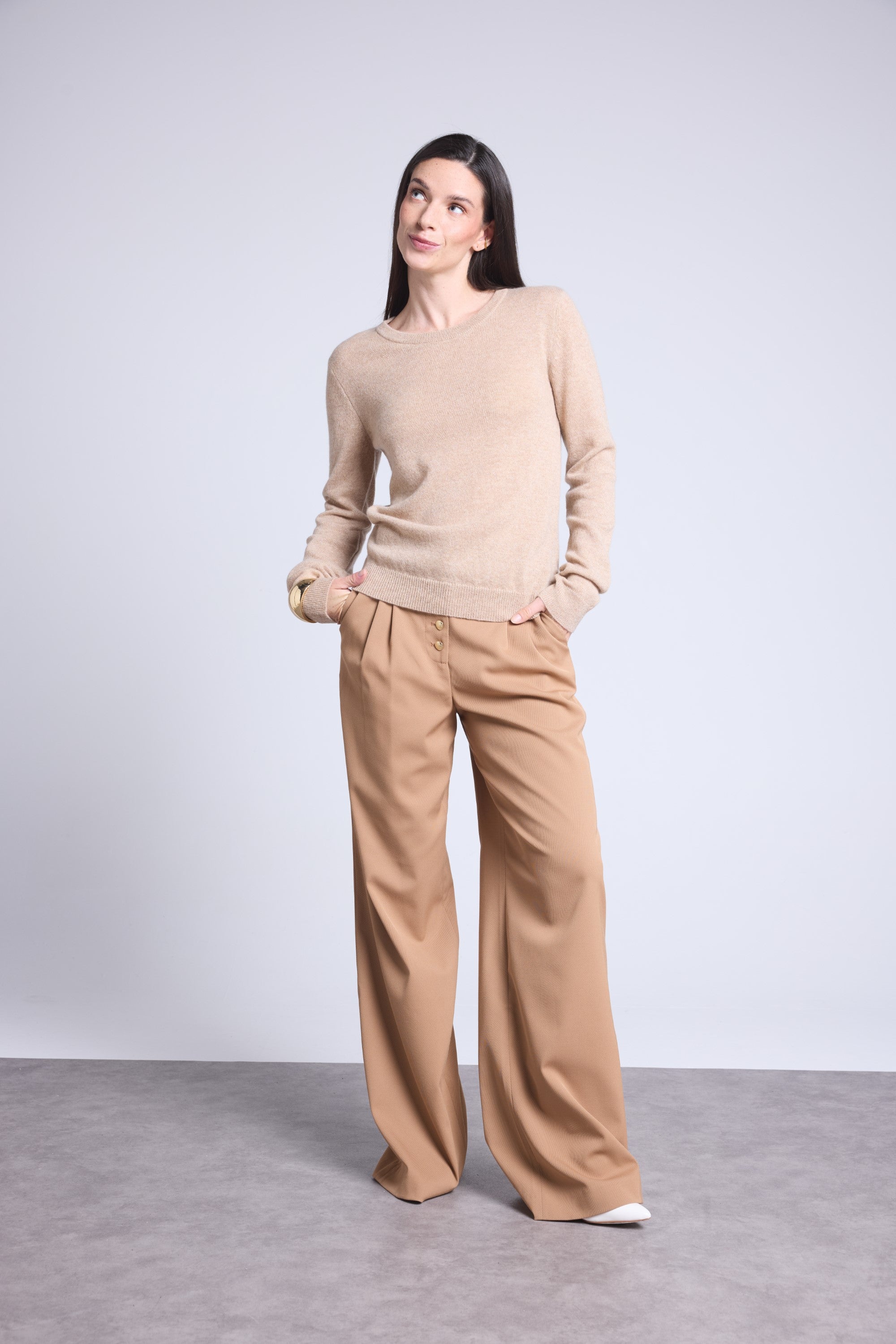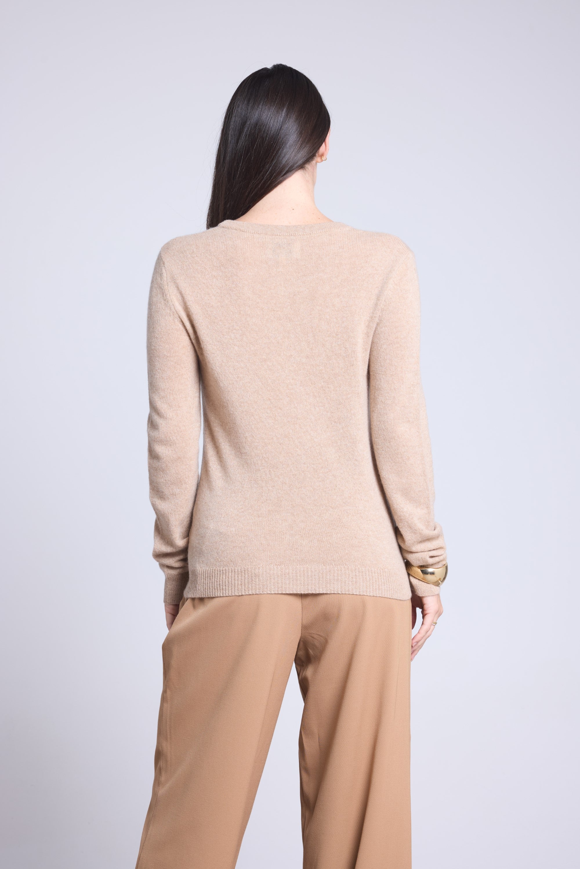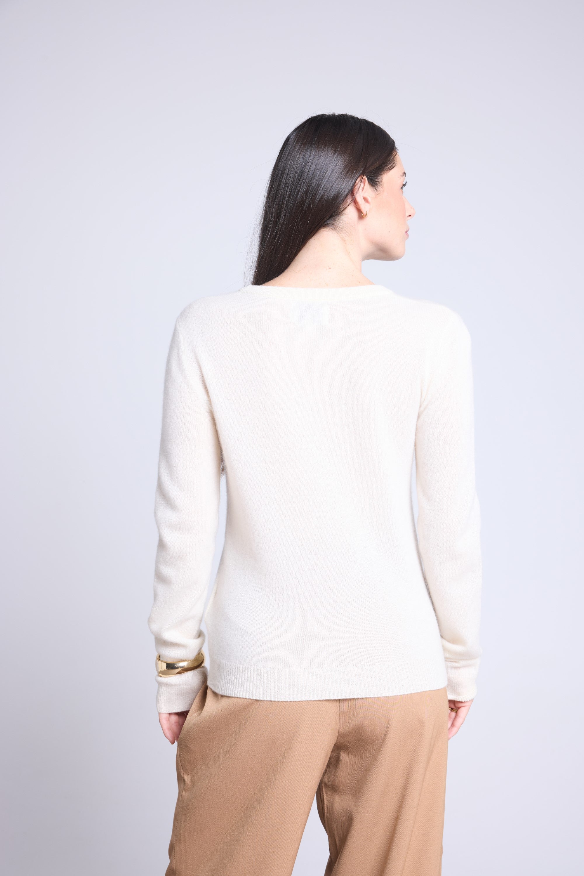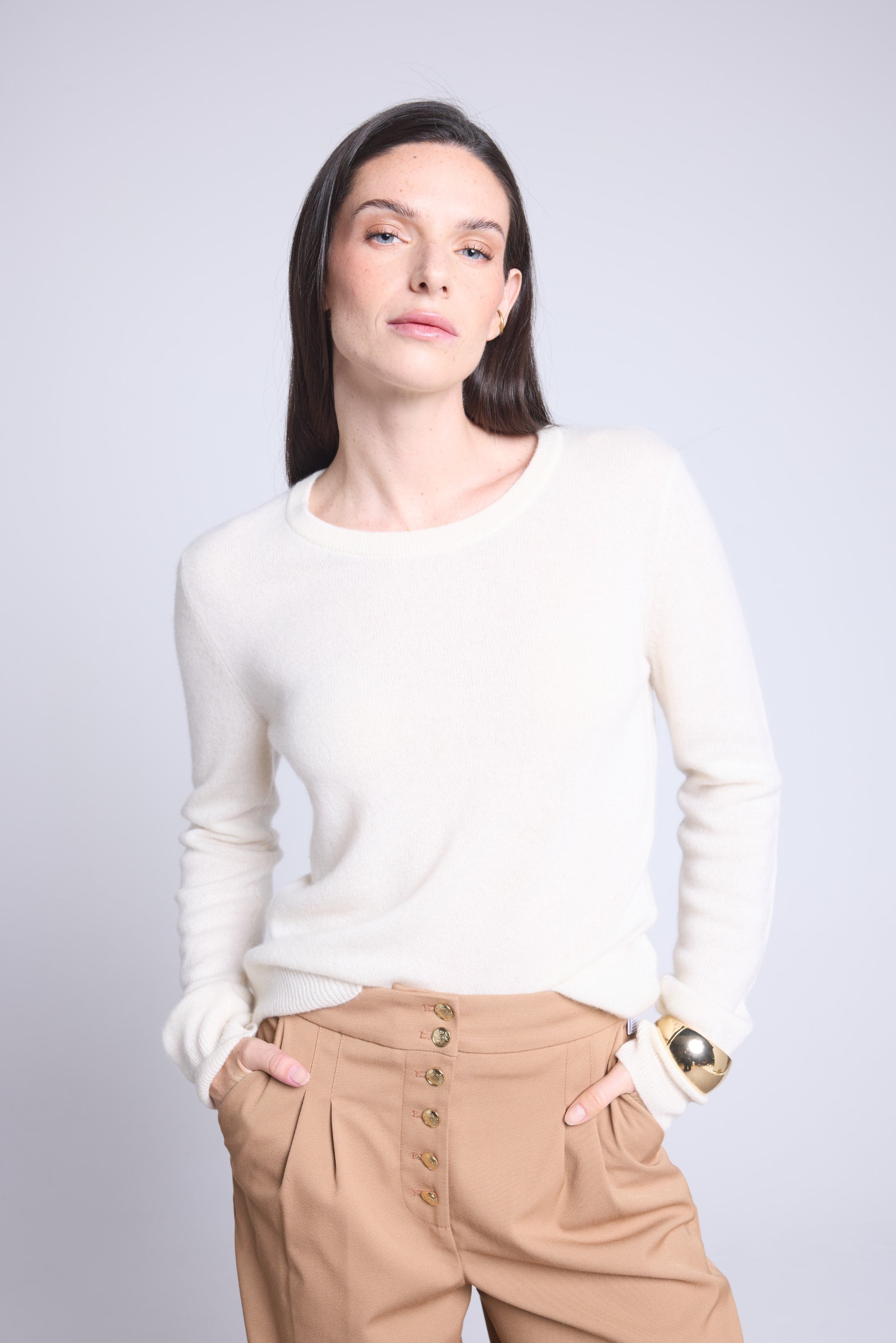 Ce pull col rond, en cachemire double fil, incarne la simplicité sophistiquée. Avec sa coupe légèrement ajustée et son col rond parfaitement dessiné, il se glisse aussi bien sous une veste tailleur qu’il se porte à même la peau, pour une allure élégante et sans effort.