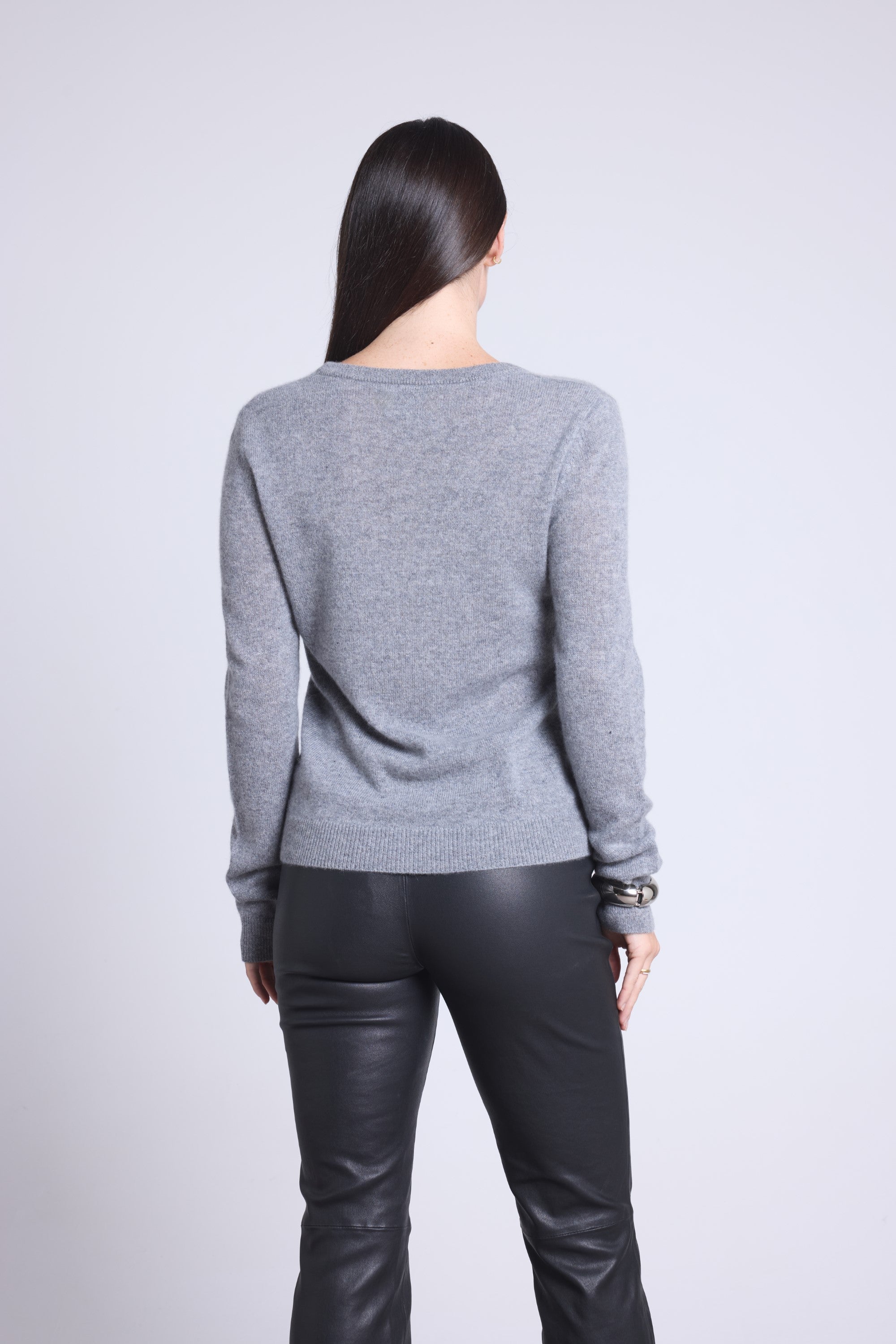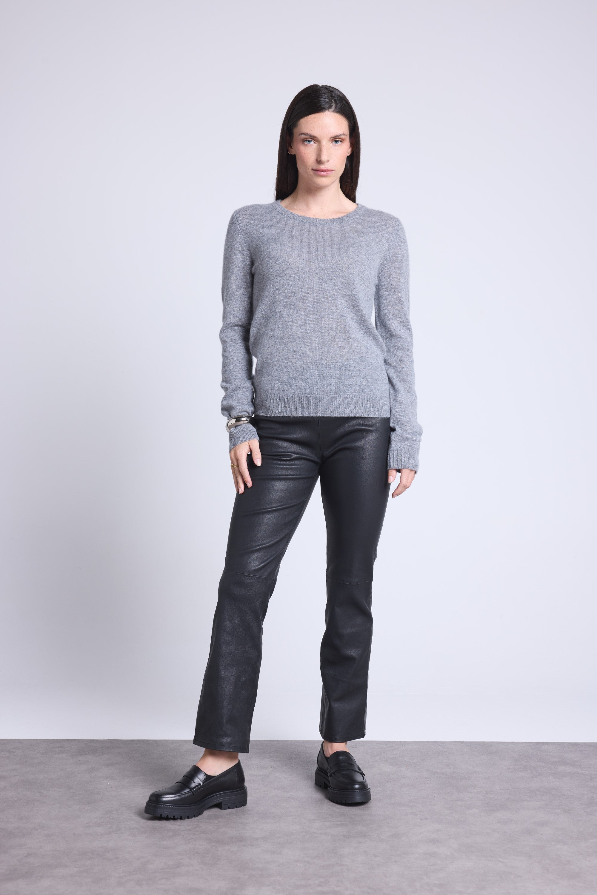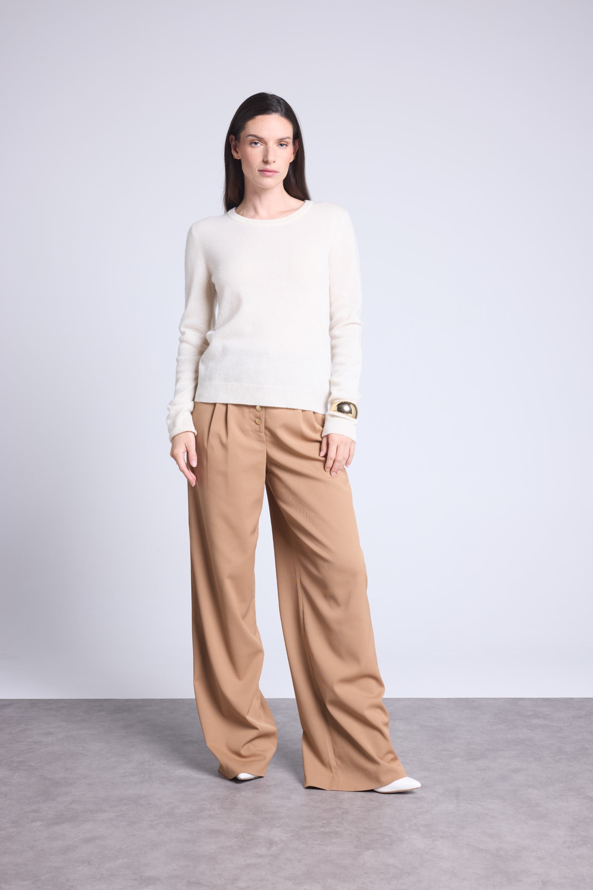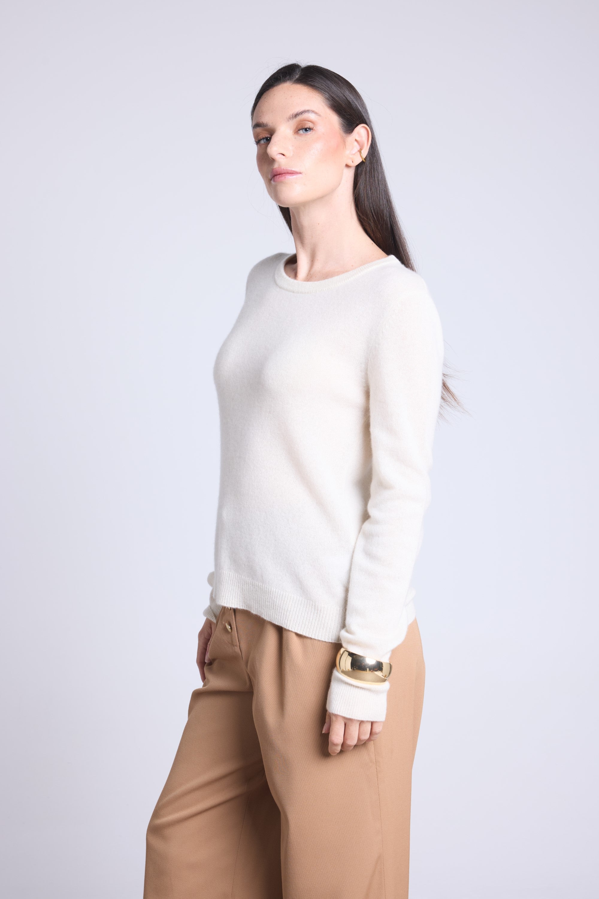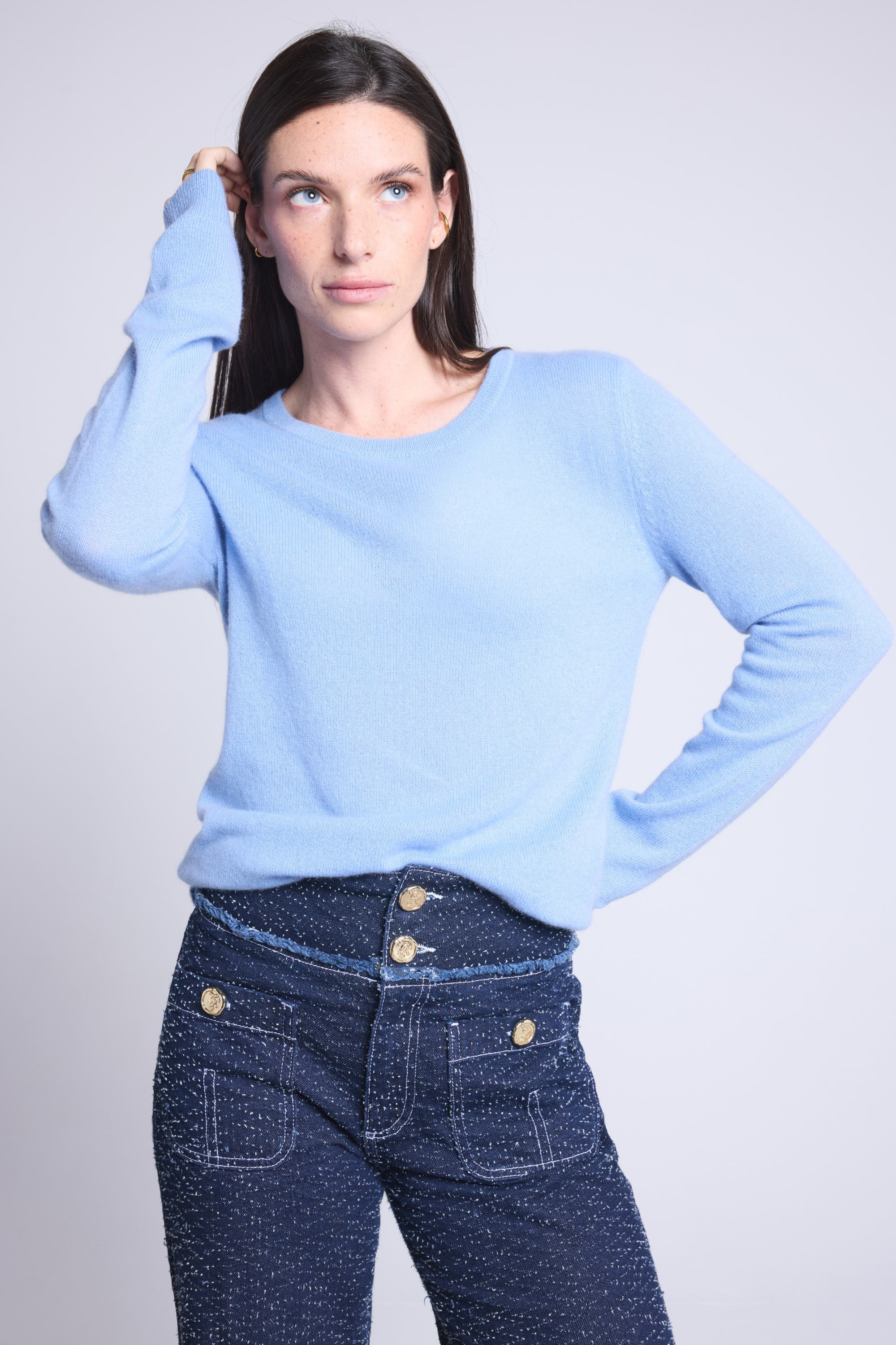 Ce pull col rond, en cachemire double fil, incarne la simplicité sophistiquée. Avec sa coupe légèrement ajustée et son col rond parfaitement dessiné, il se glisse aussi bien sous une veste tailleur qu’il se porte à même la peau, pour une allure élégante et sans effort.