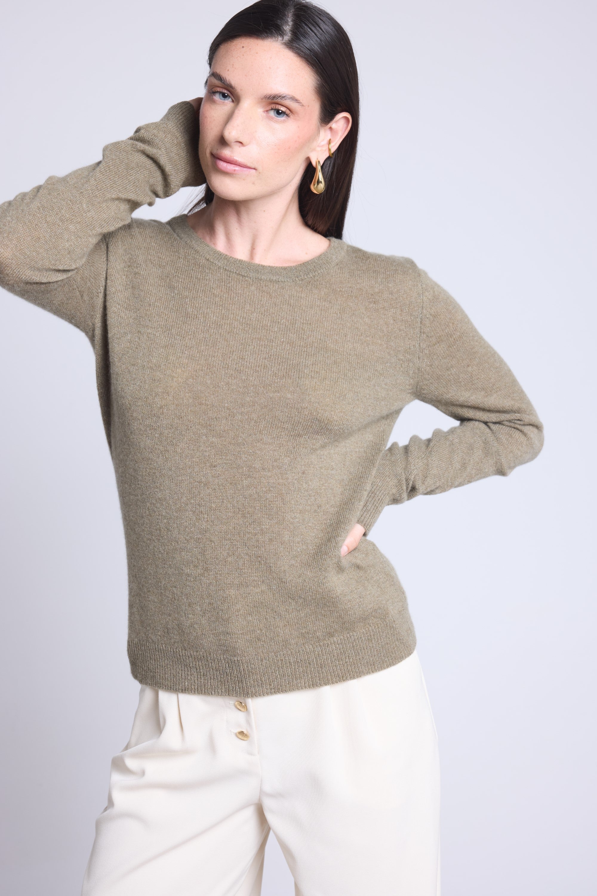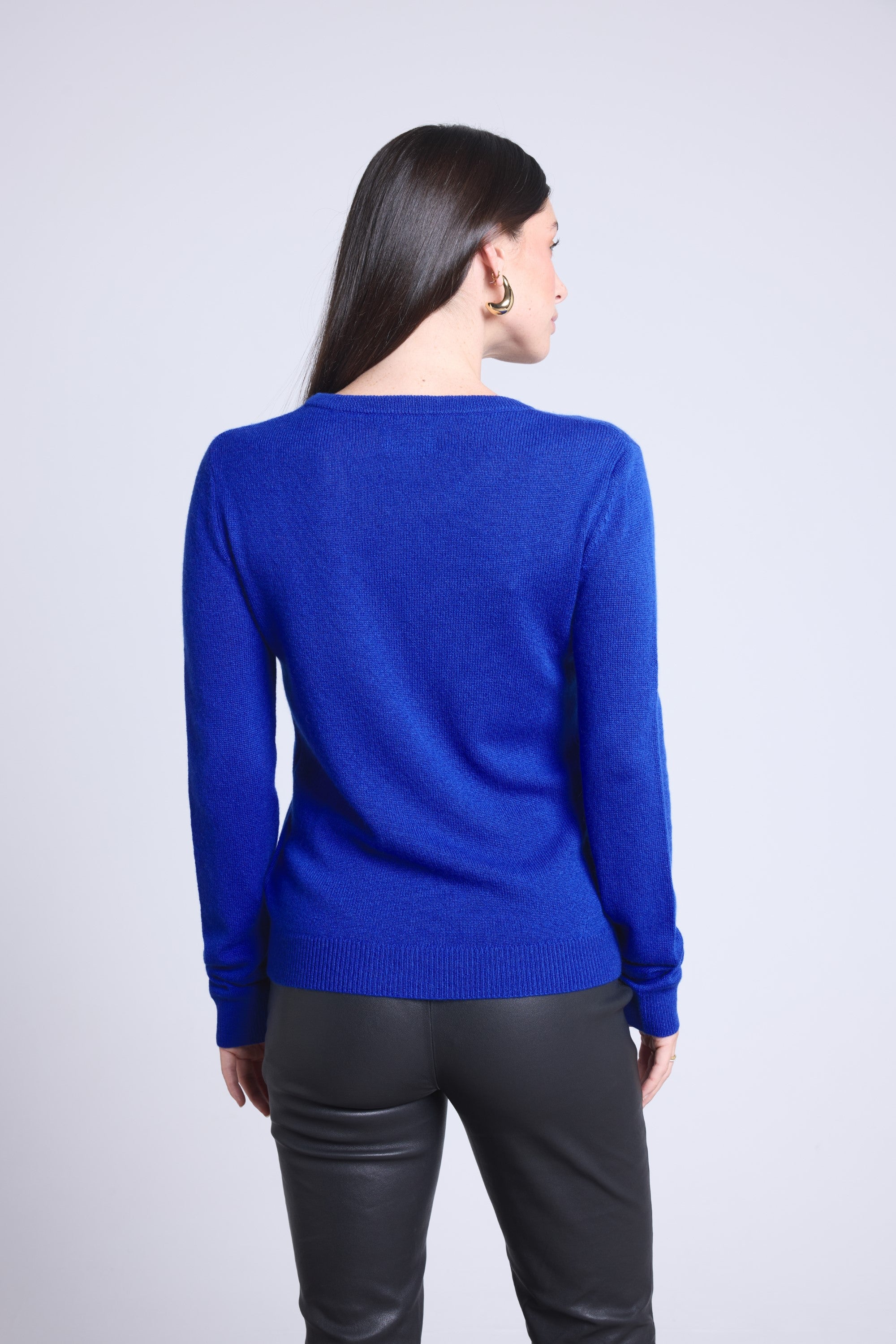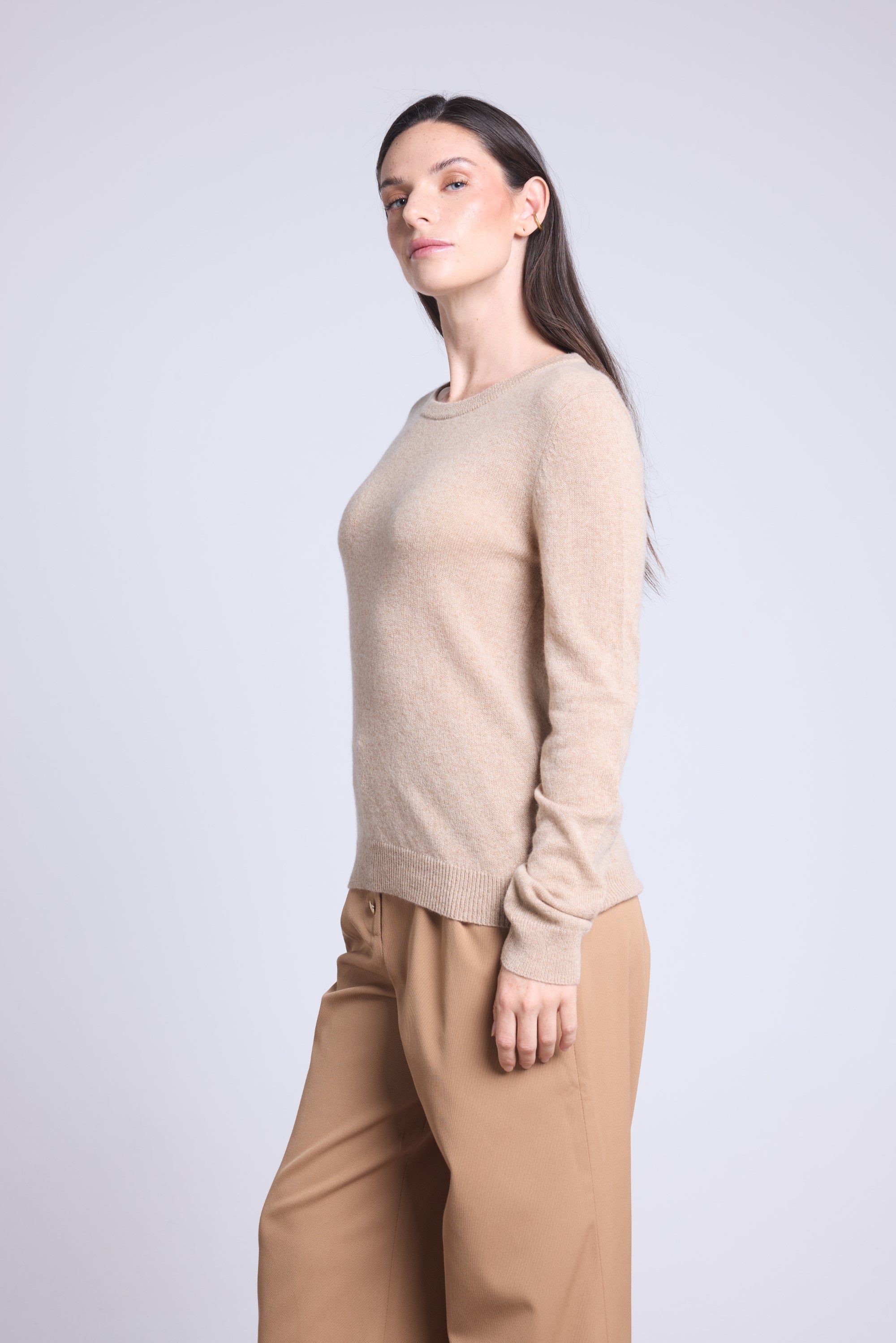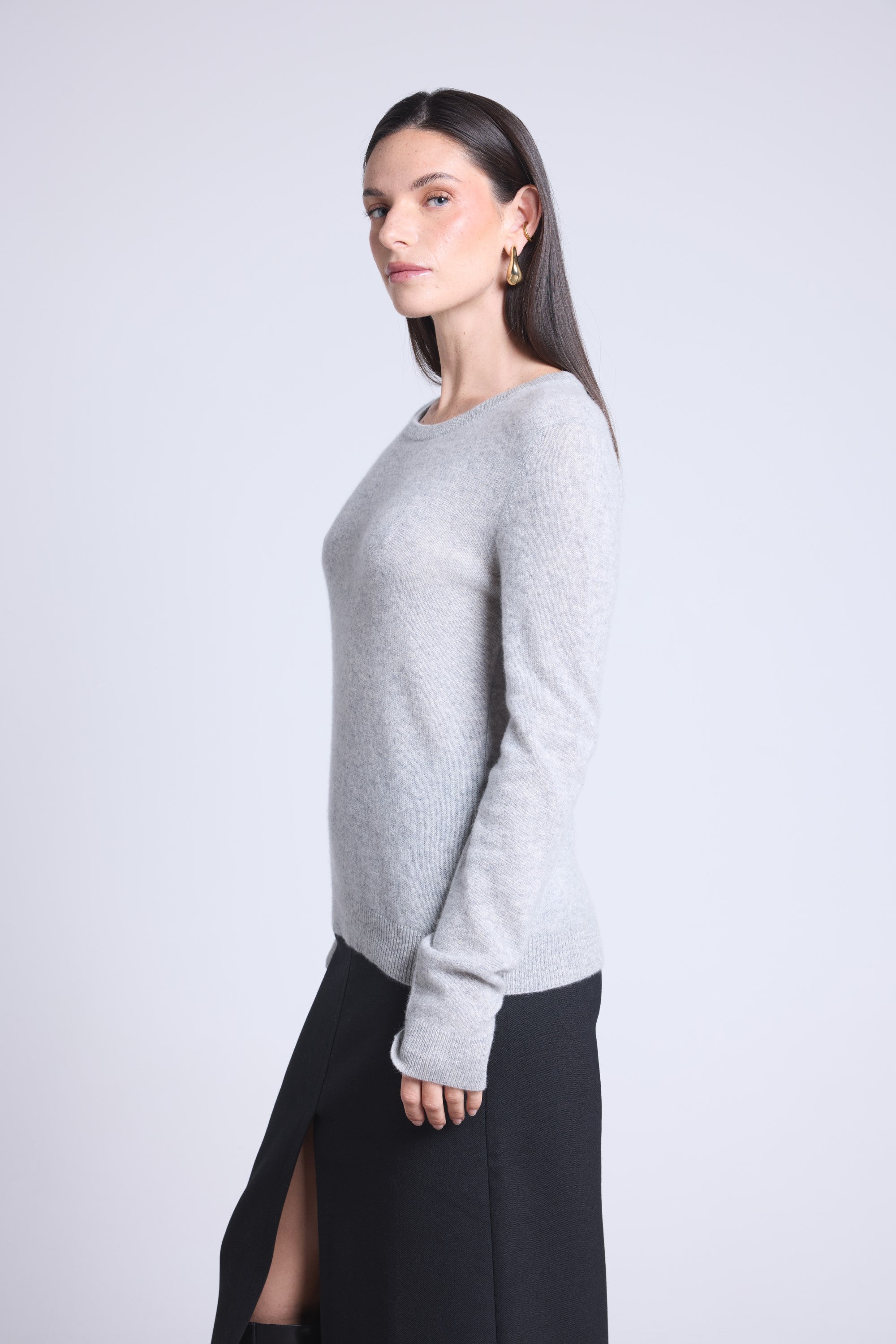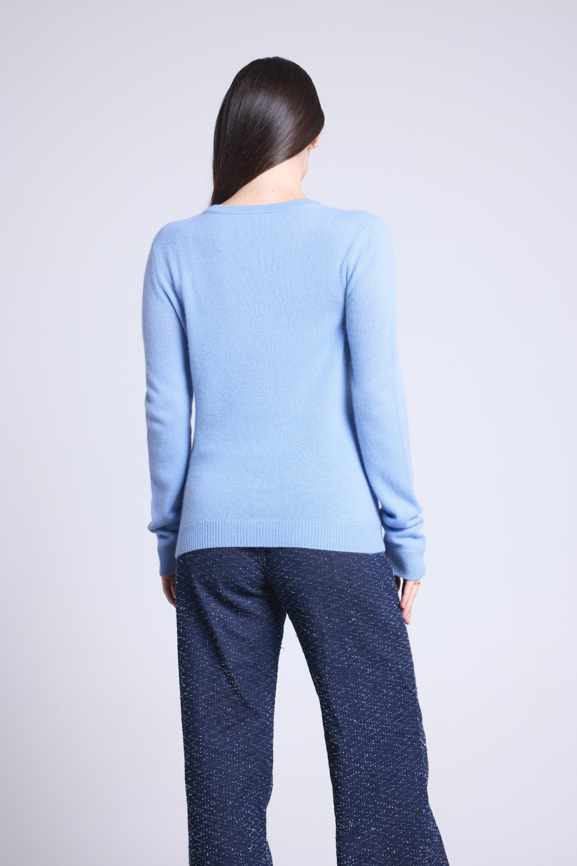 Ce pull col rond, en cachemire double fil, incarne la simplicité sophistiquée. Avec sa coupe légèrement ajustée et son col rond parfaitement dessiné, il se glisse aussi bien sous une veste tailleur qu’il se porte à même la peau, pour une allure élégante et sans effort.