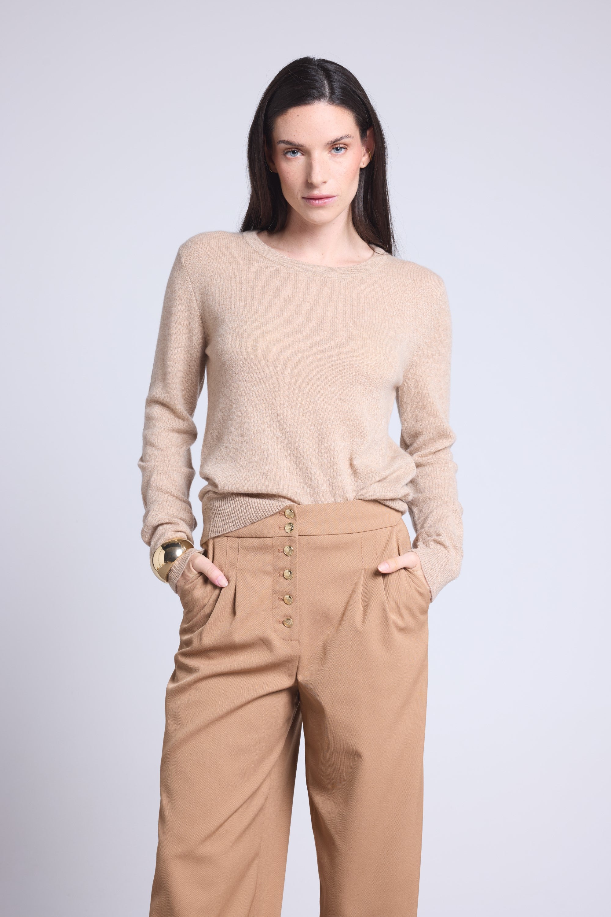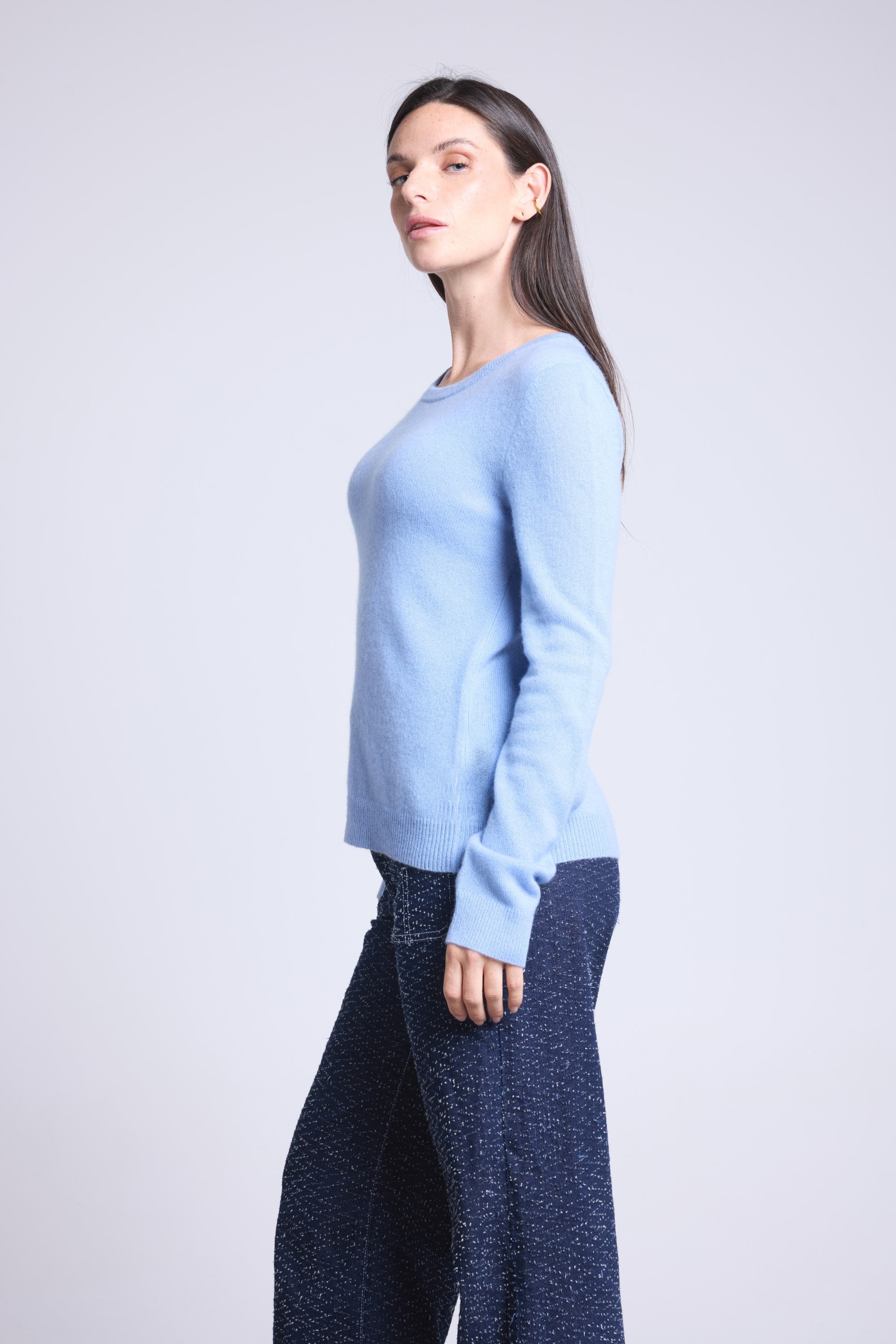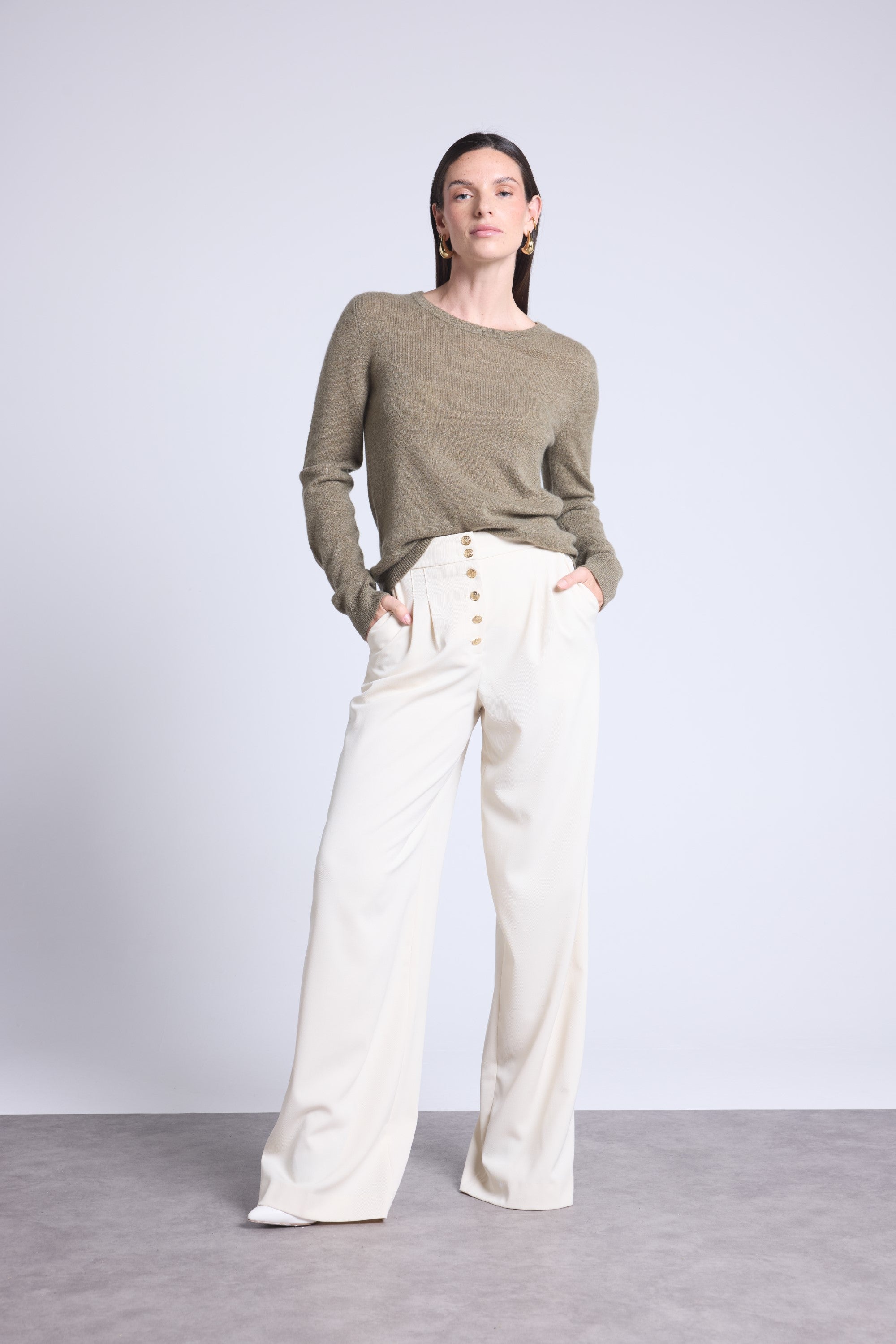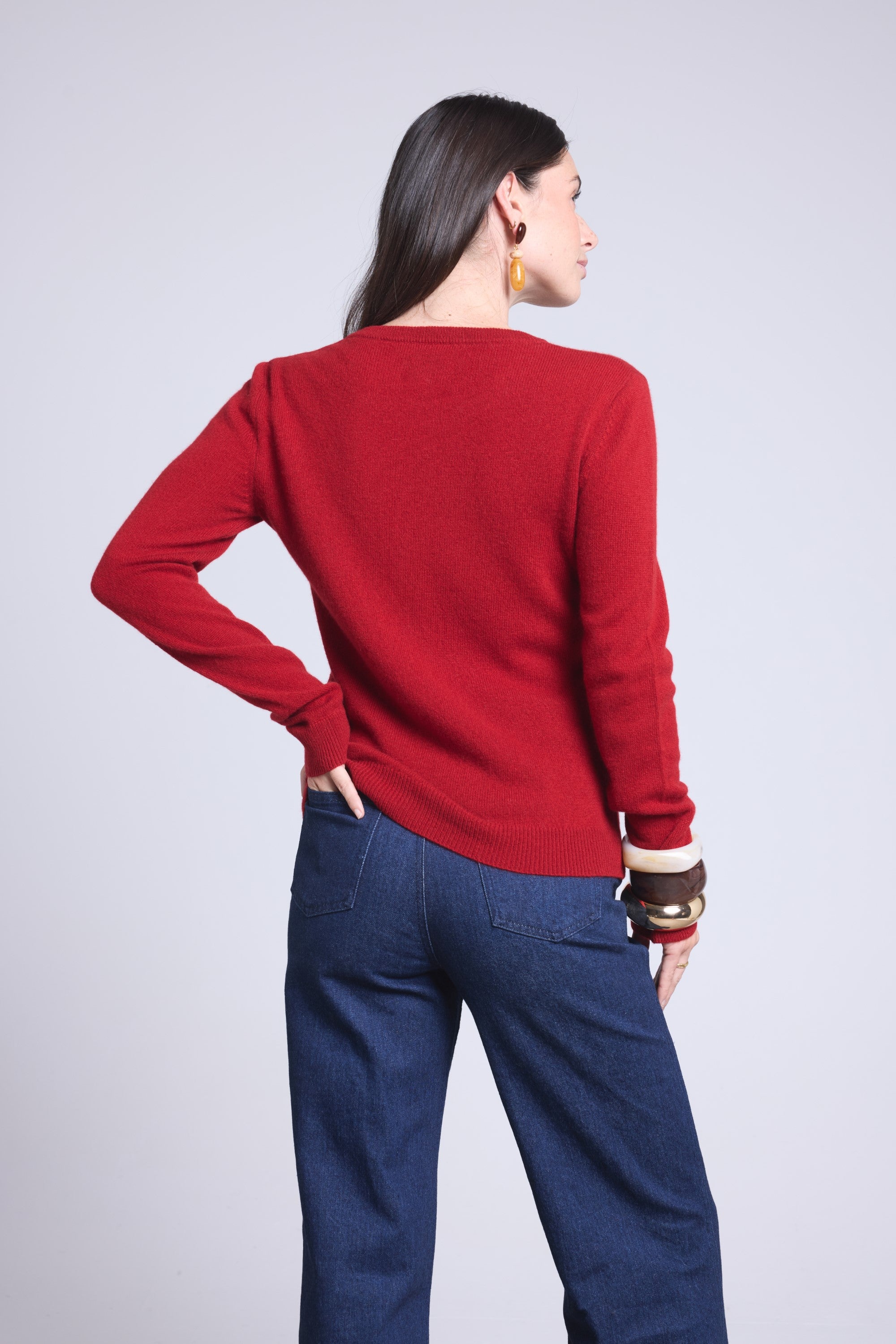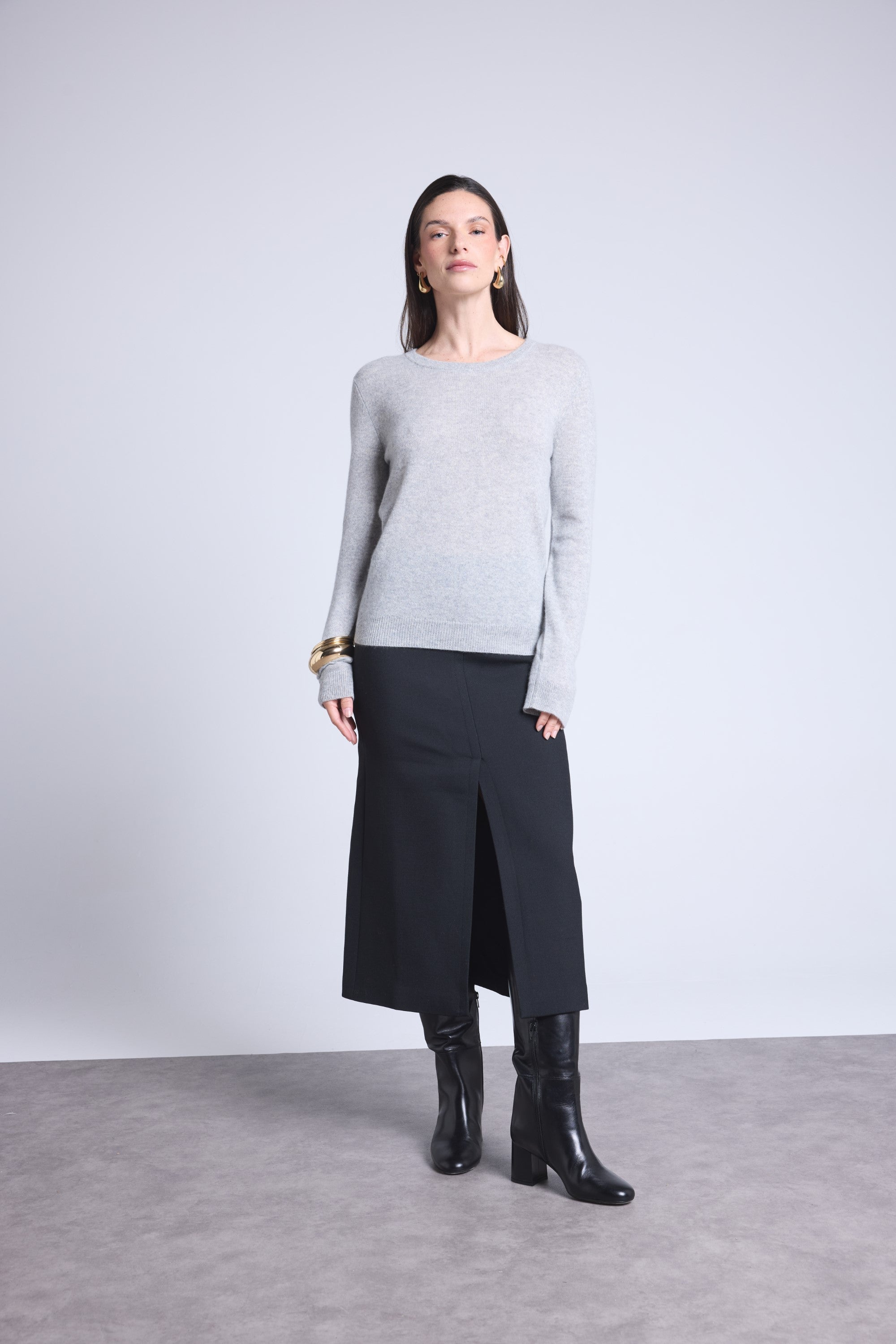 Ce pull col rond, en cachemire double fil, incarne la simplicité sophistiquée. Avec sa coupe légèrement ajustée et son col rond parfaitement dessiné, il se glisse aussi bien sous une veste tailleur qu’il se porte à même la peau, pour une allure élégante et sans effort.