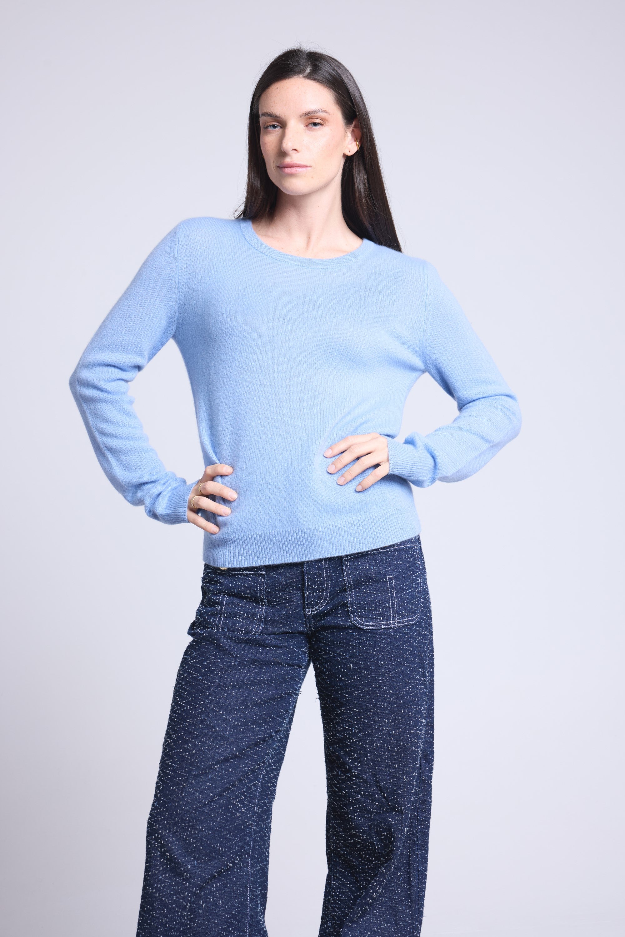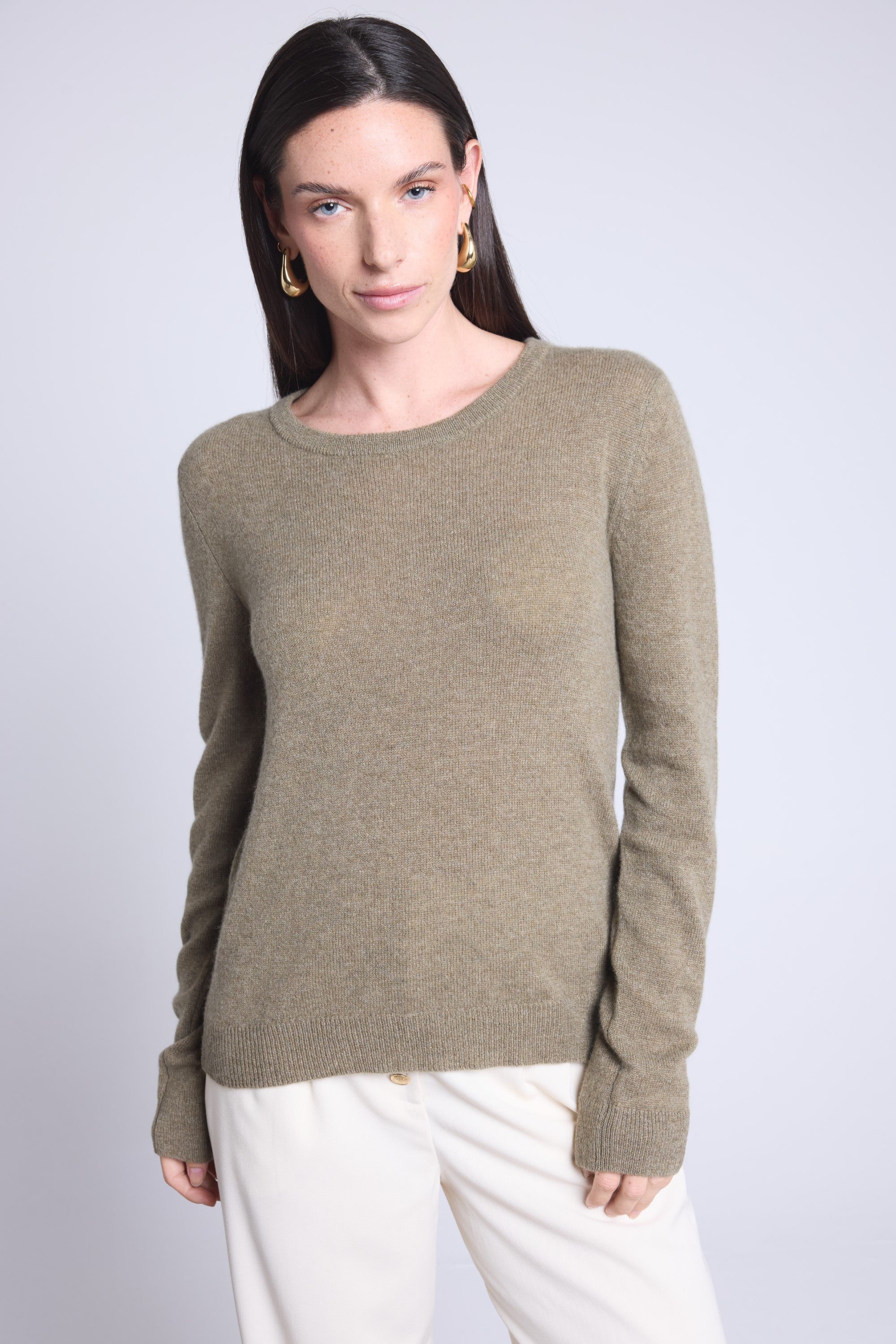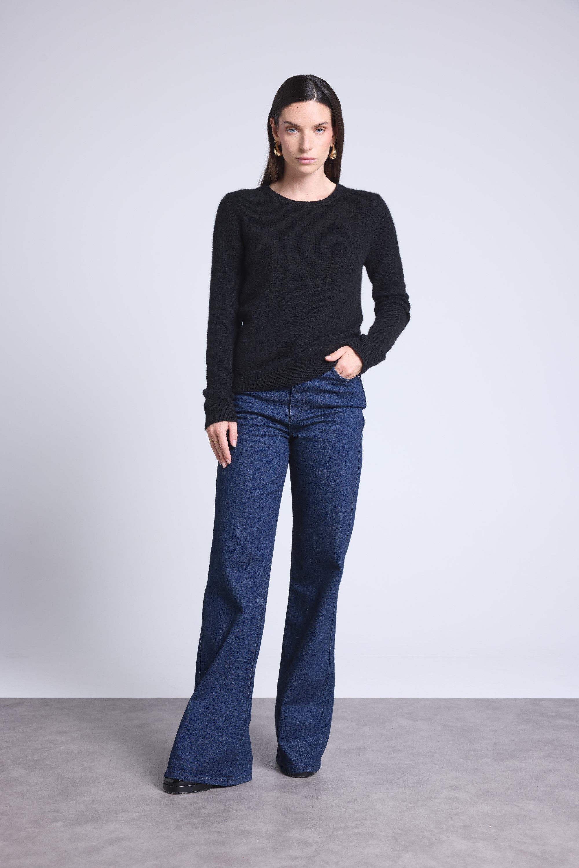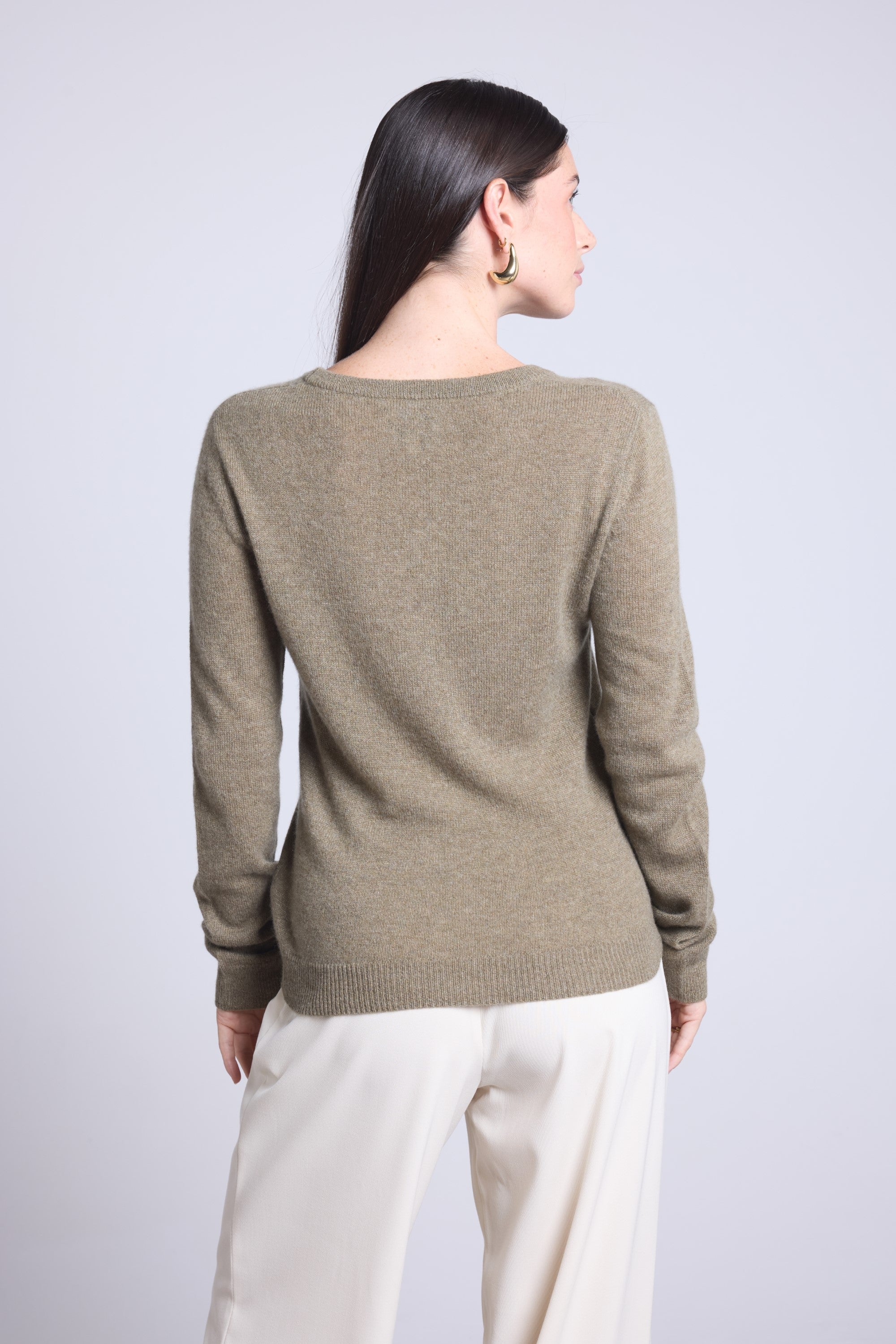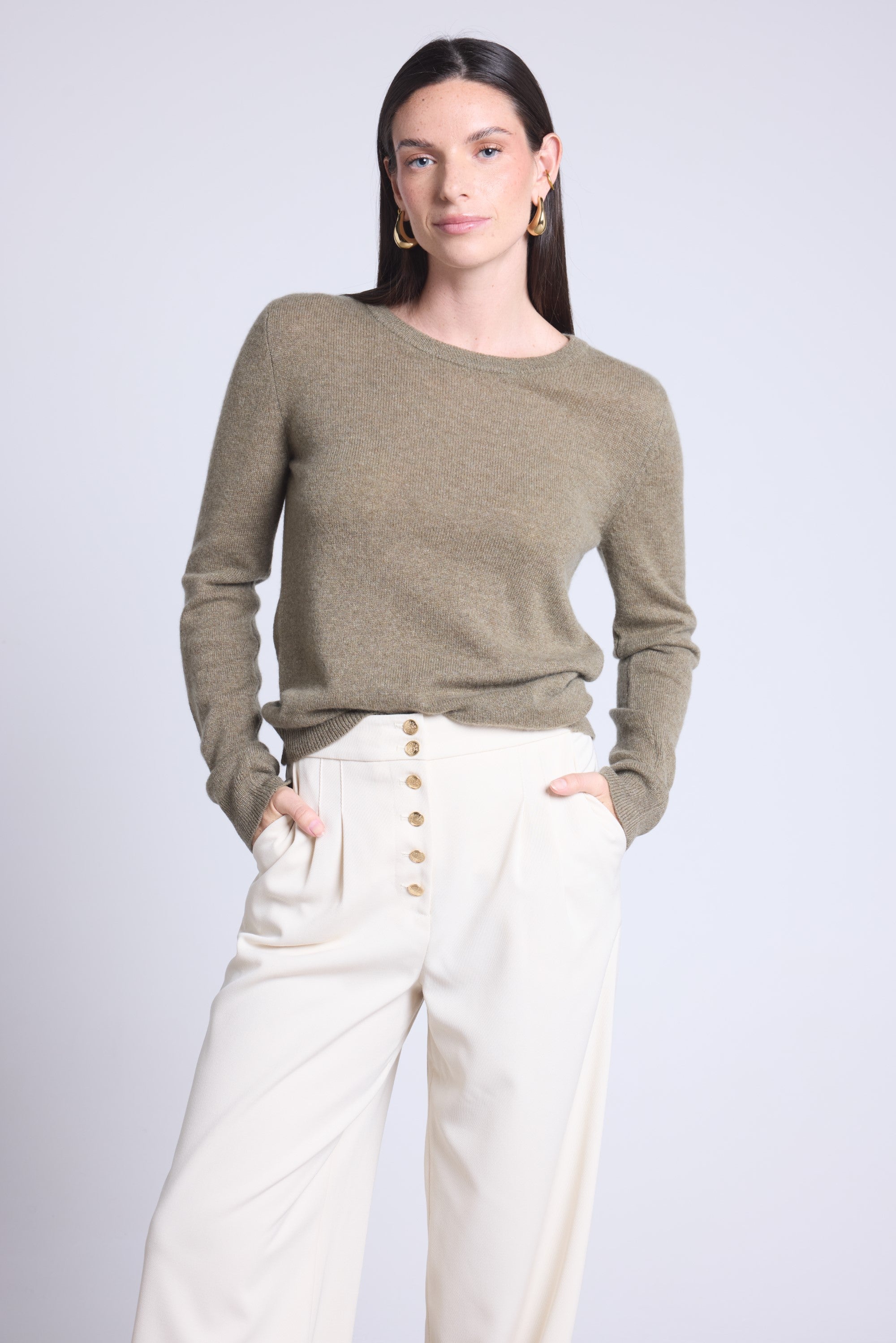 Ce pull col rond, en cachemire double fil, incarne la simplicité sophistiquée. Avec sa coupe légèrement ajustée et son col rond parfaitement dessiné, il se glisse aussi bien sous une veste tailleur qu’il se porte à même la peau, pour une allure élégante et sans effort.