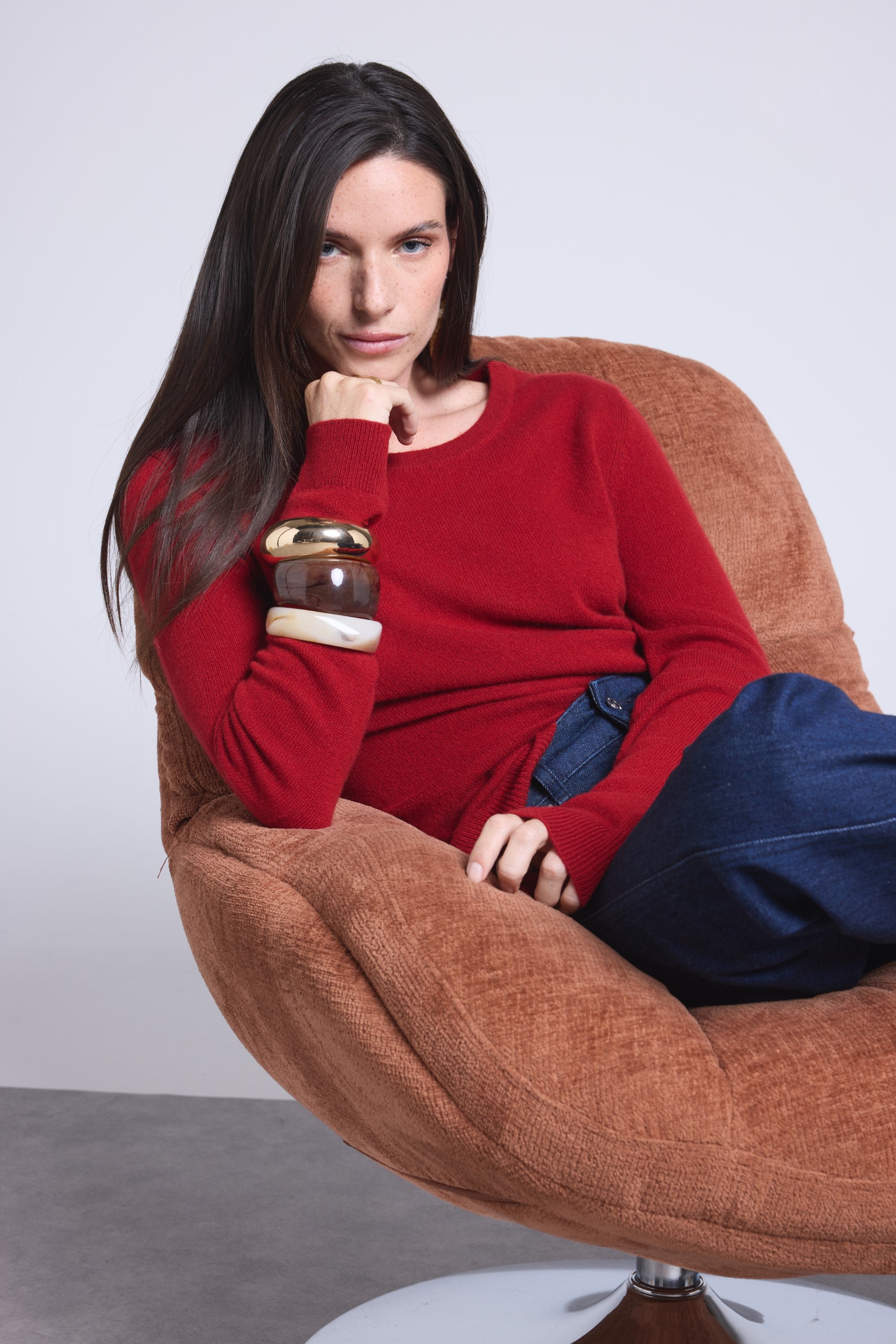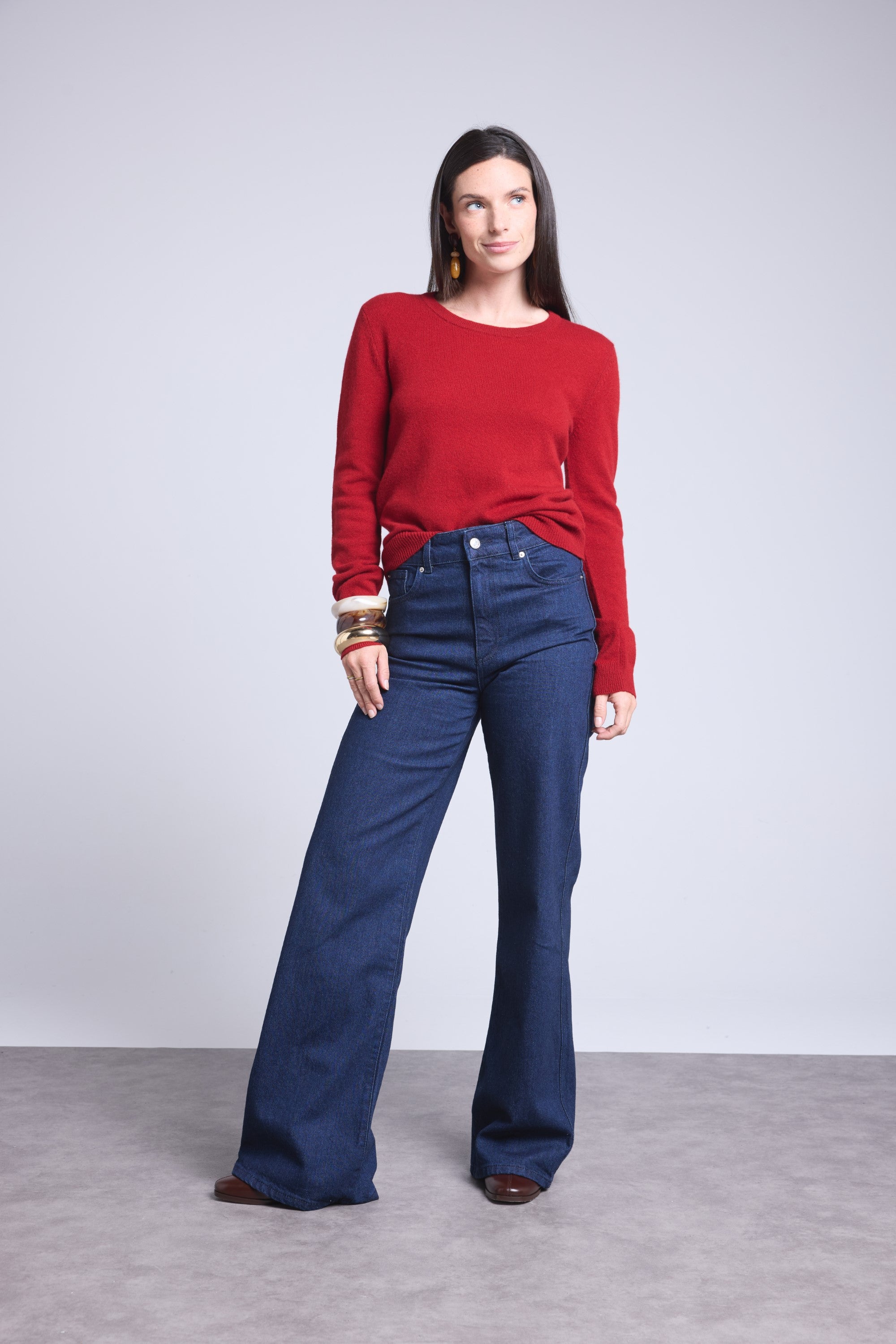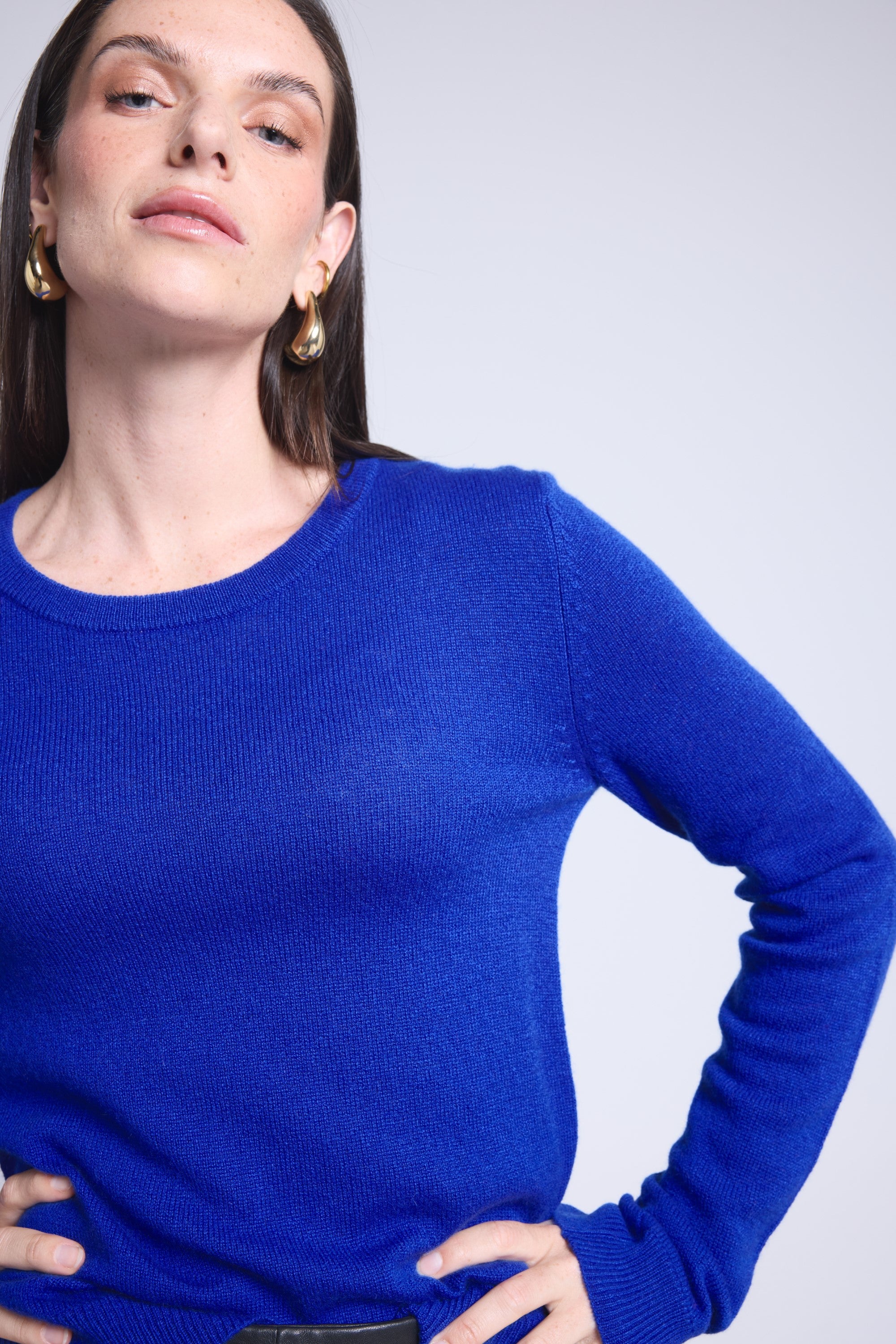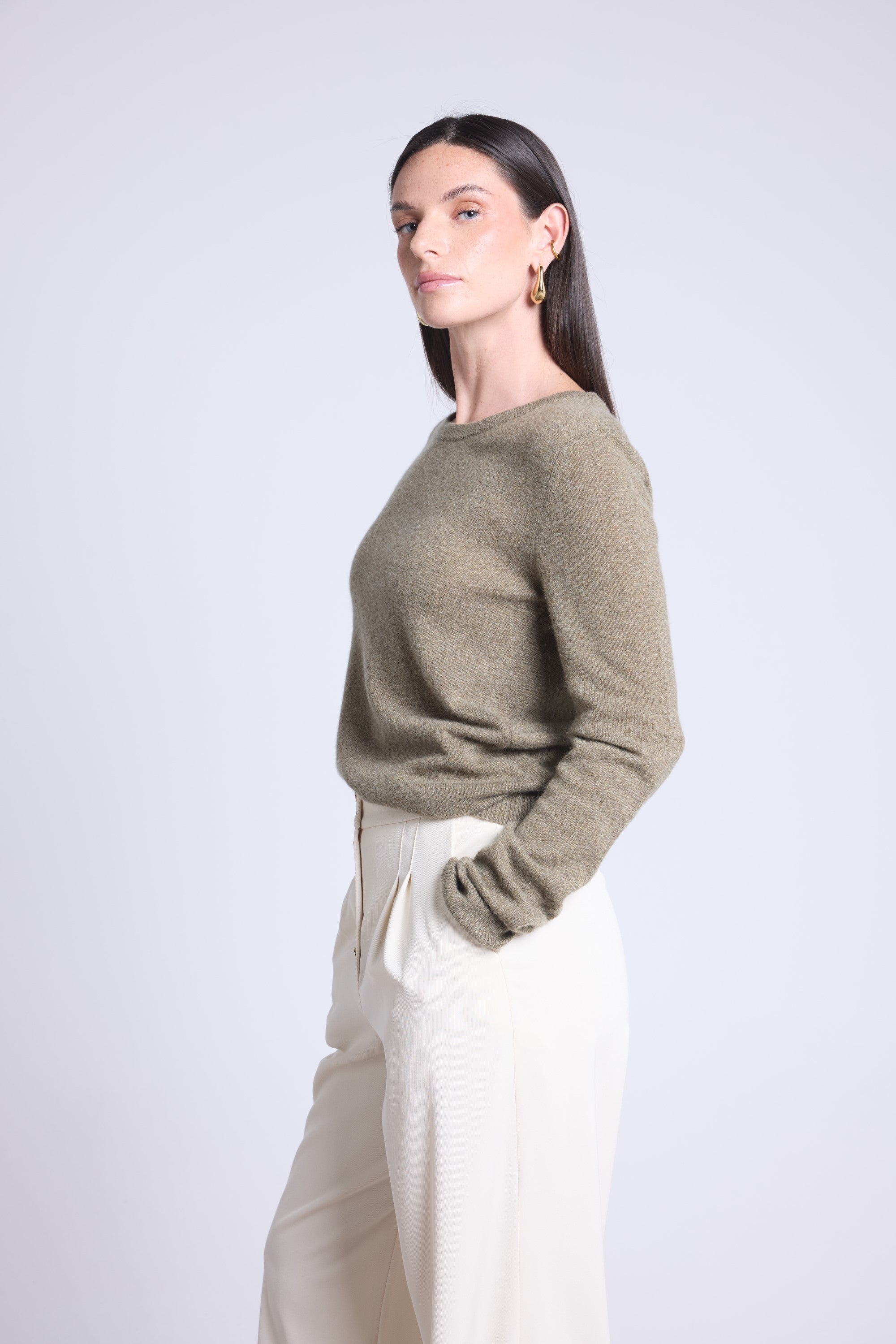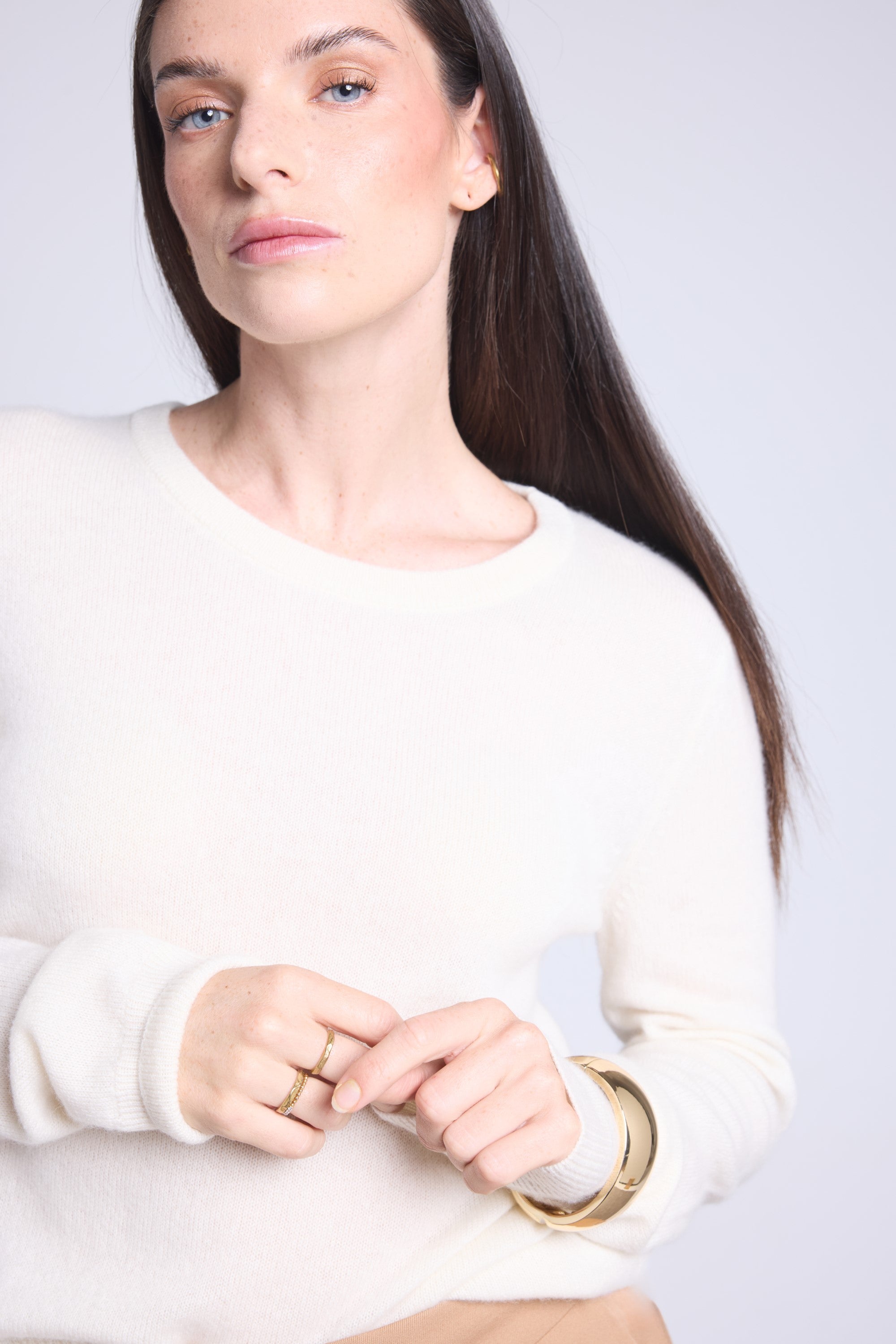 Ce pull col rond, en cachemire double fil, incarne la simplicité sophistiquée. Avec sa coupe légèrement ajustée et son col rond parfaitement dessiné, il se glisse aussi bien sous une veste tailleur qu’il se porte à même la peau, pour une allure élégante et sans effort.