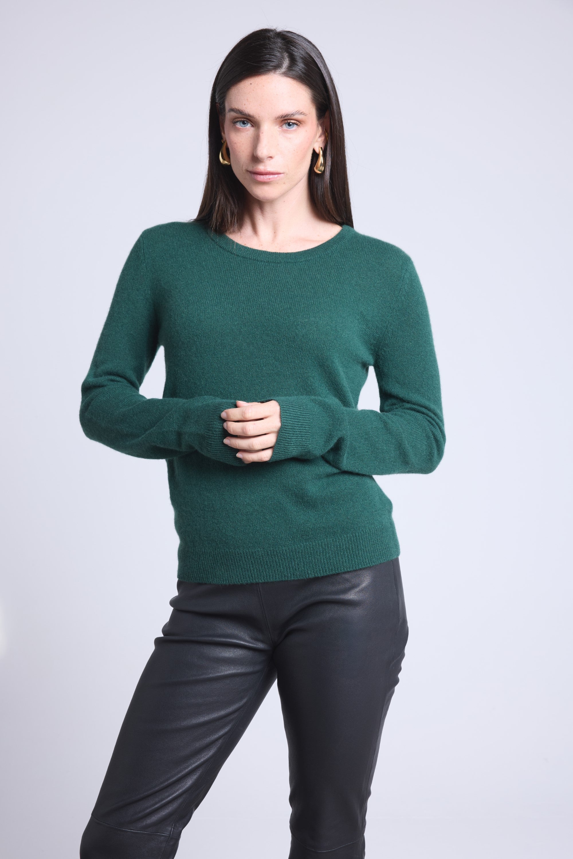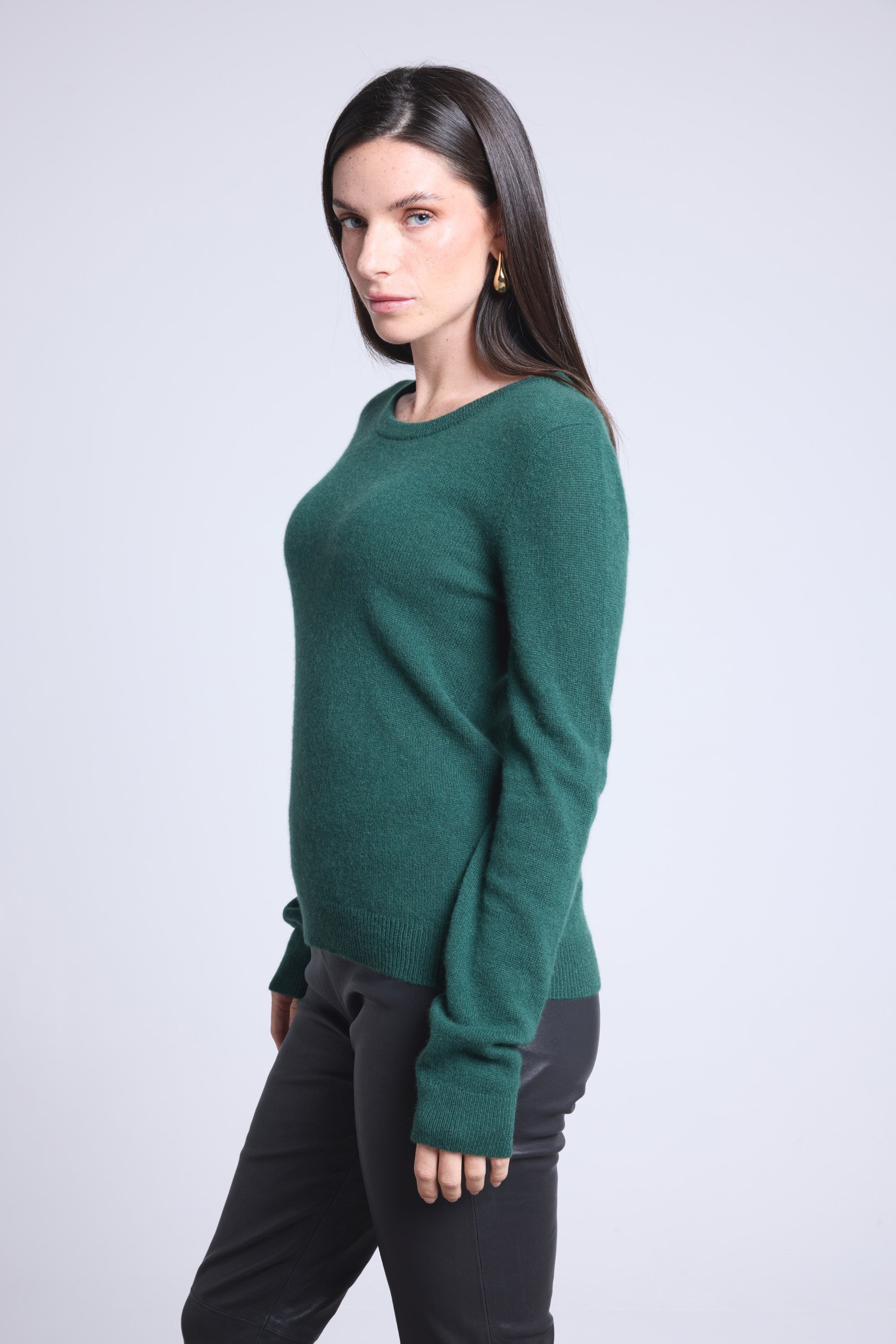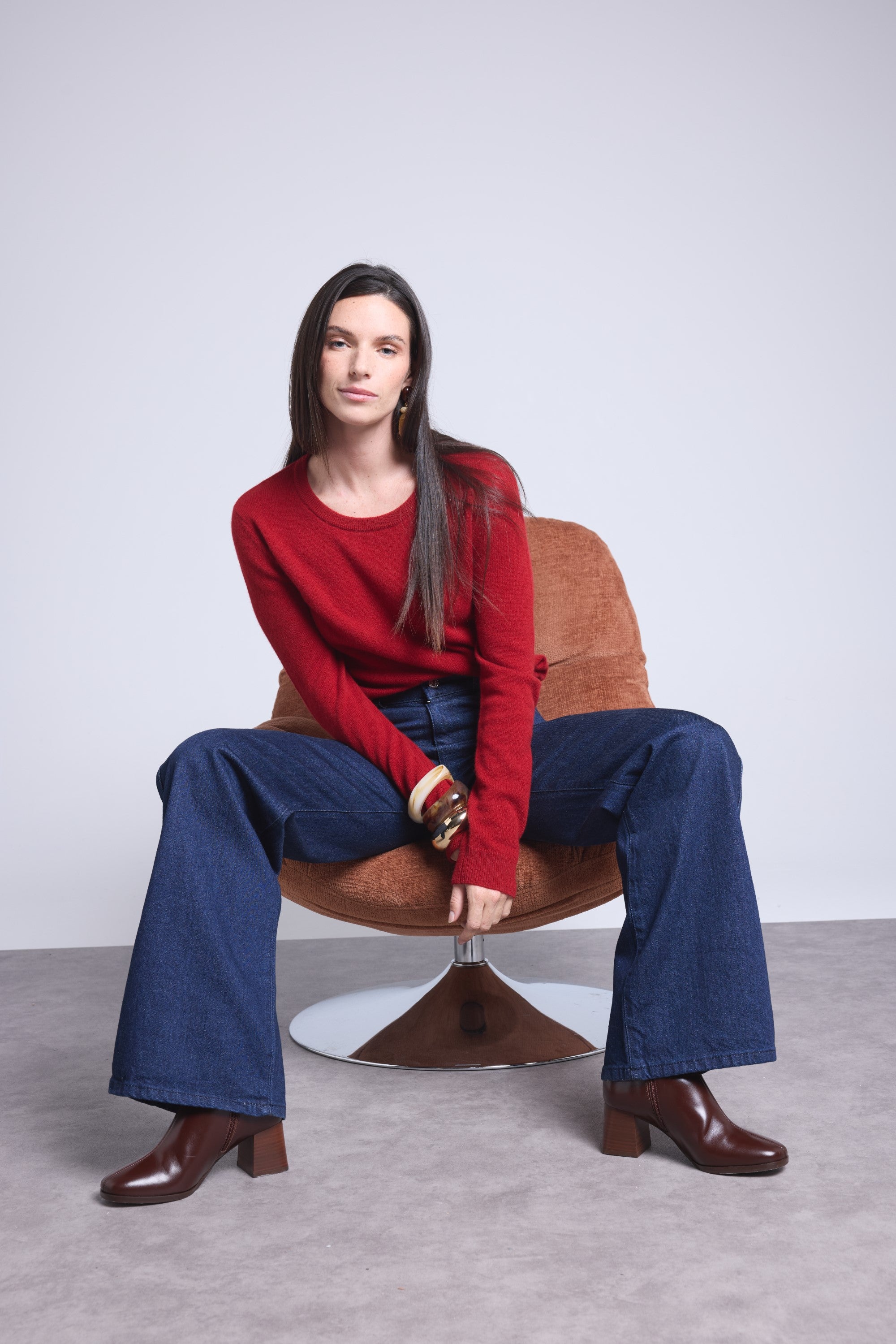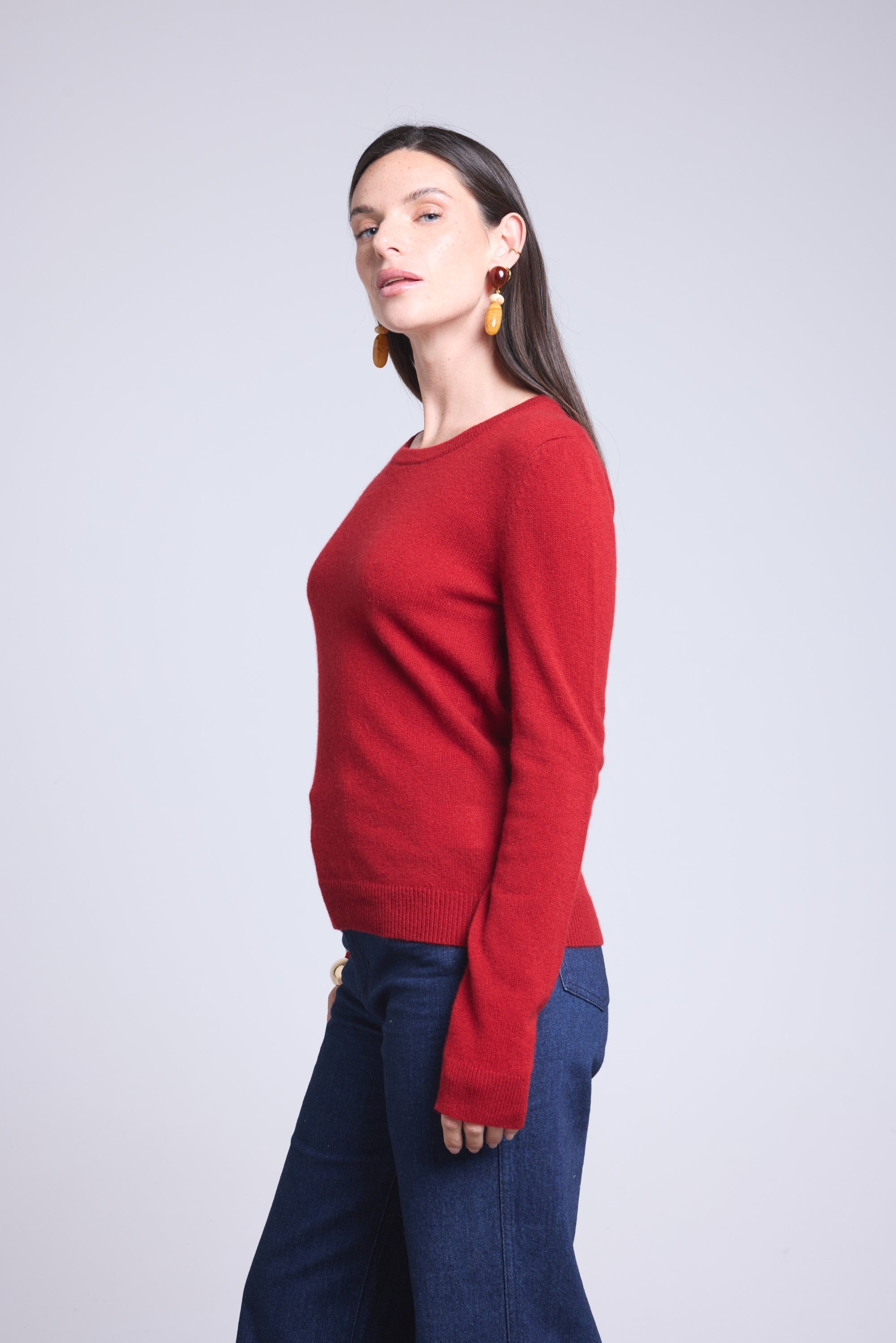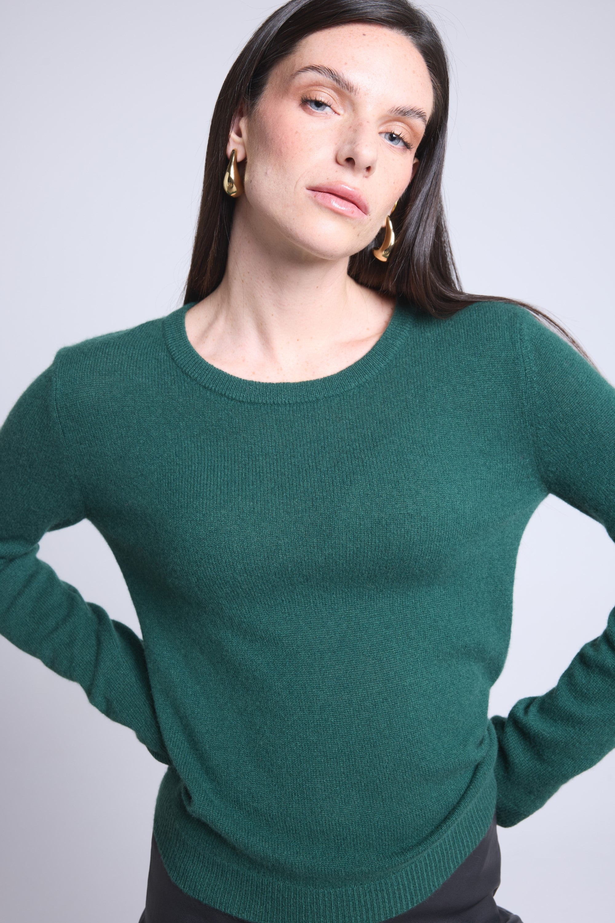 Ce pull col rond, en cachemire double fil, incarne la simplicité sophistiquée. Avec sa coupe légèrement ajustée et son col rond parfaitement dessiné, il se glisse aussi bien sous une veste tailleur qu’il se porte à même la peau, pour une allure élégante et sans effort.