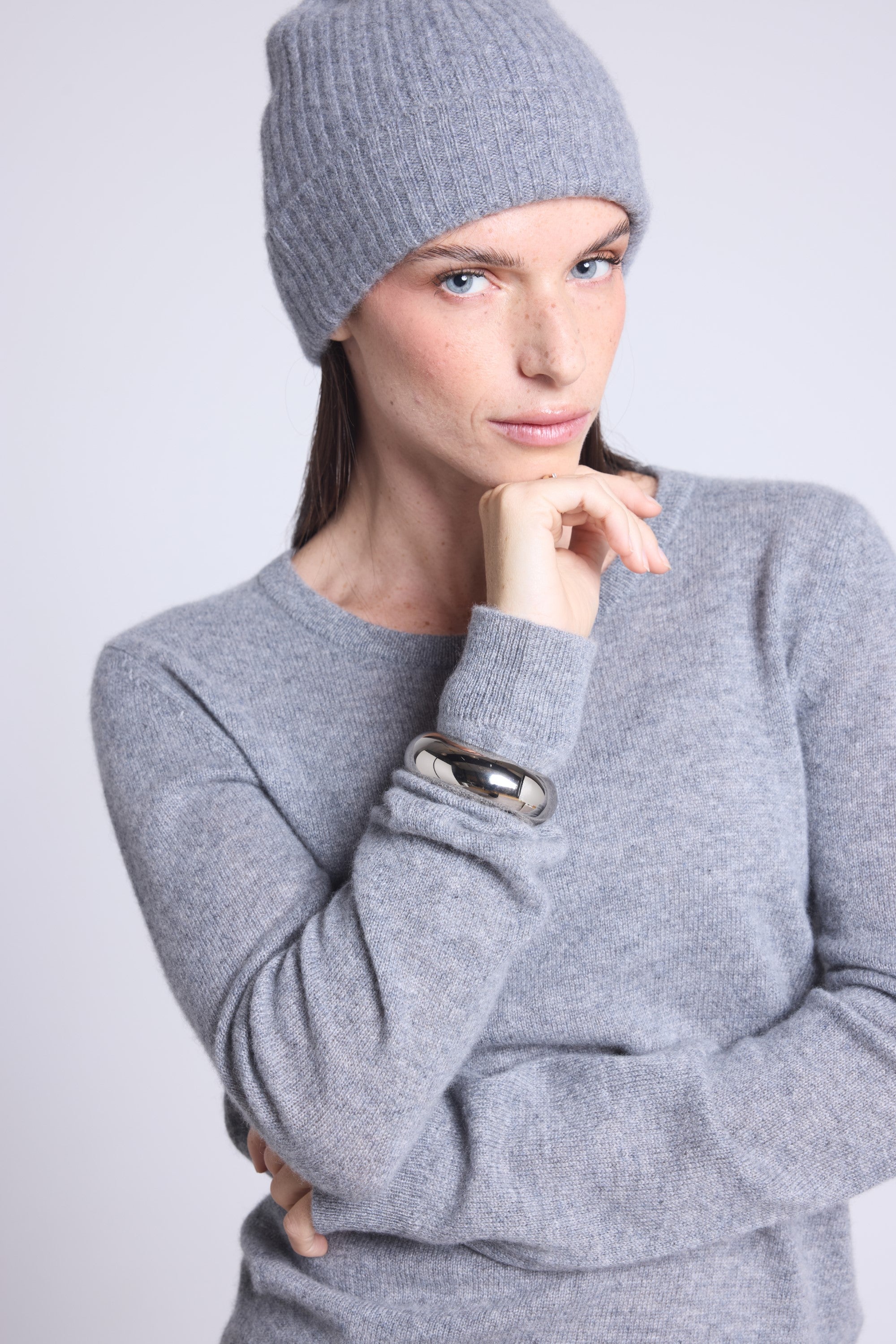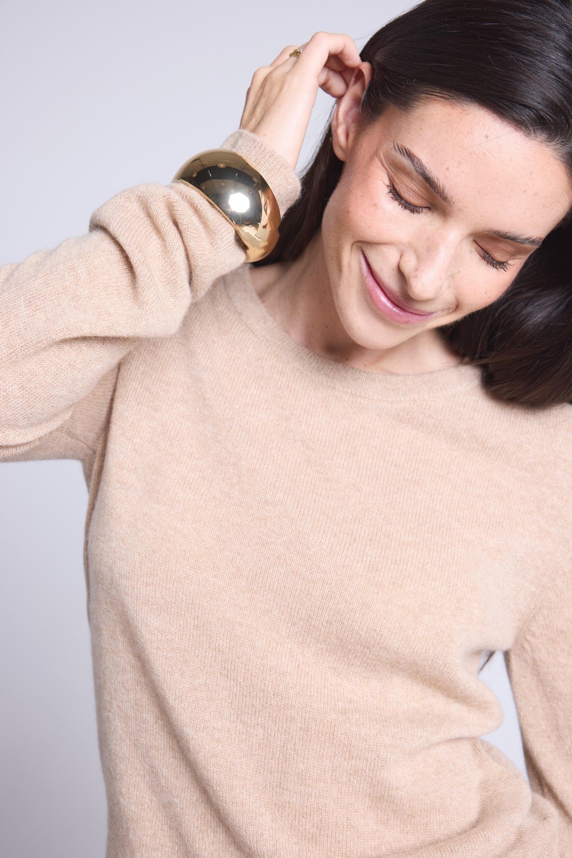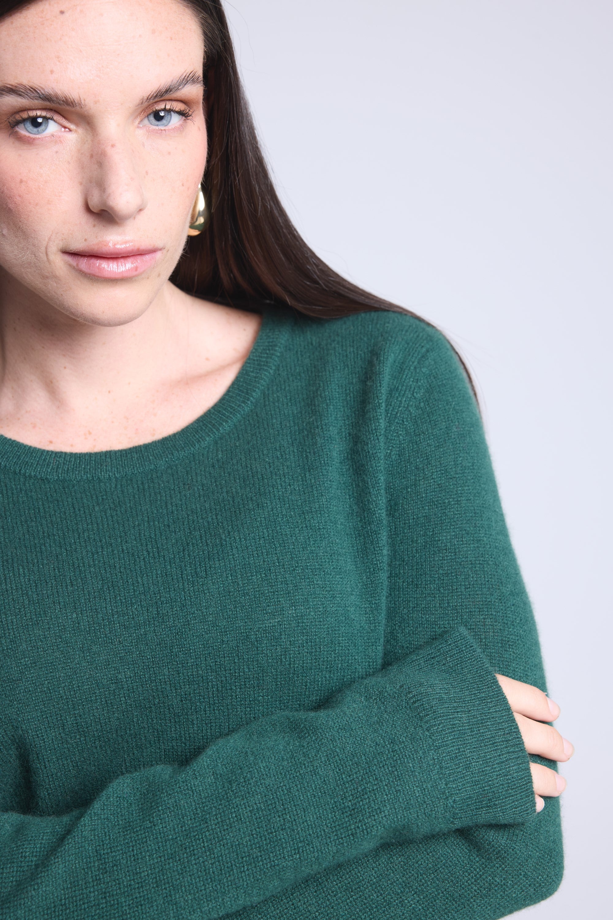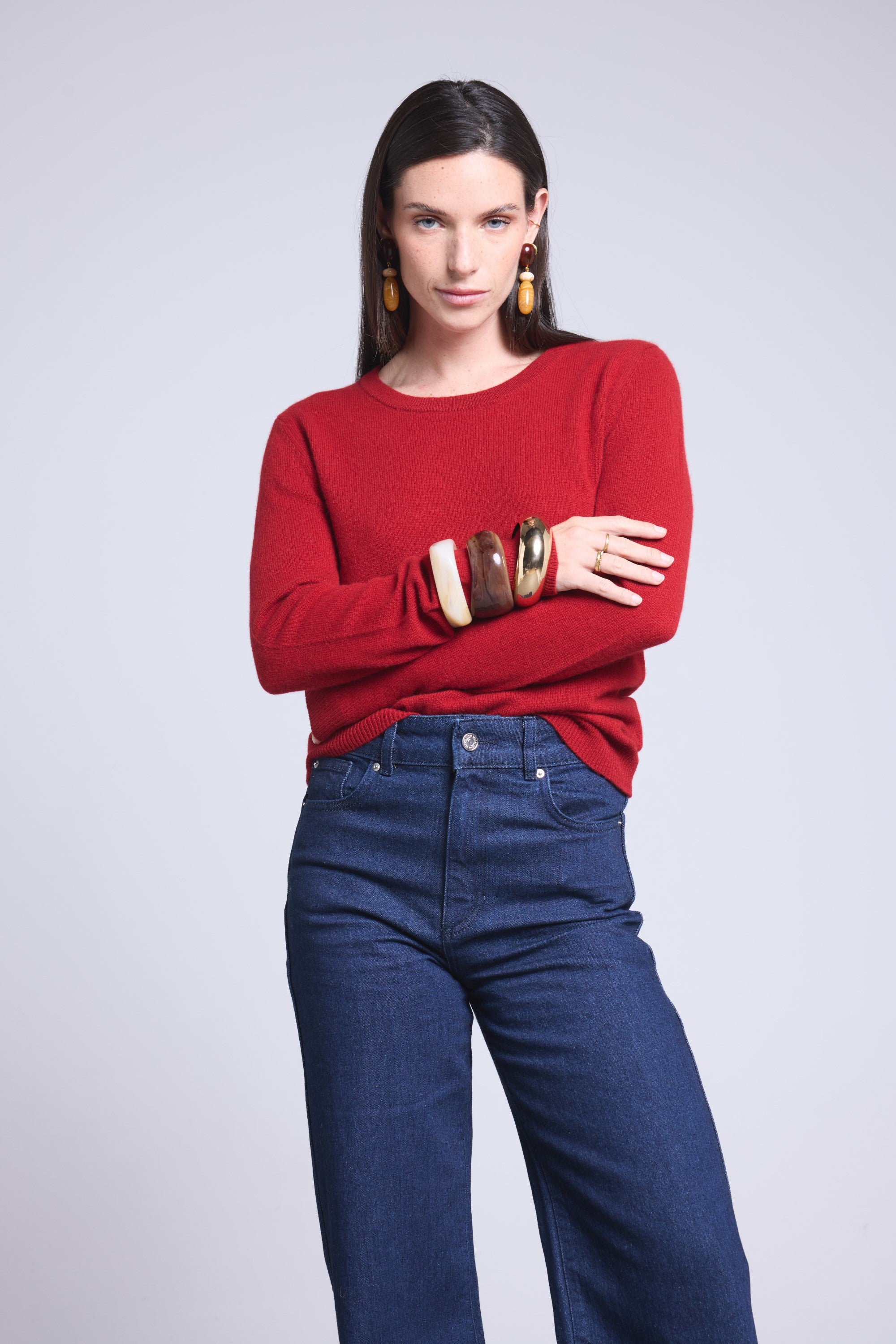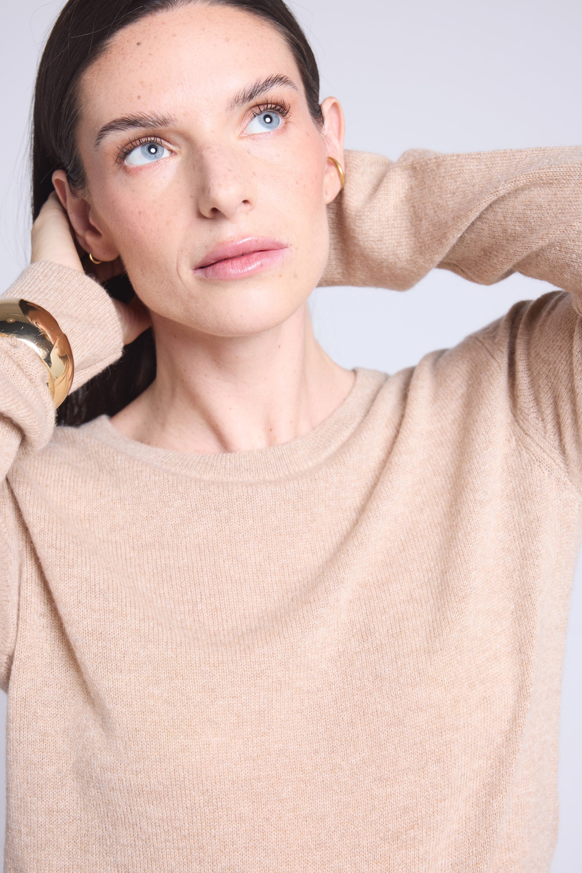 Ce pull col rond, en cachemire double fil, incarne la simplicité sophistiquée. Avec sa coupe légèrement ajustée et son col rond parfaitement dessiné, il se glisse aussi bien sous une veste tailleur qu’il se porte à même la peau, pour une allure élégante et sans effort.