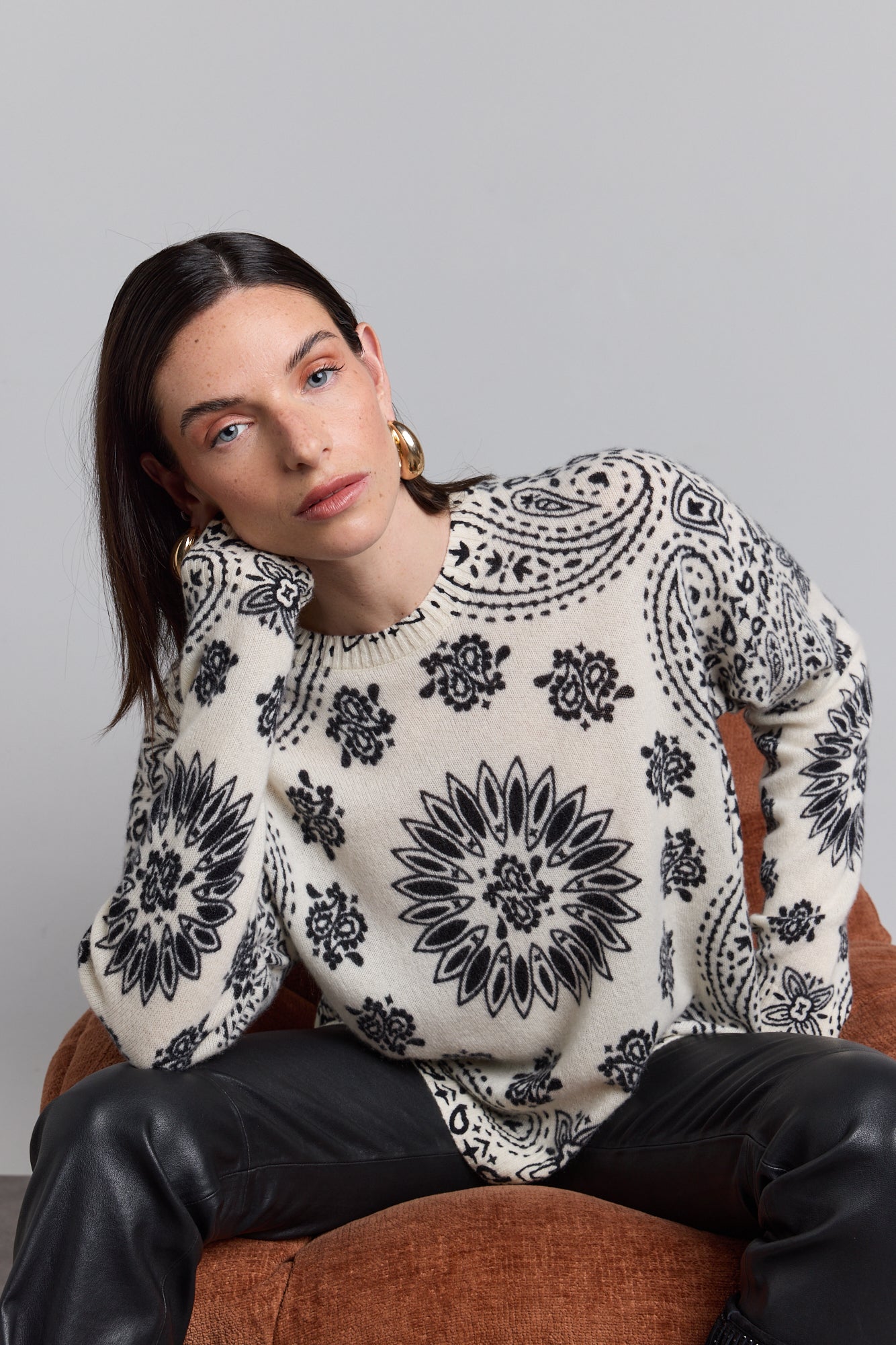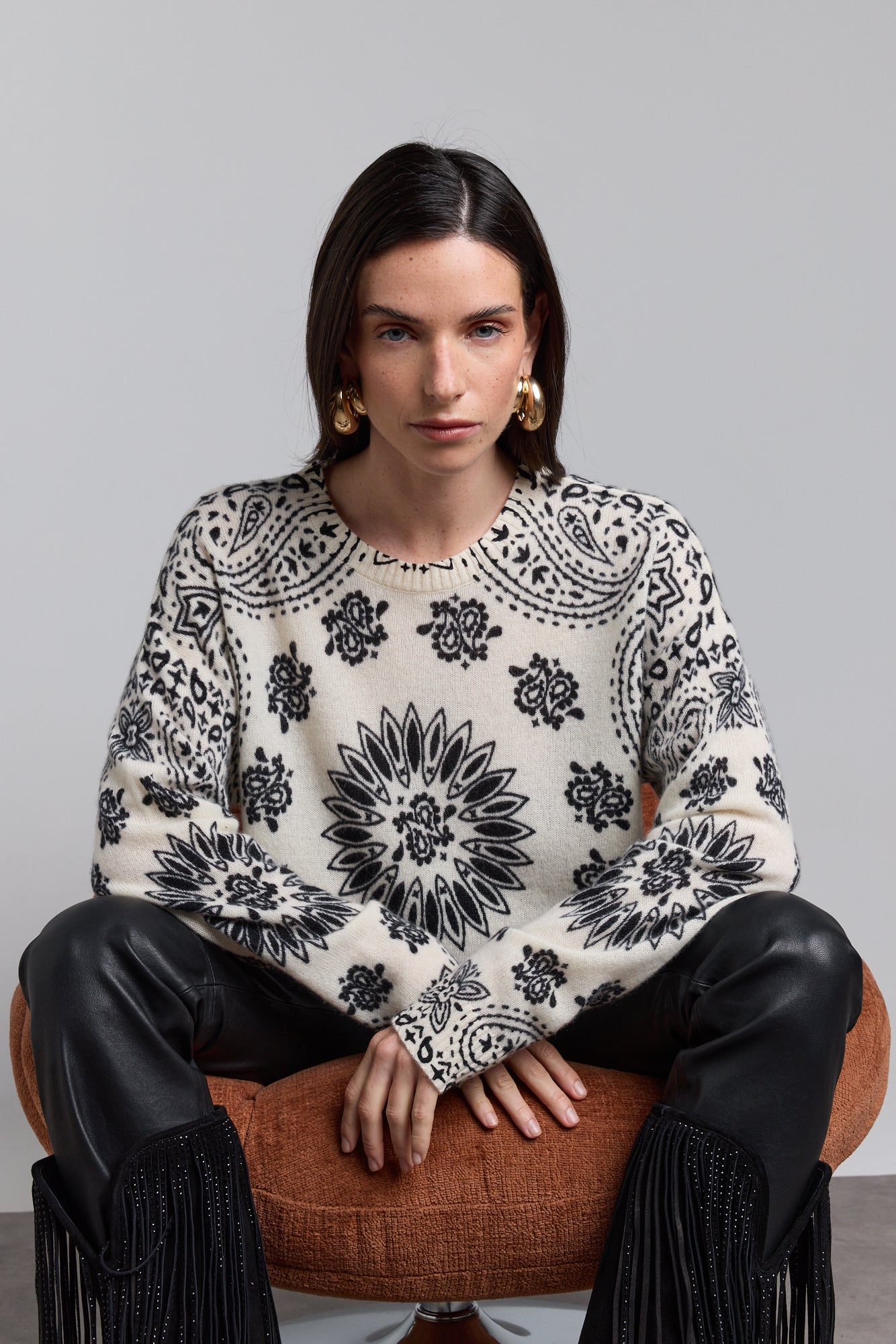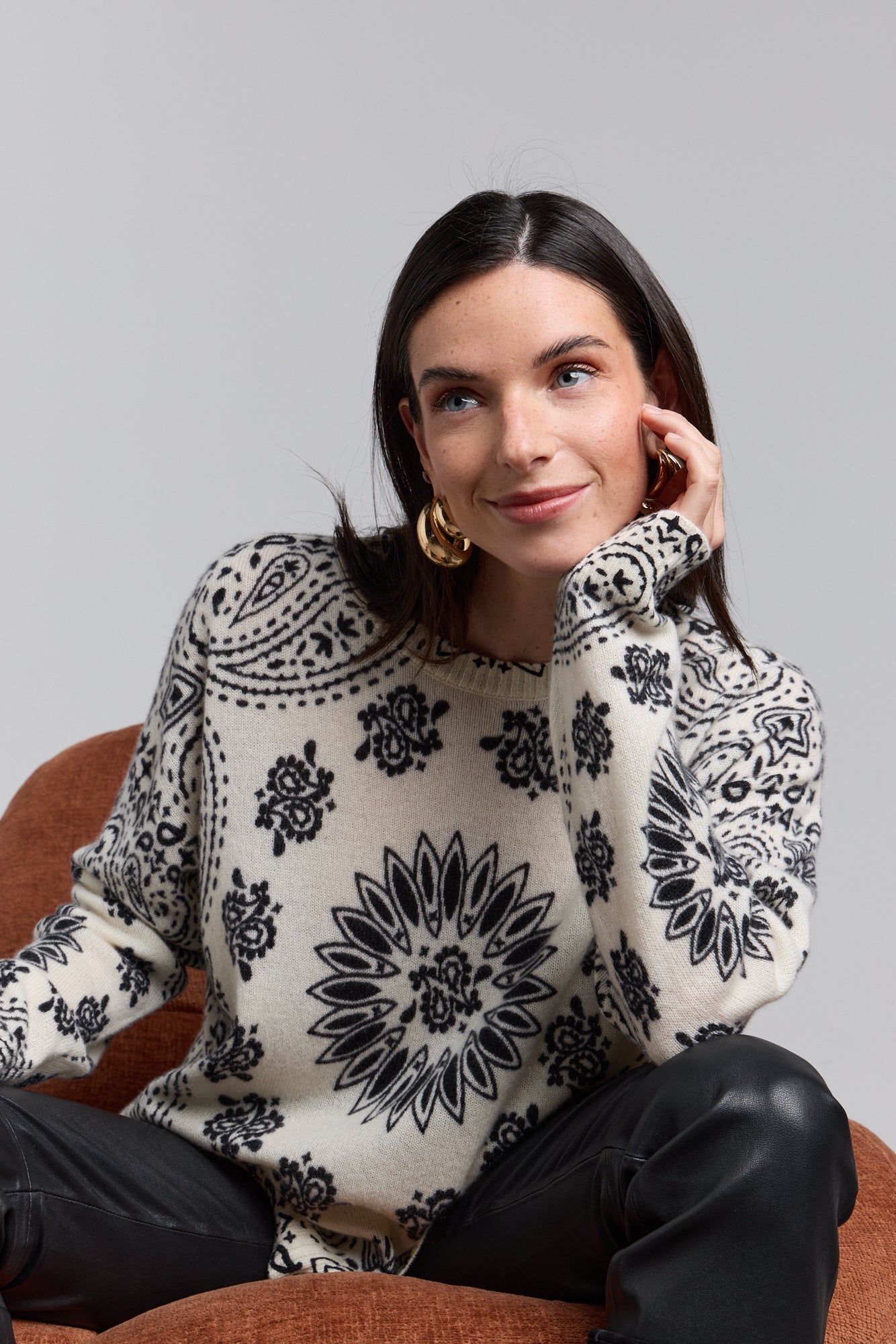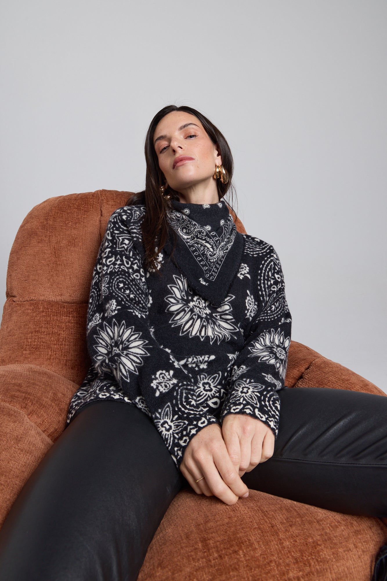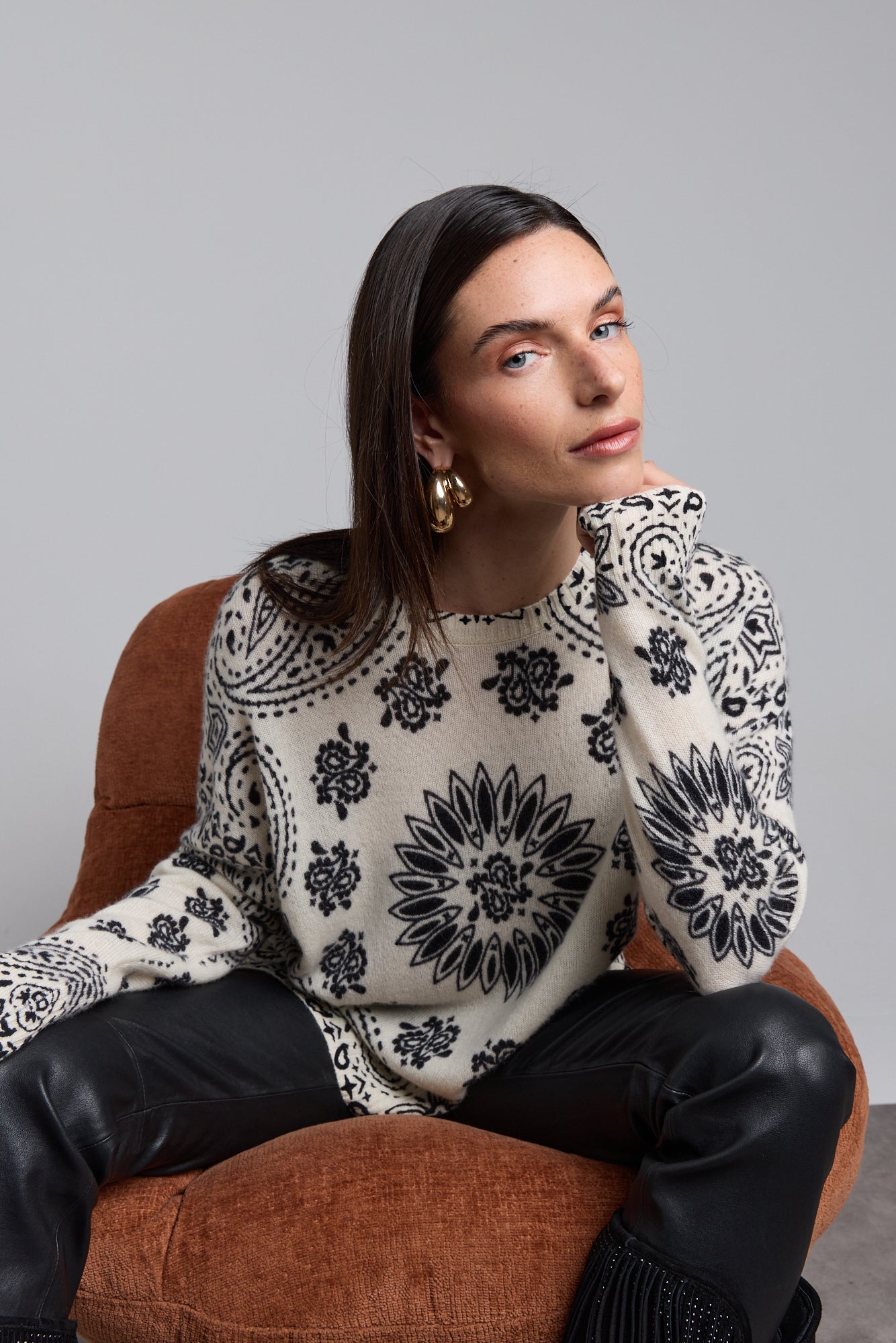 PRESLEY est un pull en 100% cachemire au style unique, sublimé par un imprimé bandana intégral qui lui confère une allure graphique et tendance. Sa coupe droite et son col rond en font une pièce confortable et facile à porter, idéale pour donner du caractère à vos tenues.