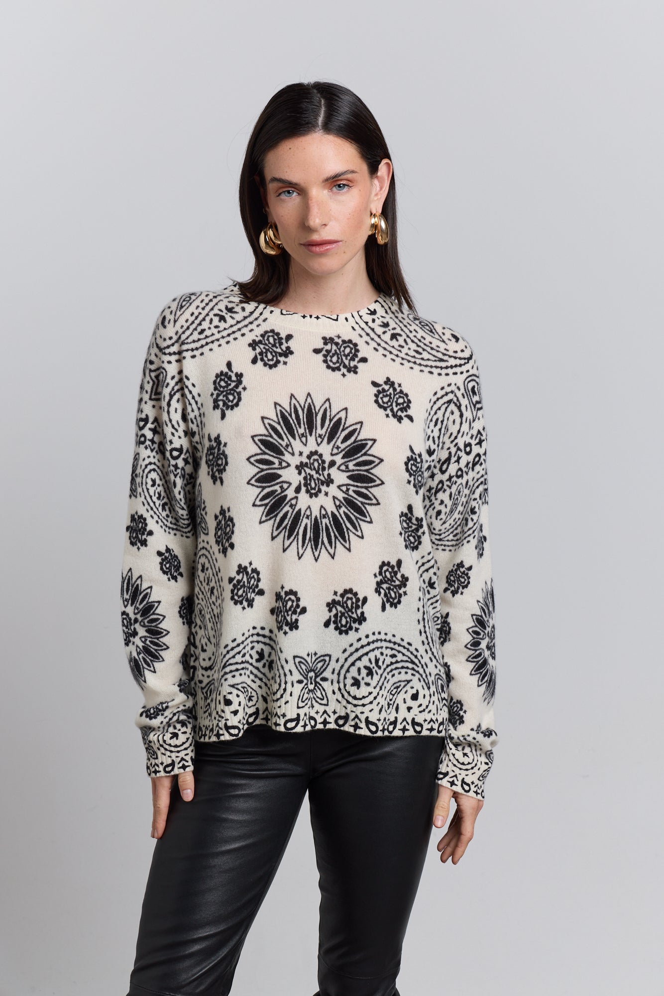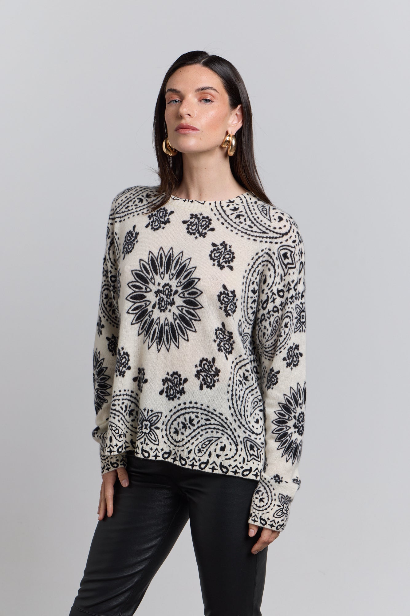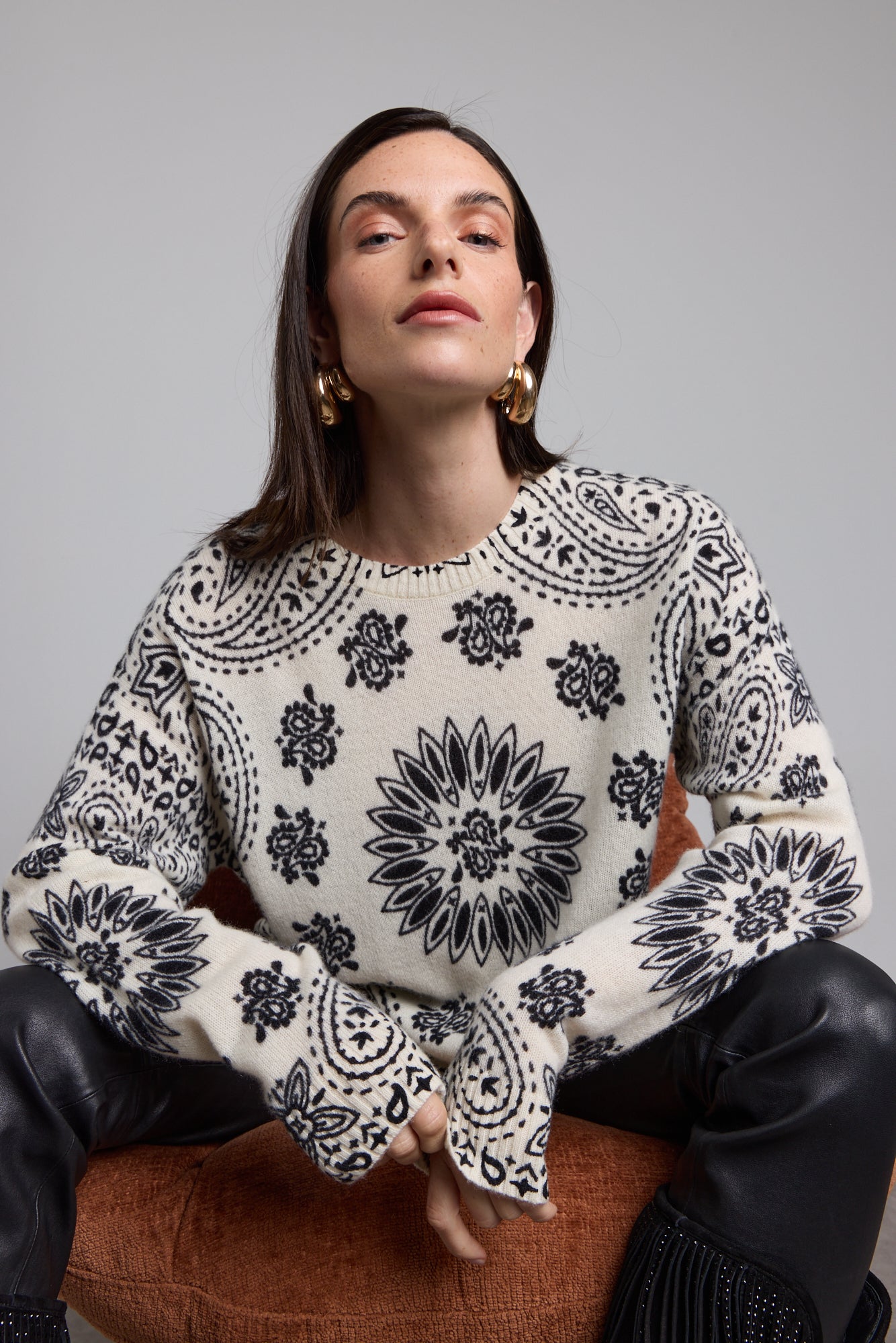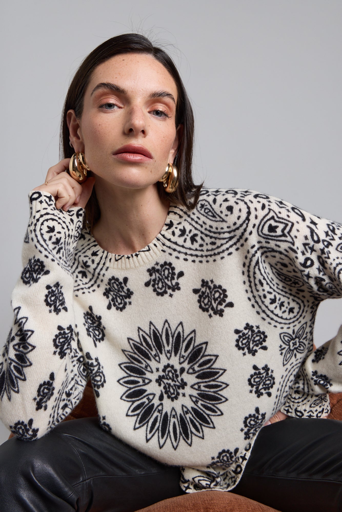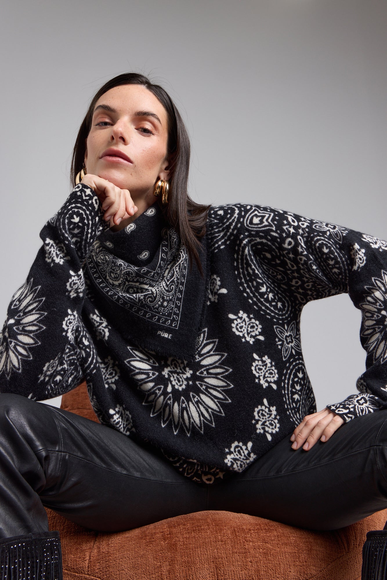 PRESLEY est un pull en 100% cachemire au style unique, sublimé par un imprimé bandana intégral qui lui confère une allure graphique et tendance. Sa coupe droite et son col rond en font une pièce confortable et facile à porter, idéale pour donner du caractère à vos tenues.