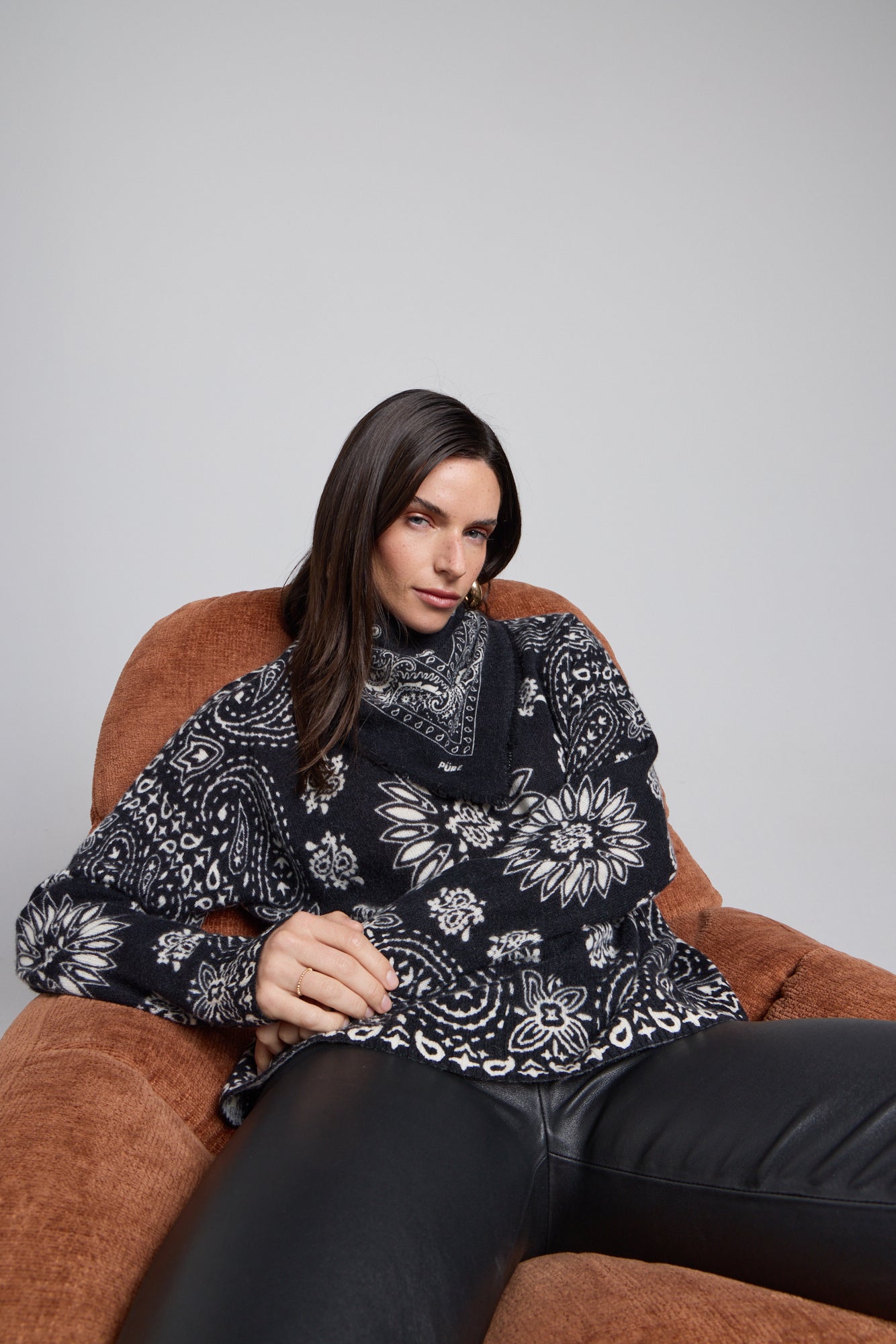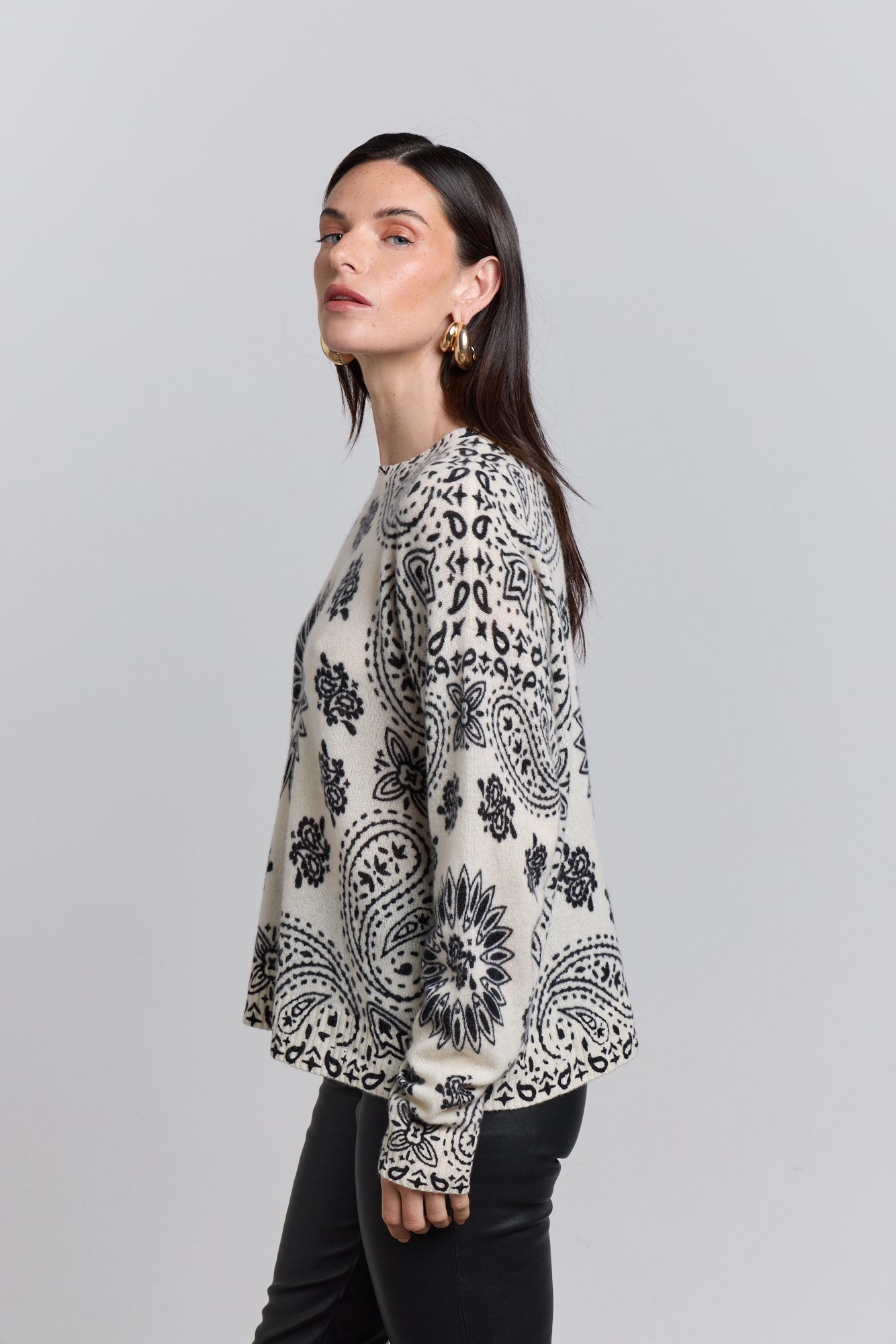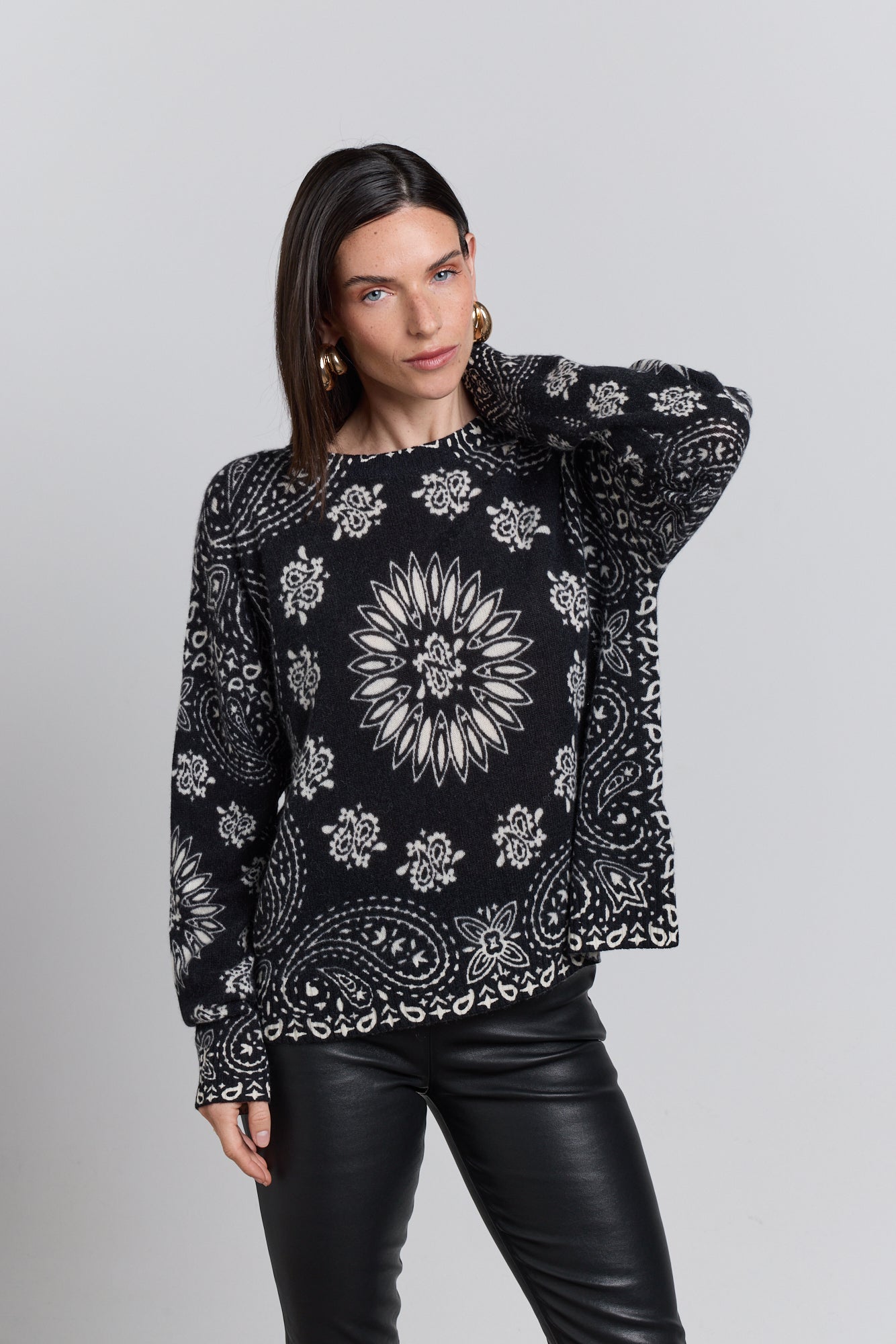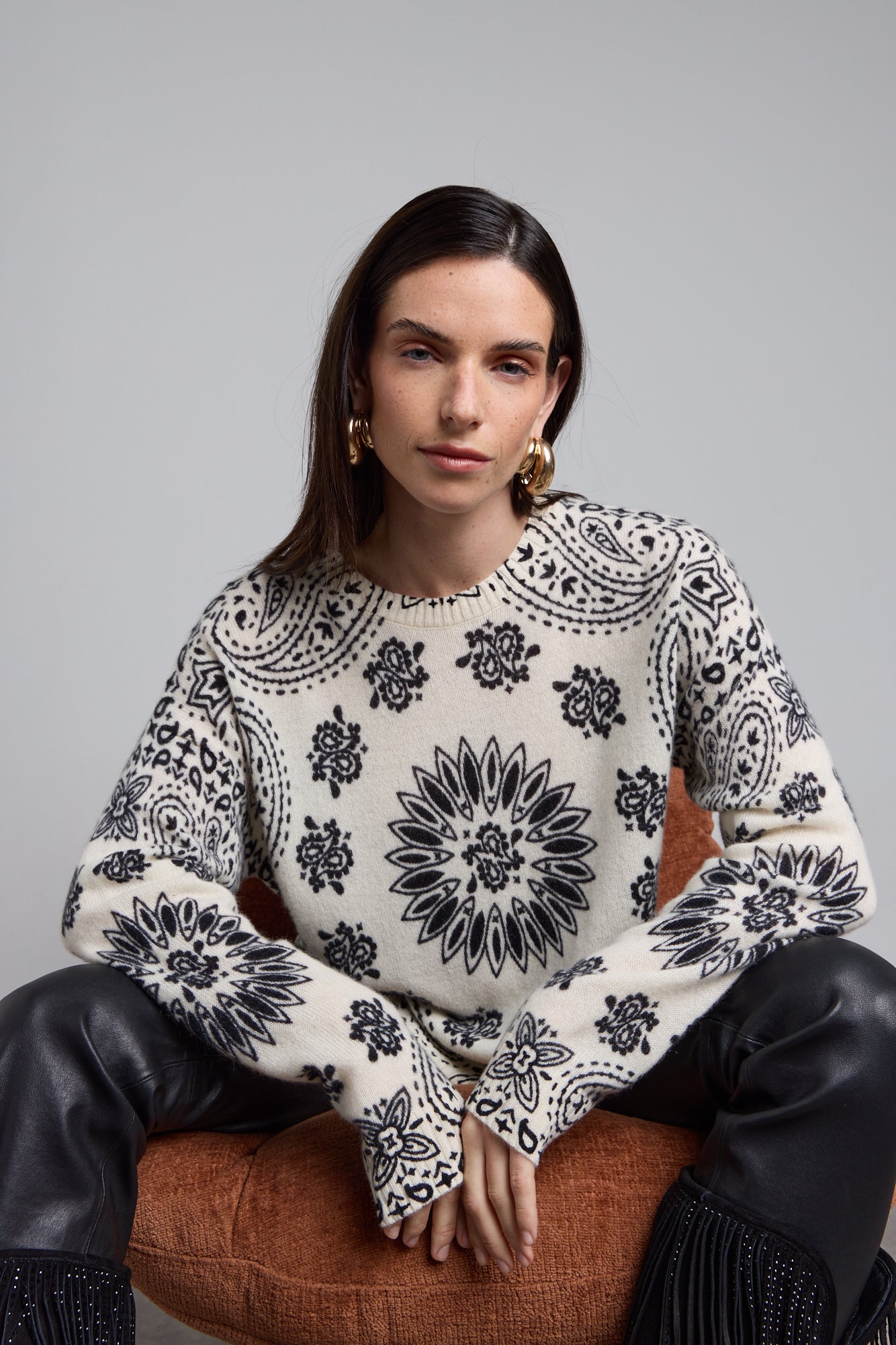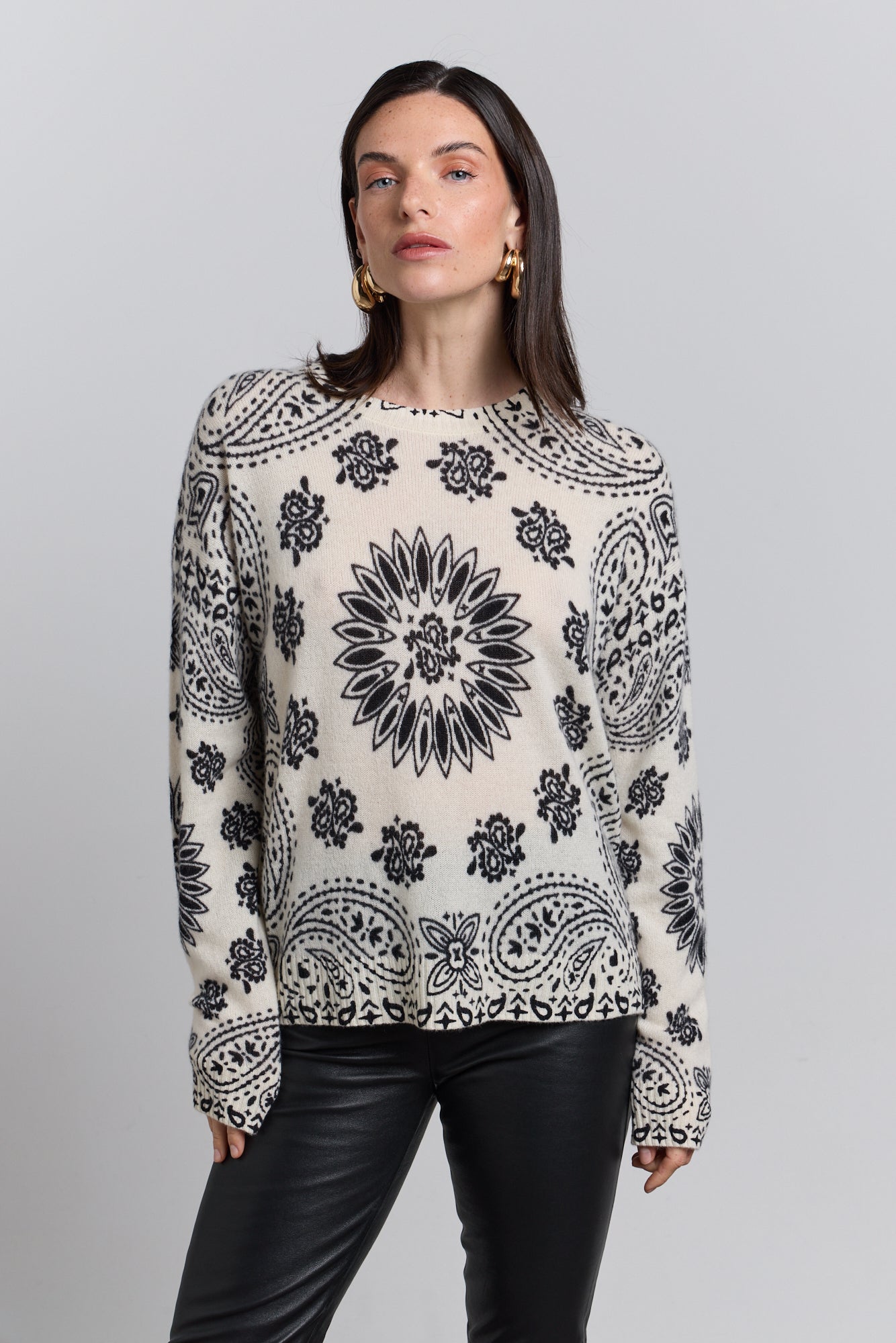 PRESLEY est un pull en 100% cachemire au style unique, sublimé par un imprimé bandana intégral qui lui confère une allure graphique et tendance. Sa coupe droite et son col rond en font une pièce confortable et facile à porter, idéale pour donner du caractère à vos tenues.