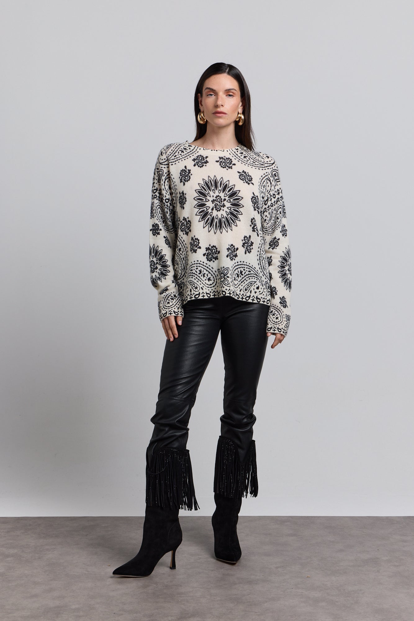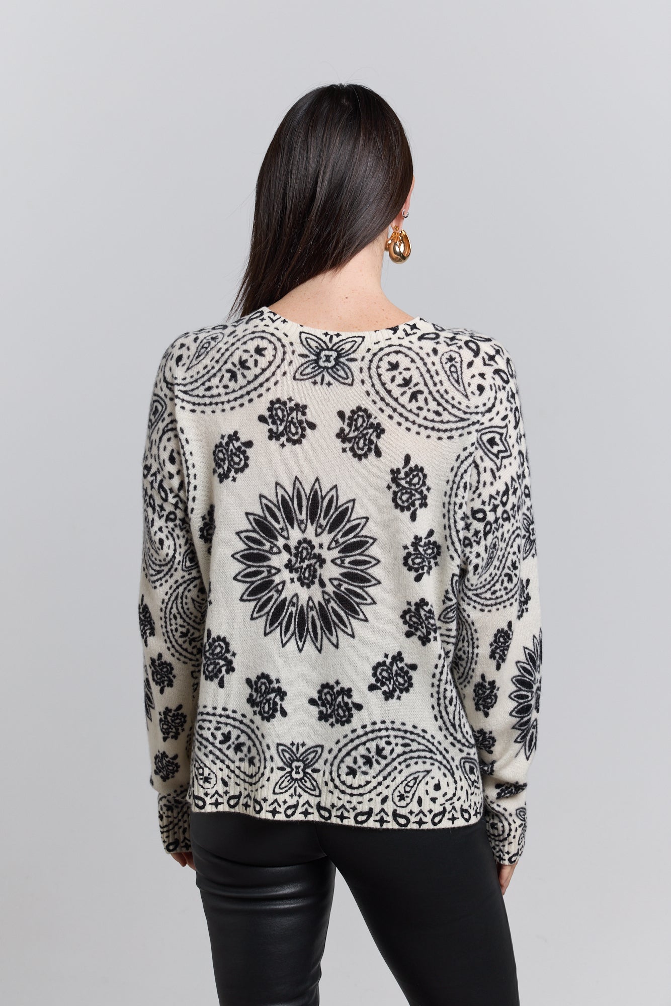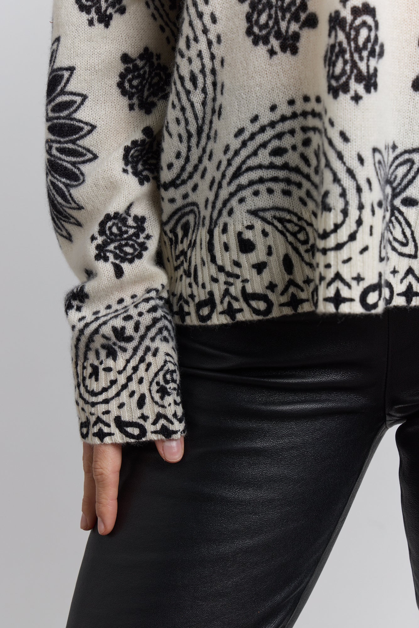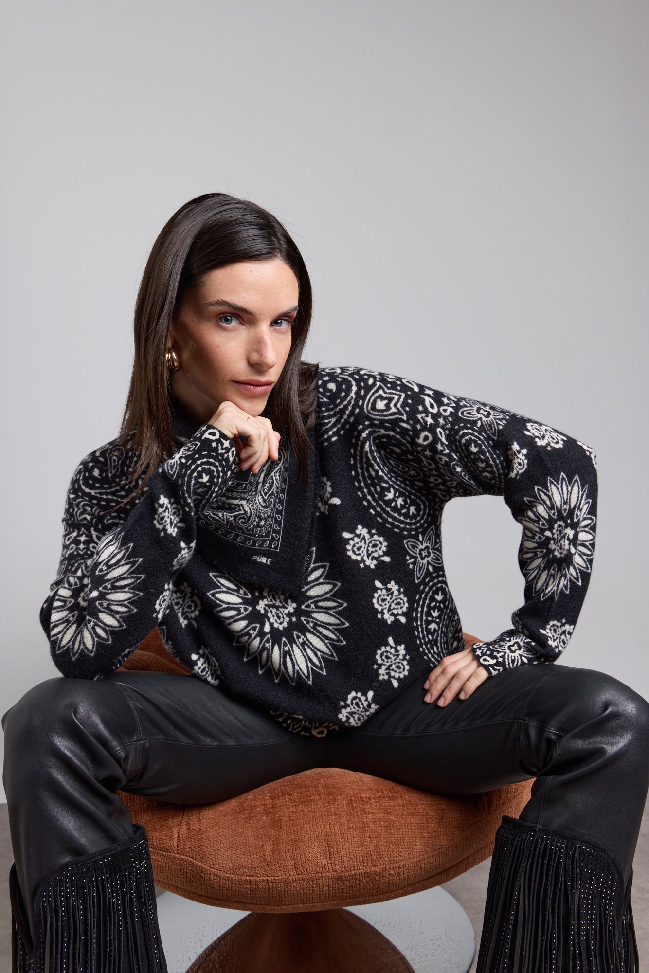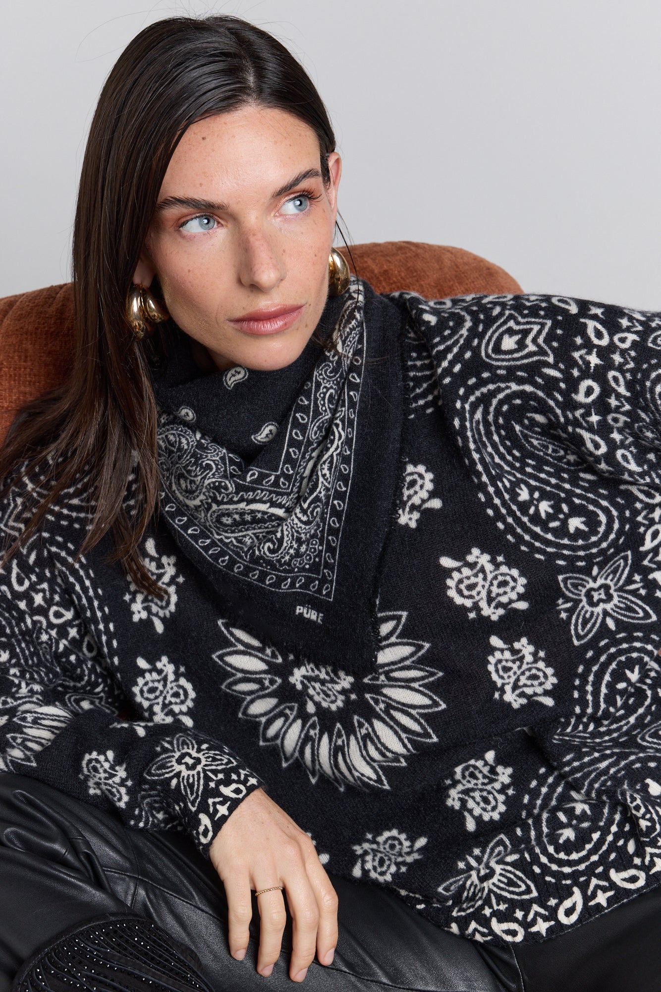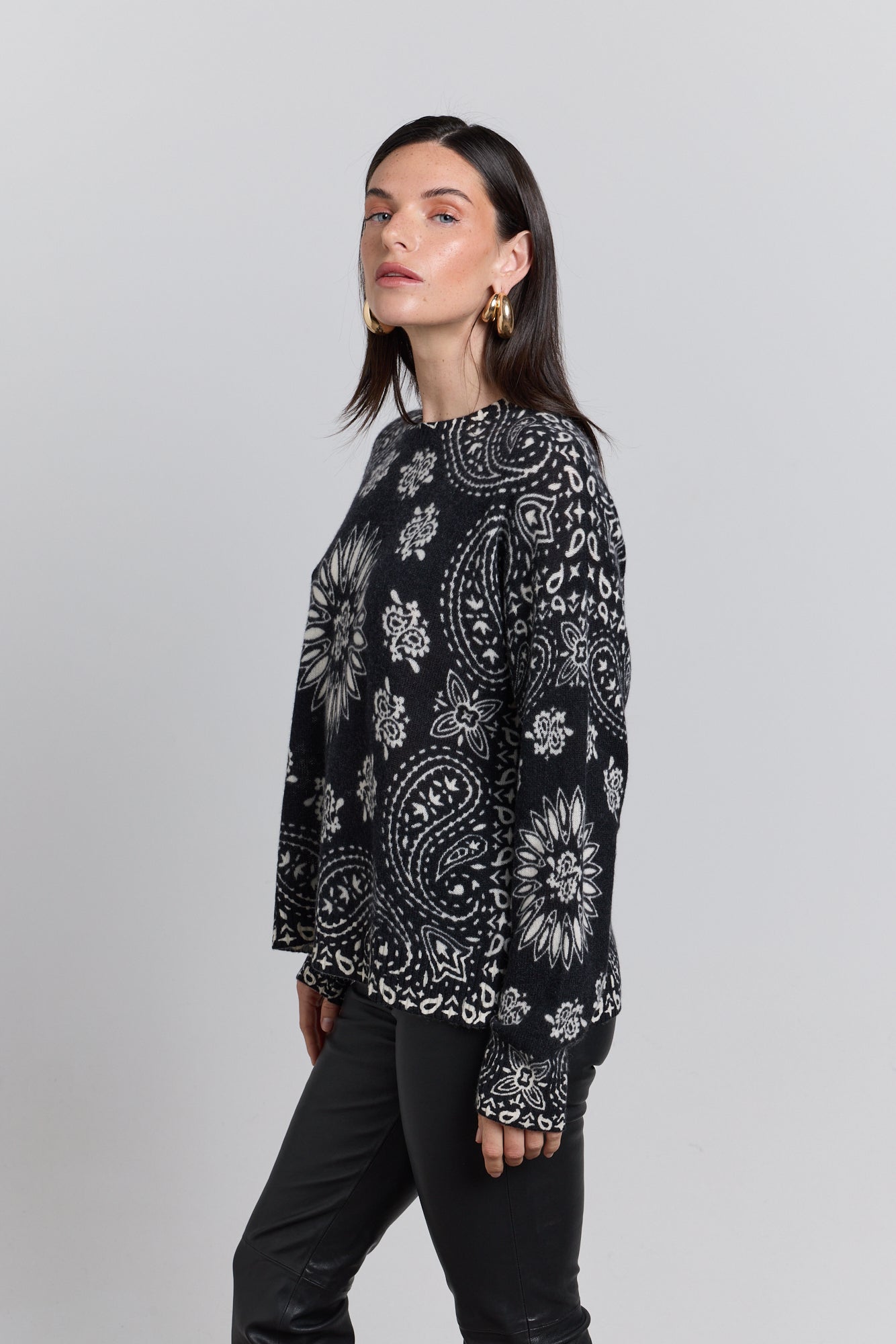 PRESLEY est un pull en 100% cachemire au style unique, sublimé par un imprimé bandana intégral qui lui confère une allure graphique et tendance. Sa coupe droite et son col rond en font une pièce confortable et facile à porter, idéale pour donner du caractère à vos tenues.