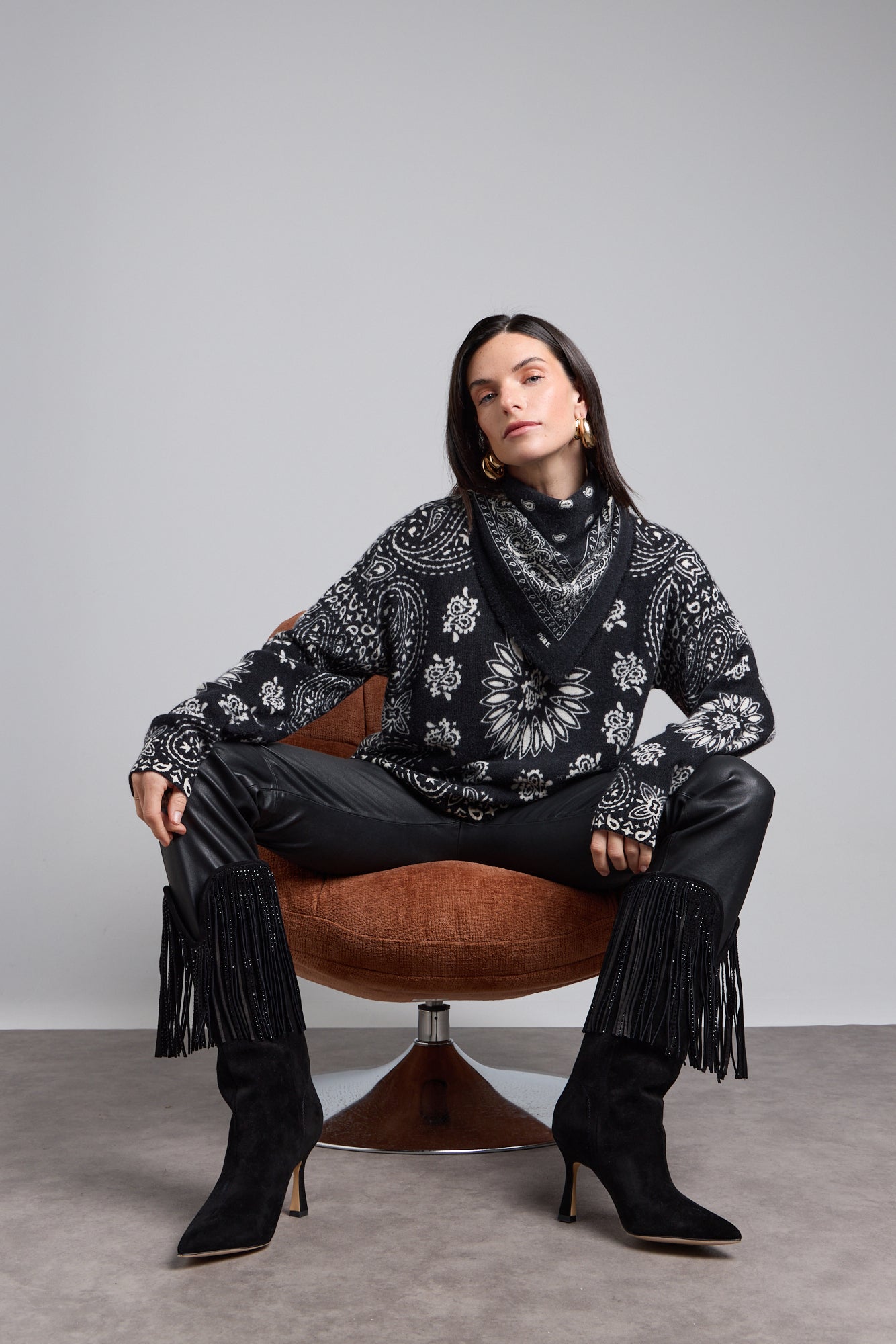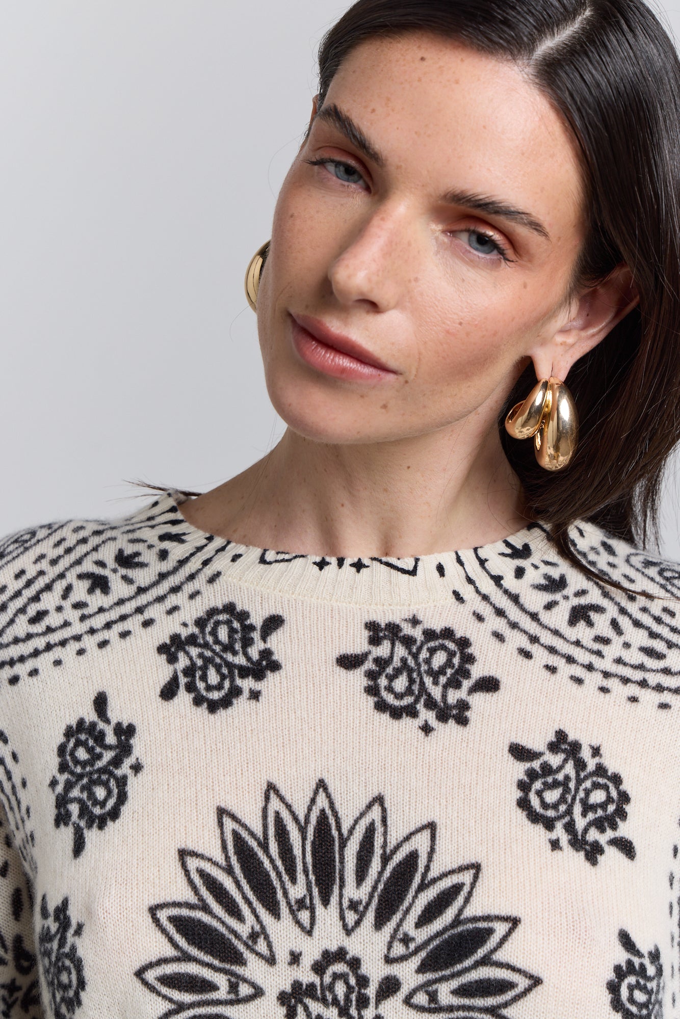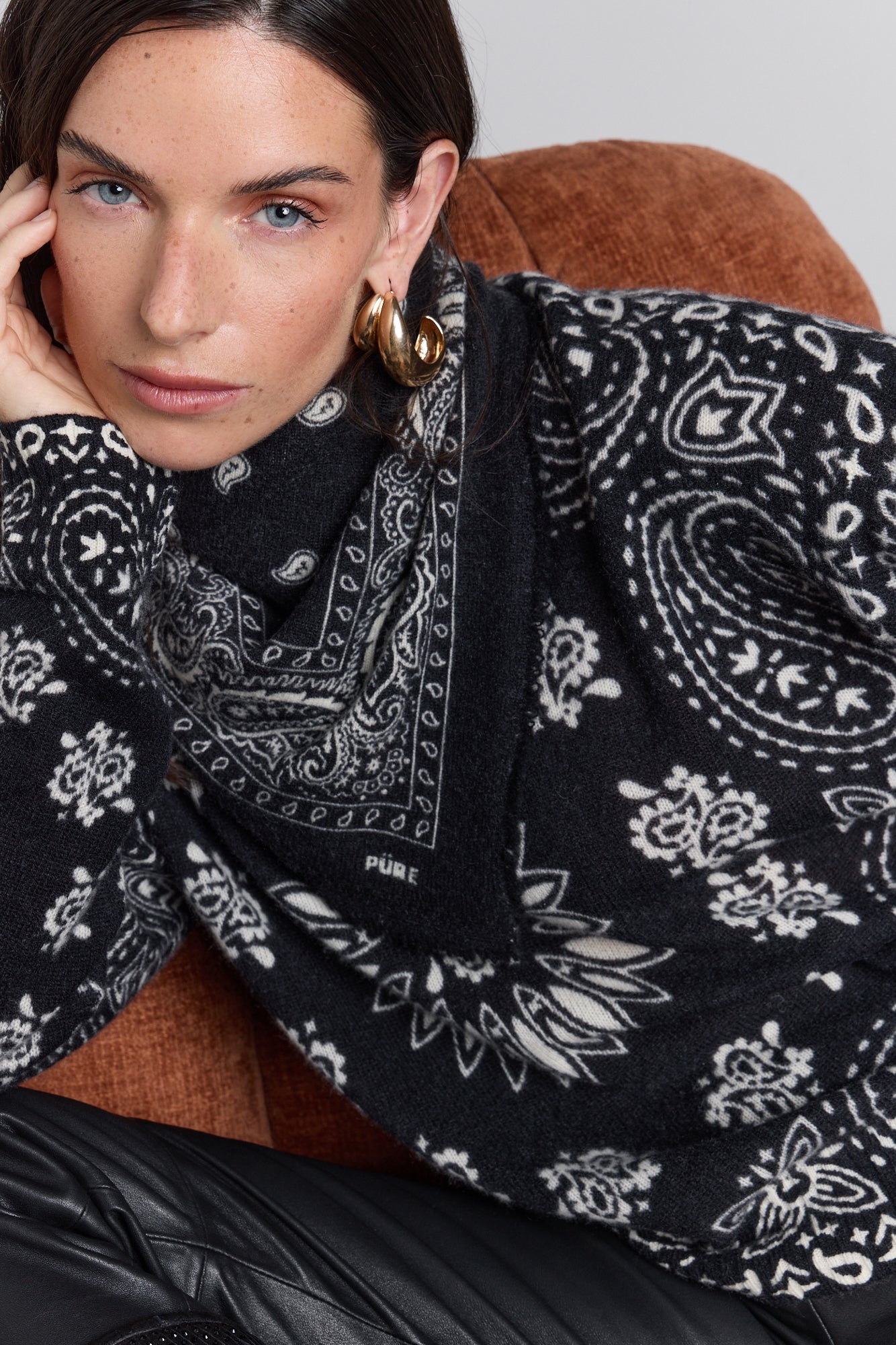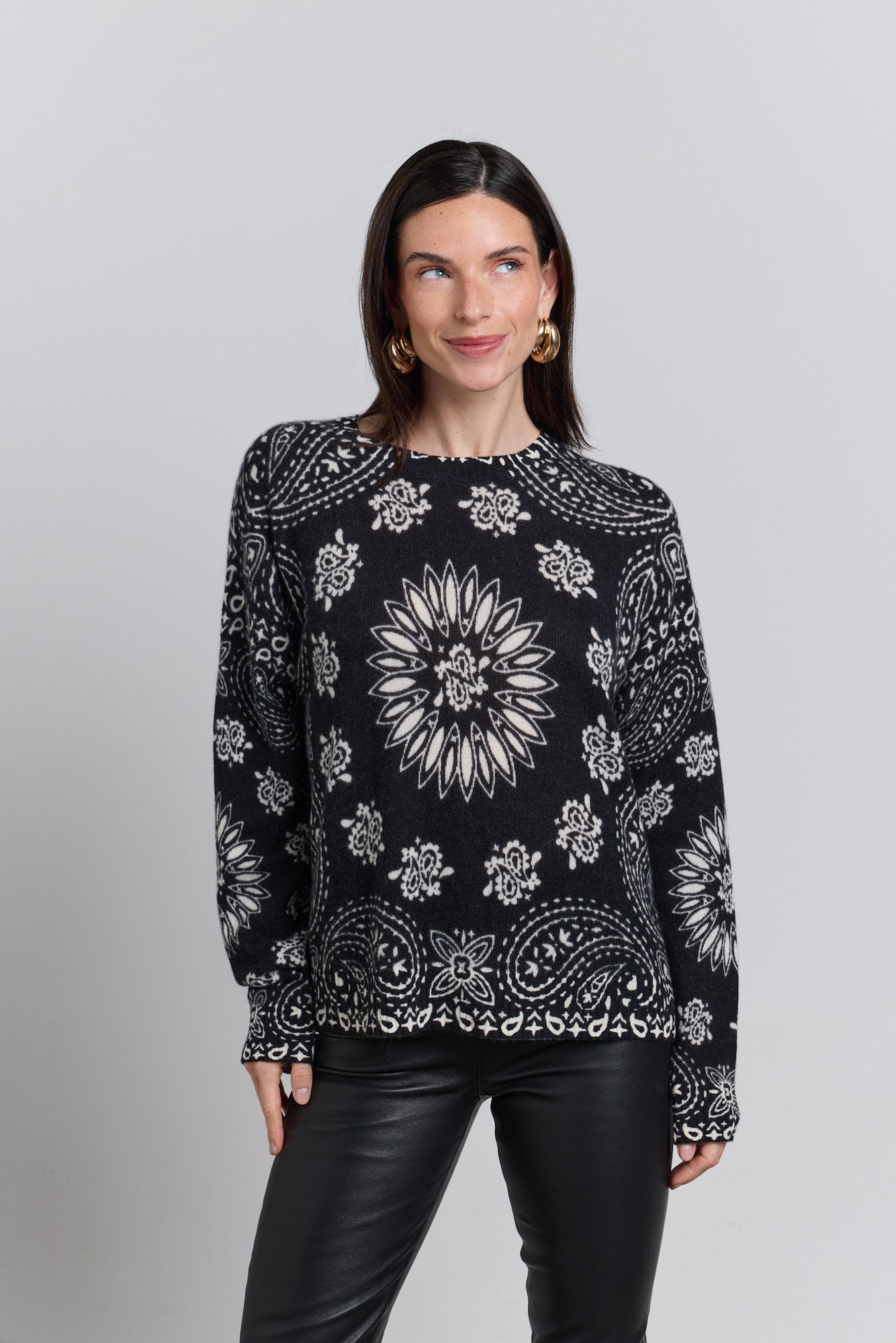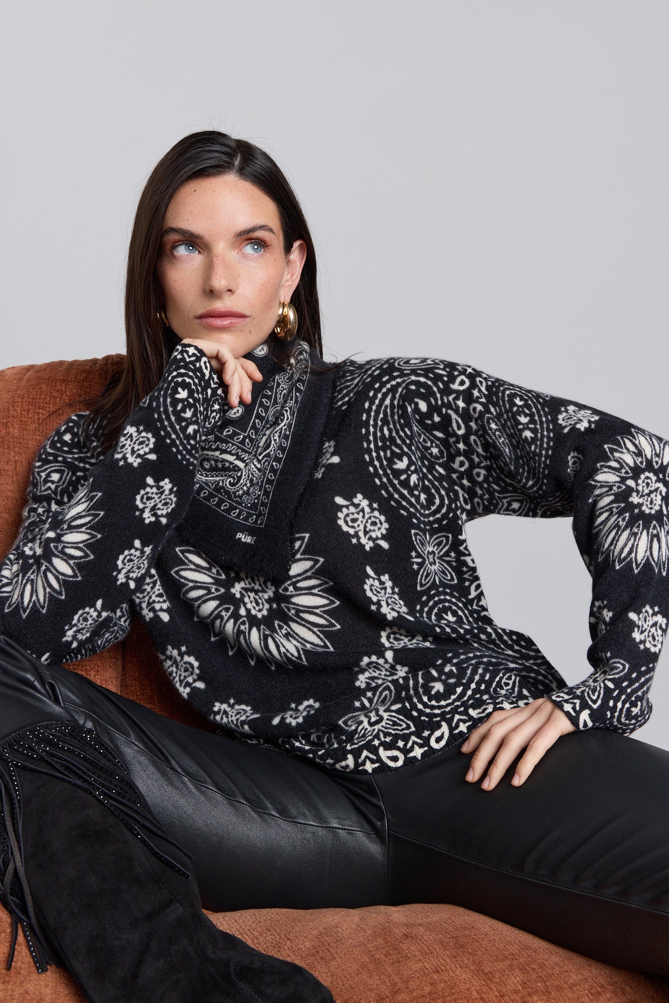 PRESLEY est un pull en 100% cachemire au style unique, sublimé par un imprimé bandana intégral qui lui confère une allure graphique et tendance. Sa coupe droite et son col rond en font une pièce confortable et facile à porter, idéale pour donner du caractère à vos tenues.