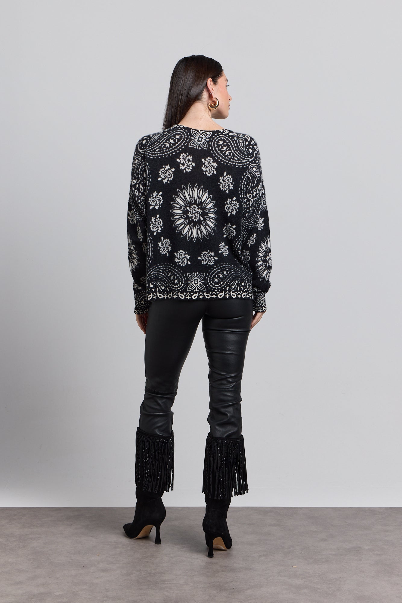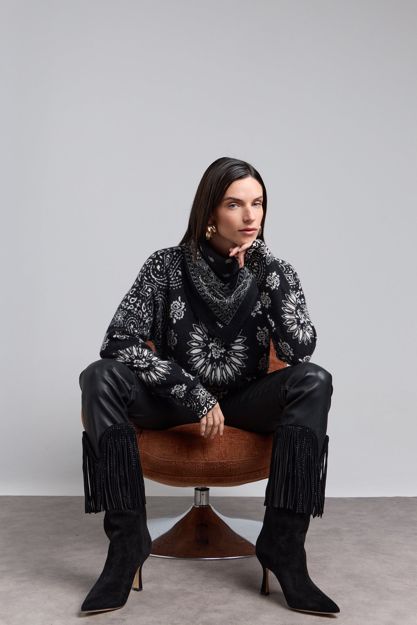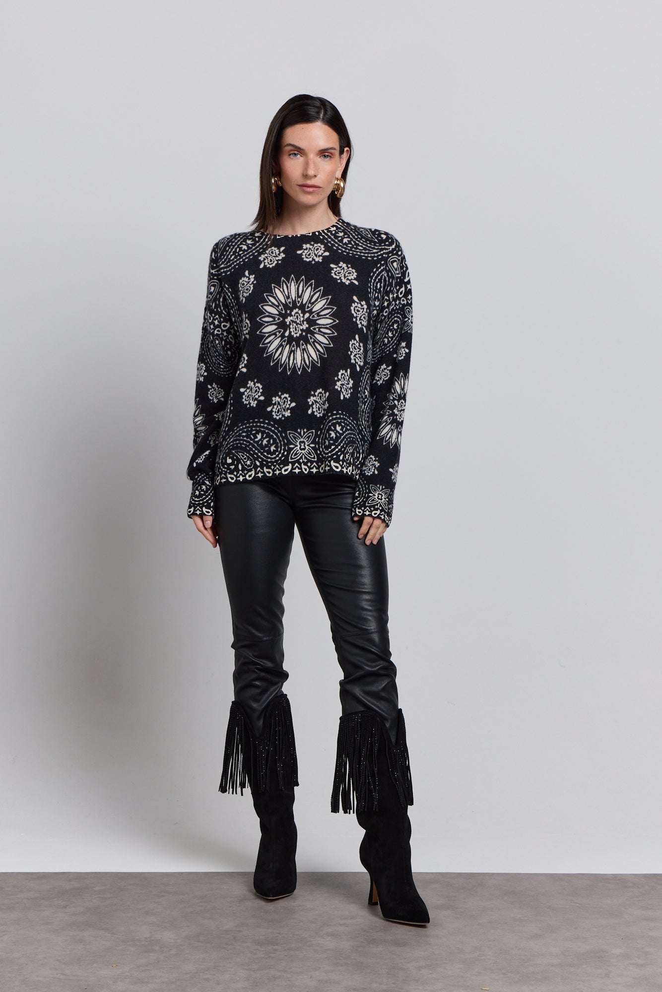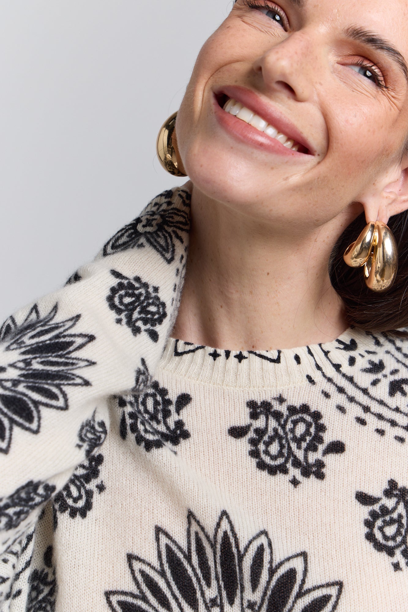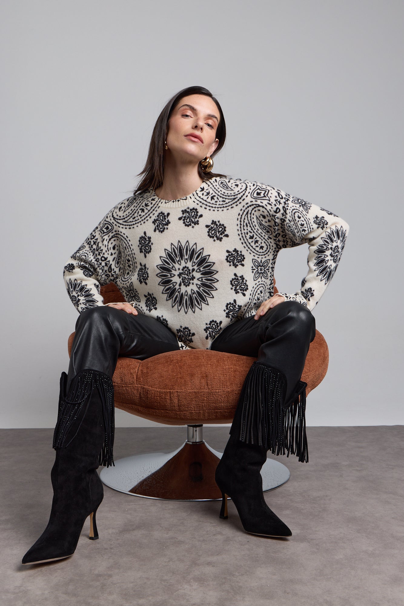 PRESLEY est un pull en 100% cachemire au style unique, sublimé par un imprimé bandana intégral qui lui confère une allure graphique et tendance. Sa coupe droite et son col rond en font une pièce confortable et facile à porter, idéale pour donner du caractère à vos tenues.