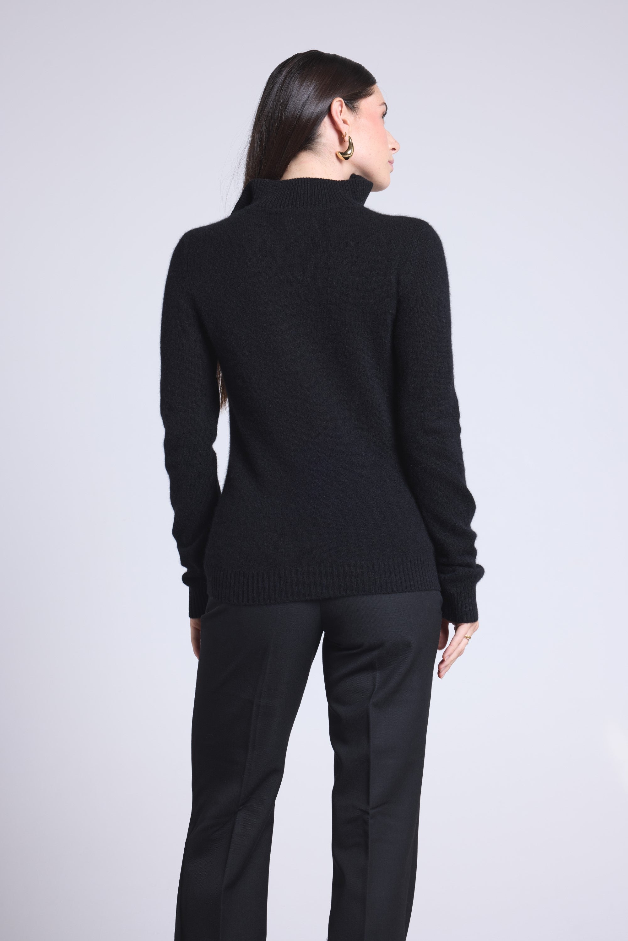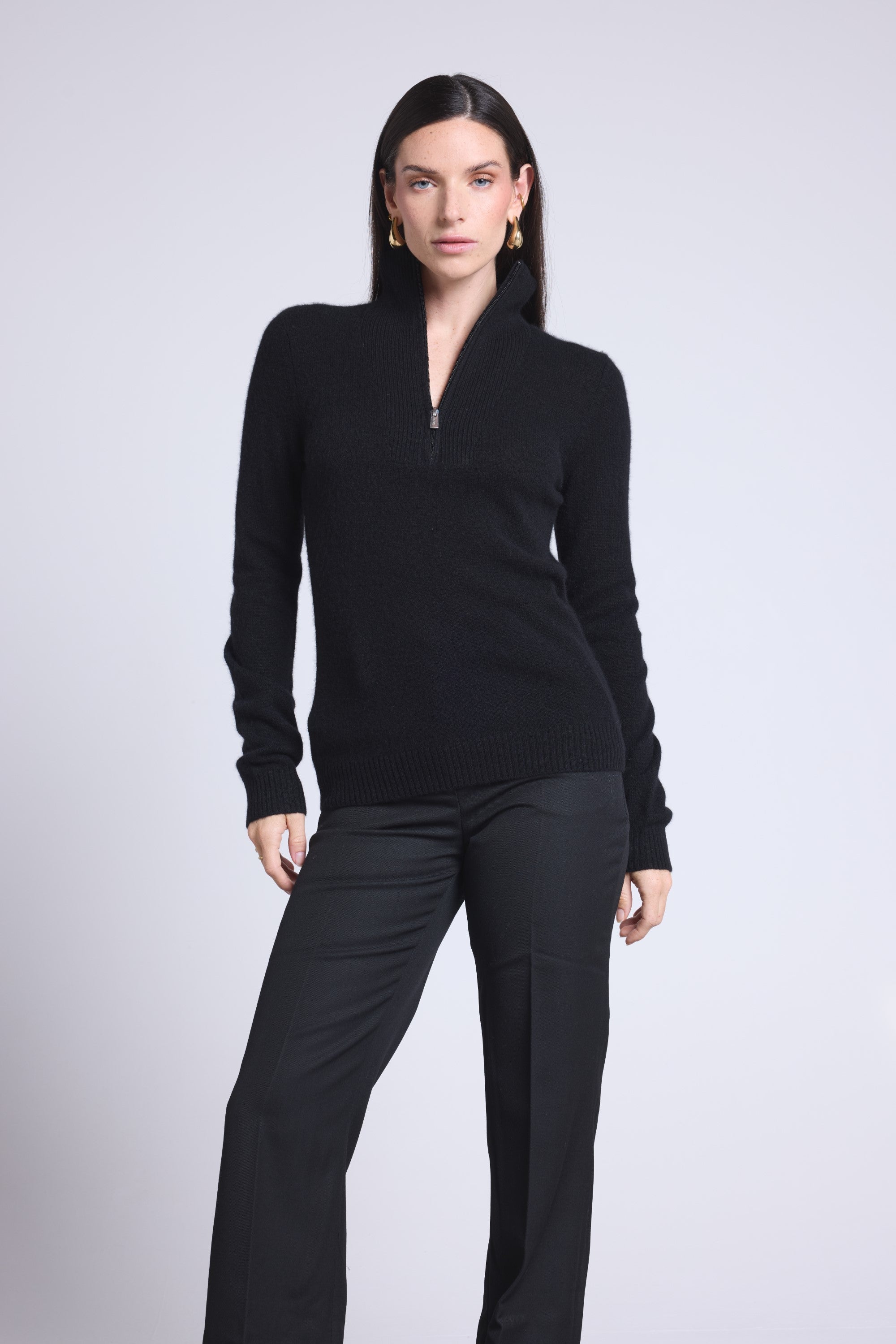 Pull col montant zippé en 100% cachemire, tricoté en 2 fils, jauge 12GG, offrant douceur, chaleur et confort.