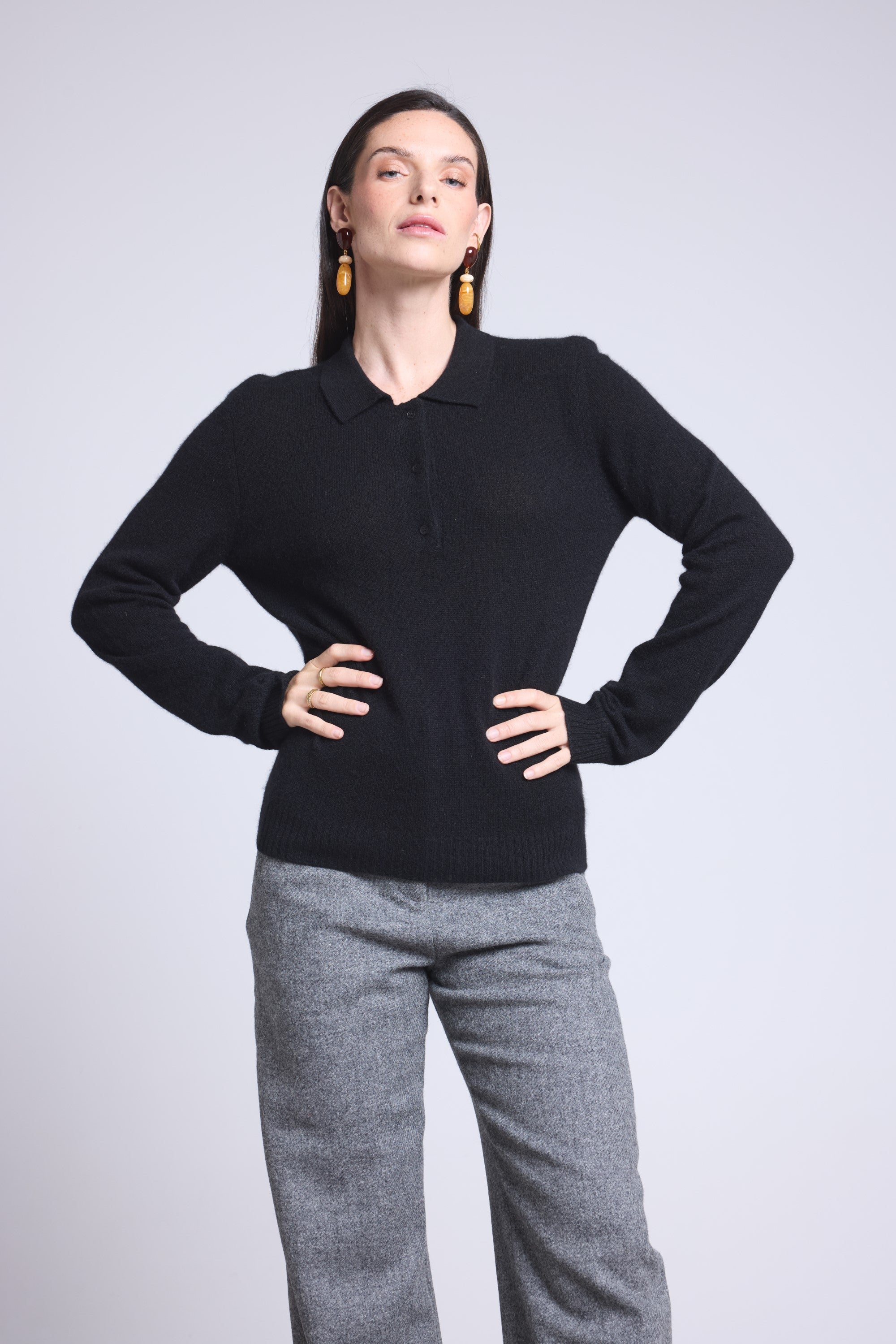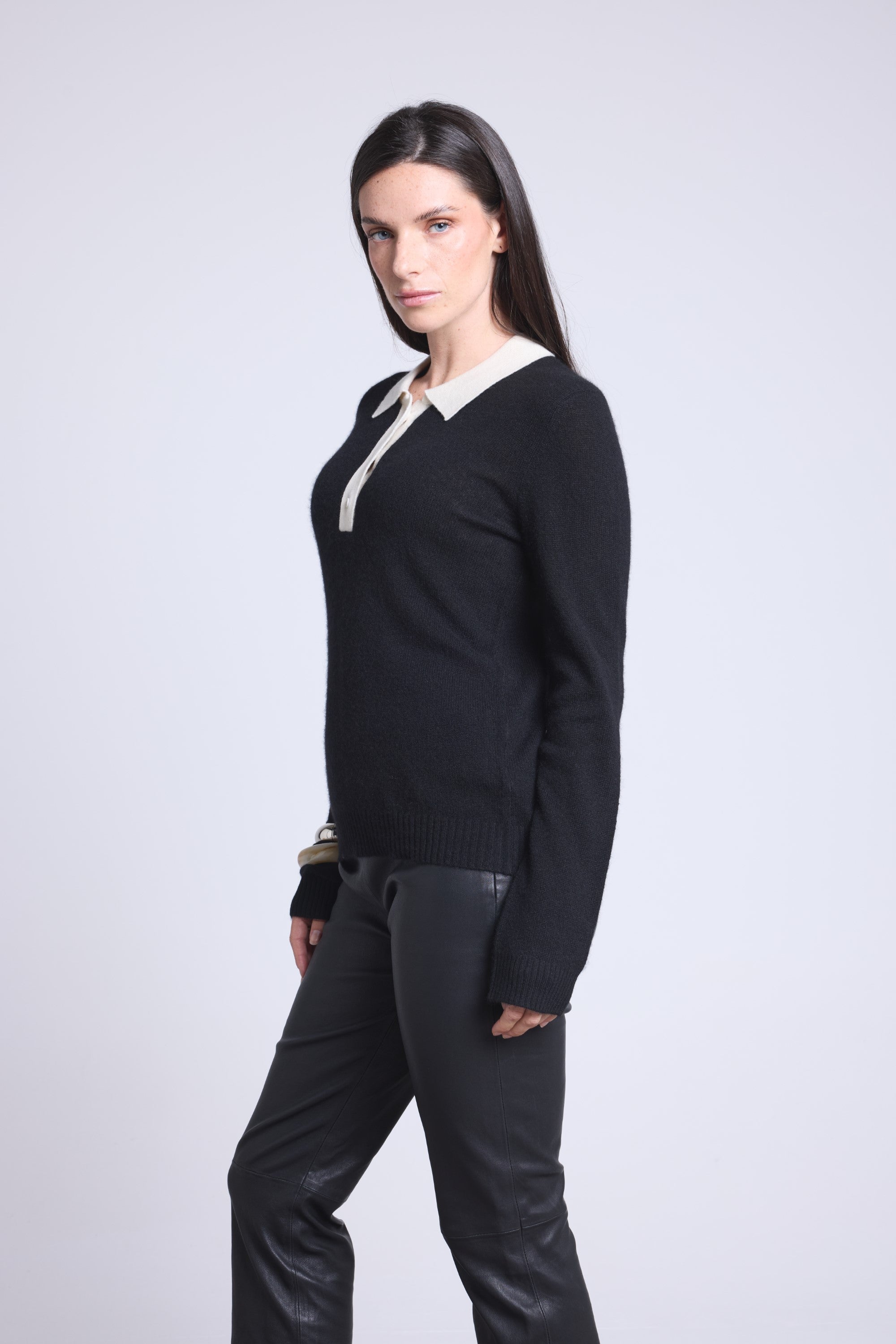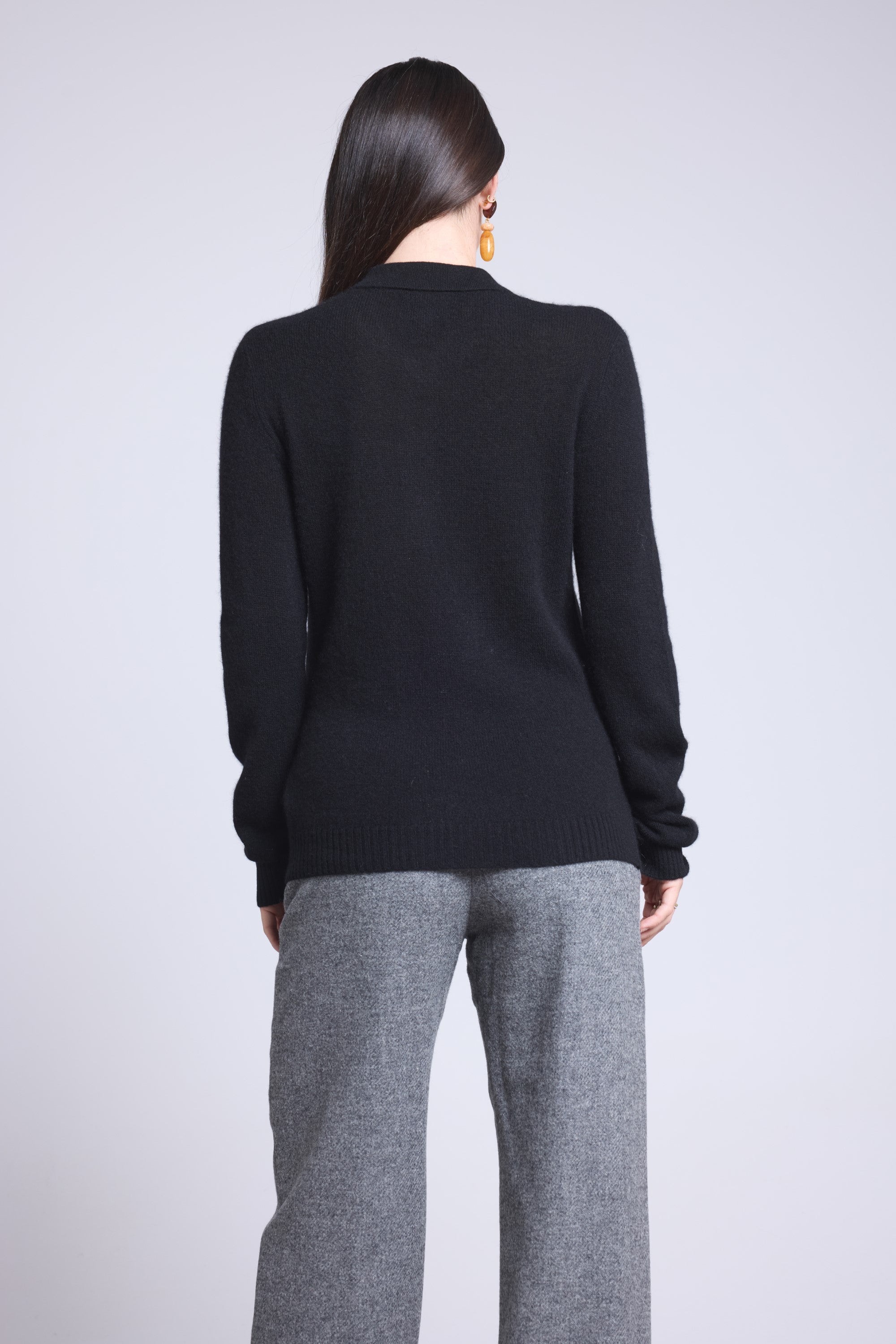 Pull polo en 100% cachemire, tricoté en 2 fils, jauge 12GG, combinant l’élégance d’un col boutonné et la douceur luxueuse du cachemire.