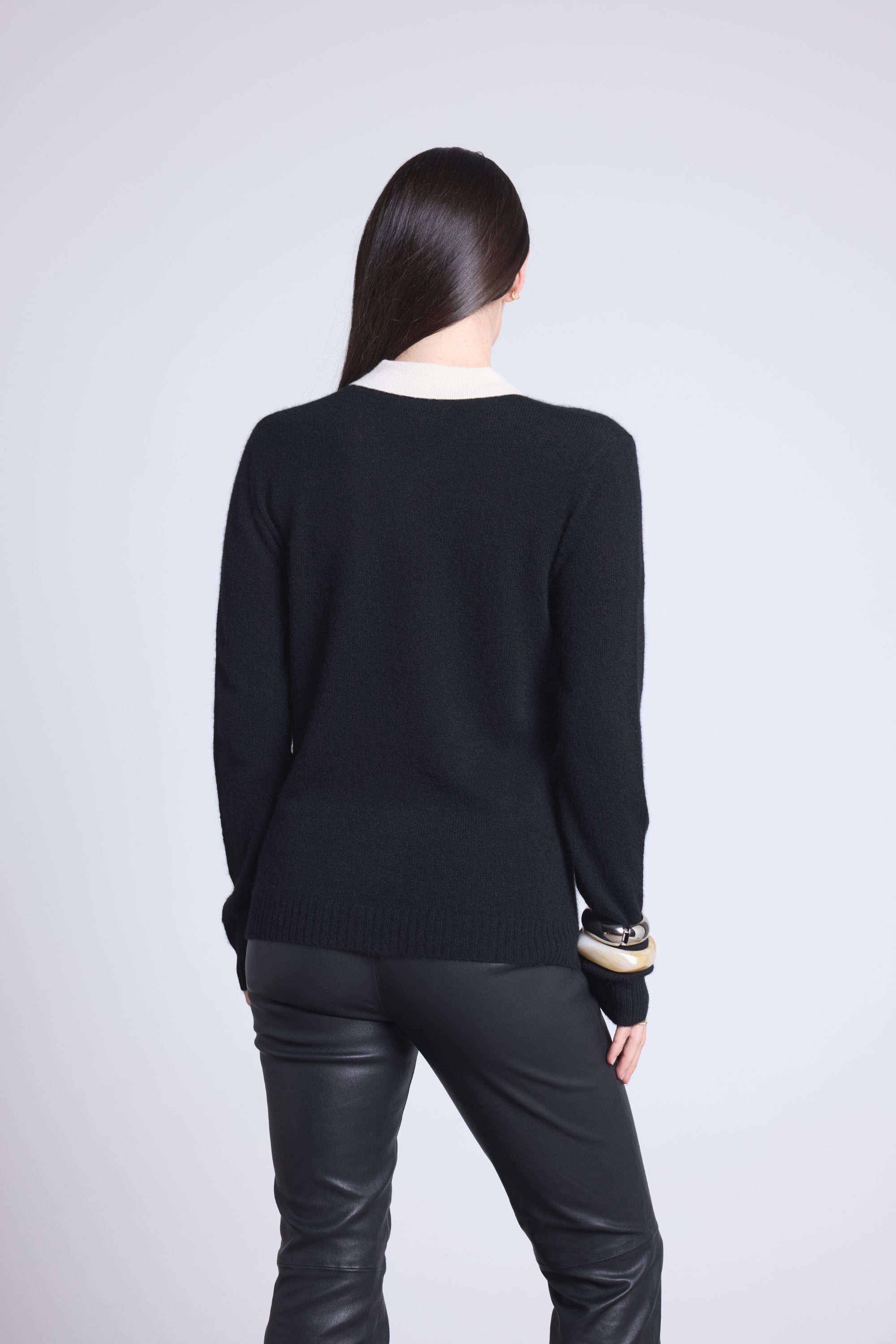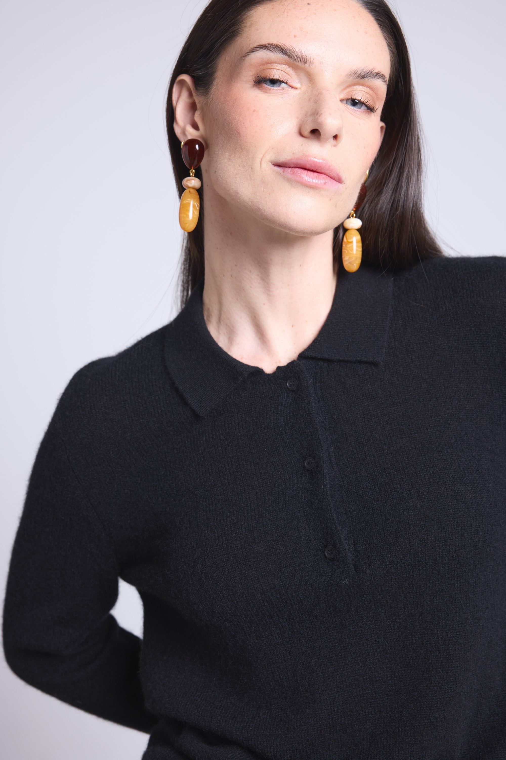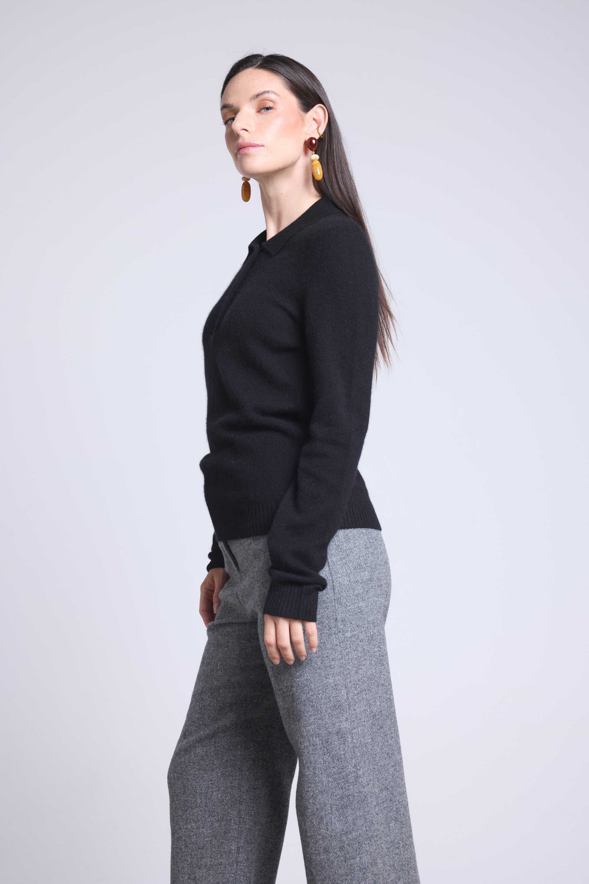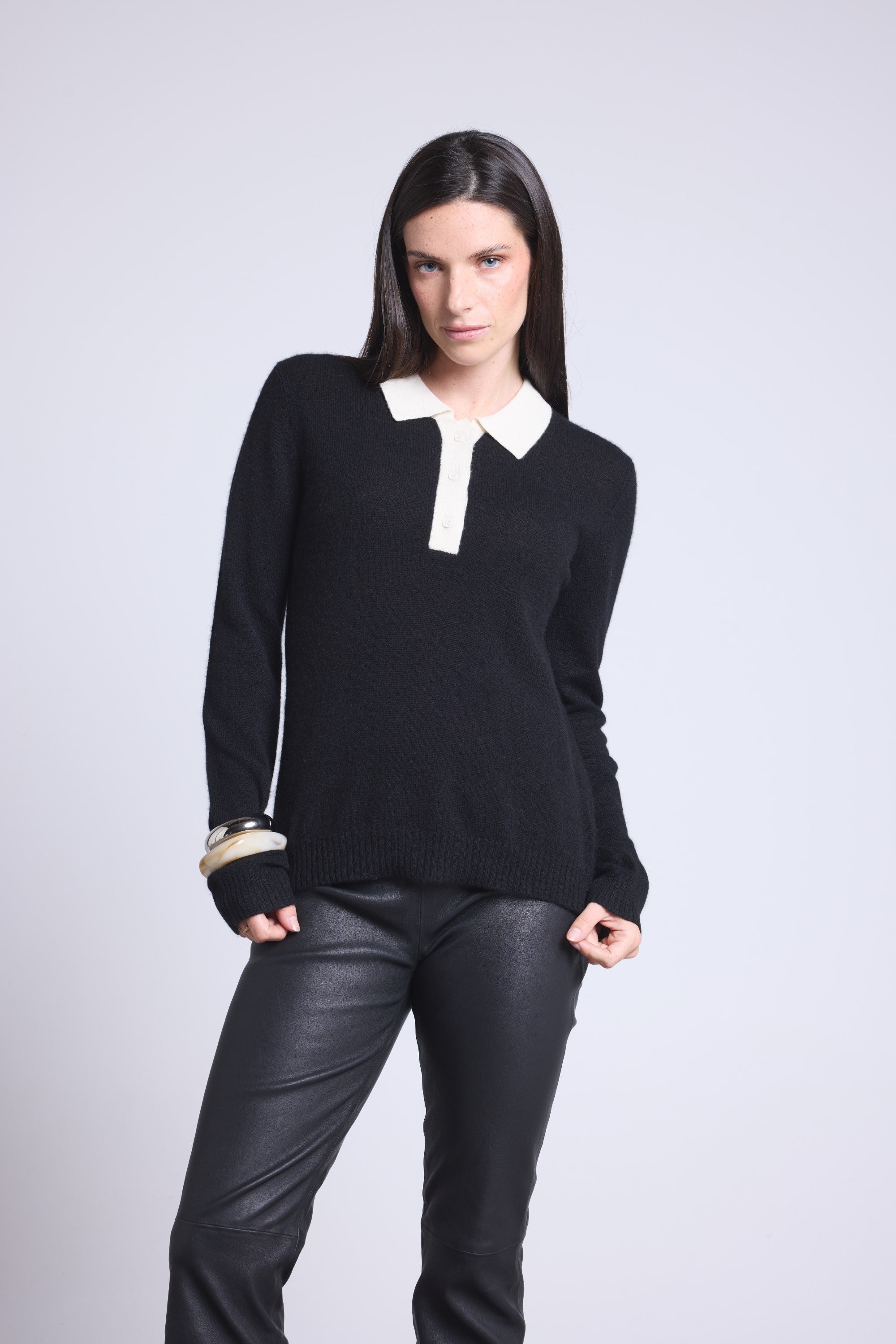 Pull polo en 100% cachemire, tricoté en 2 fils, jauge 12GG, combinant l’élégance d’un col boutonné et la douceur luxueuse du cachemire.