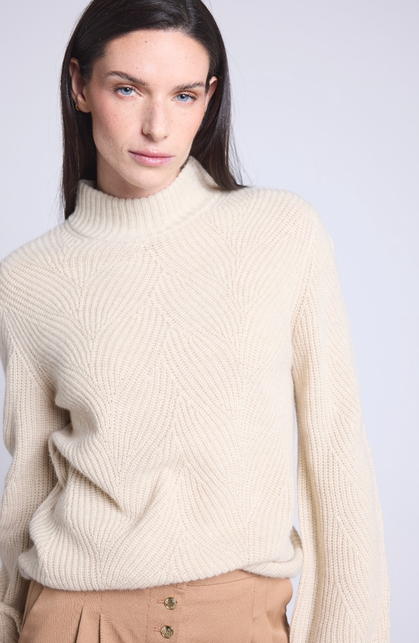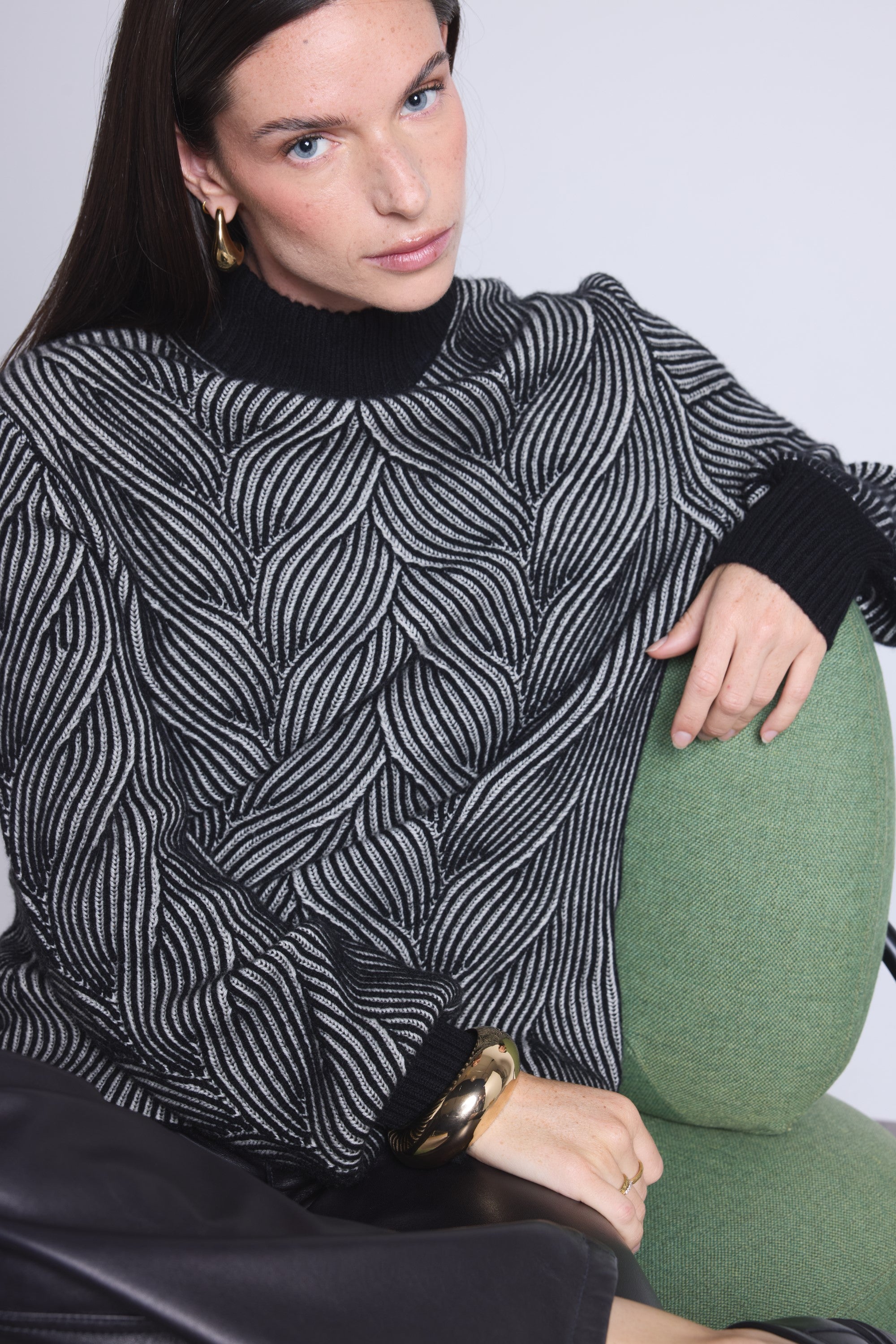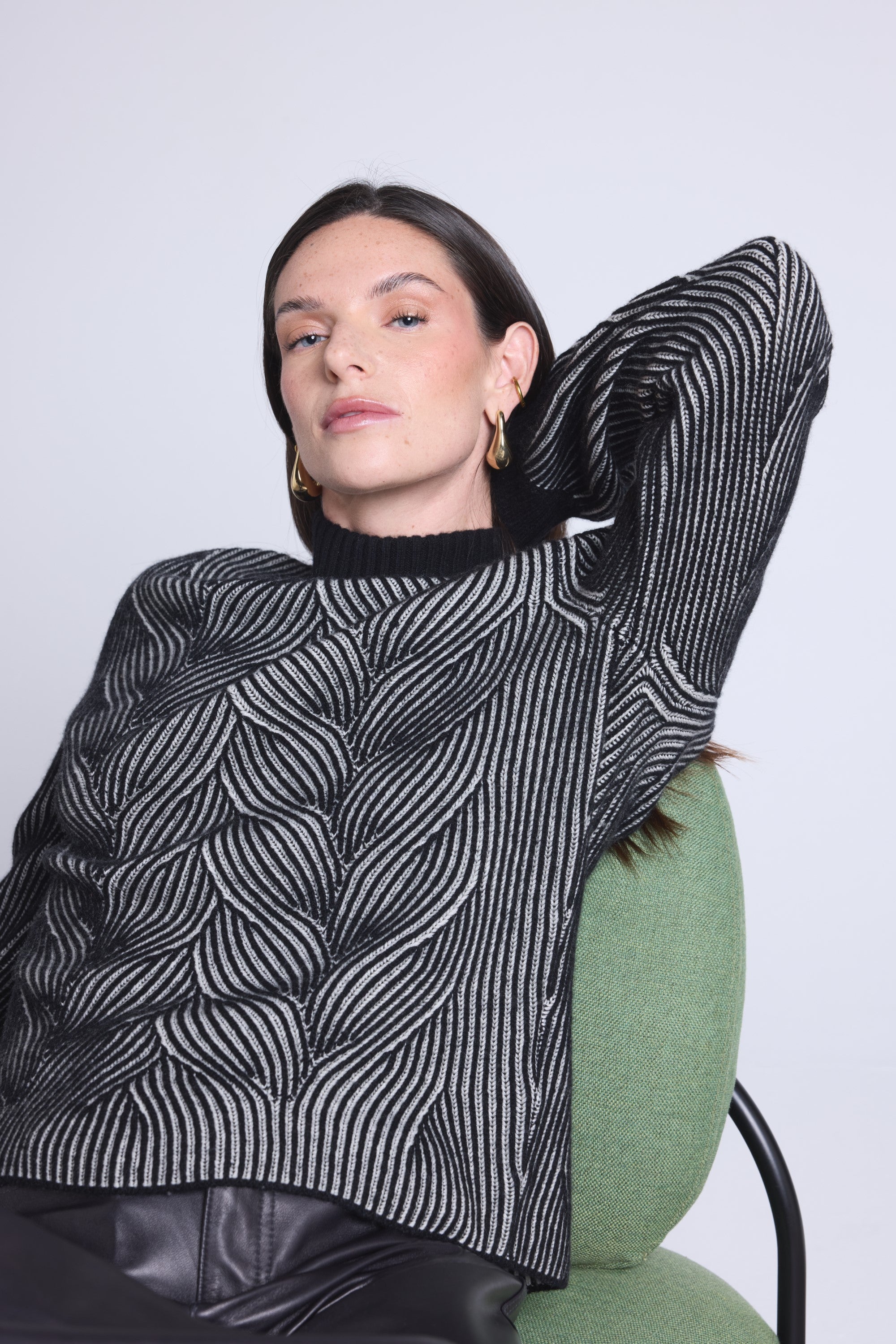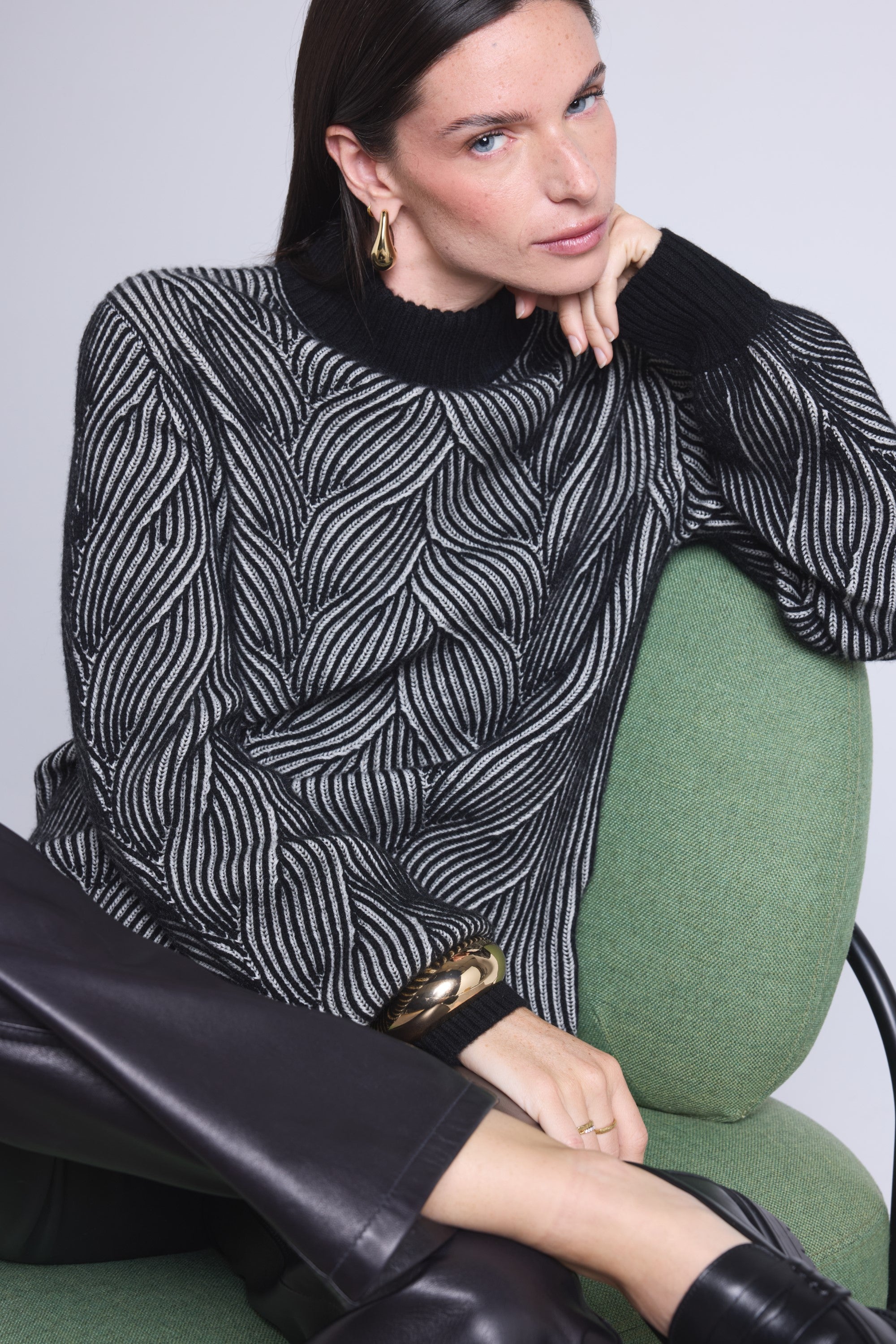 Pull en laine et cachemire, travaillé dans un point fantaisie graphique en relief, créant un jeu de textures élégant et contemporain.