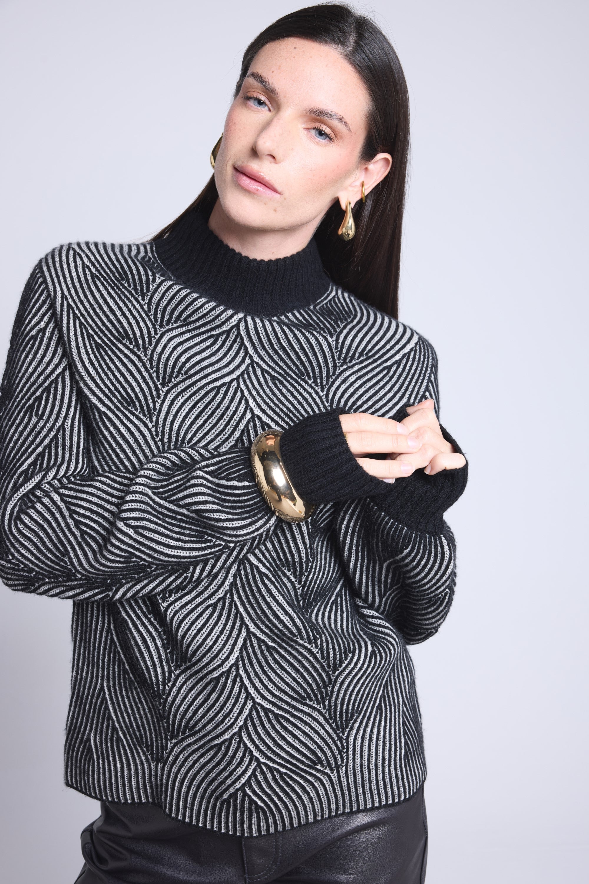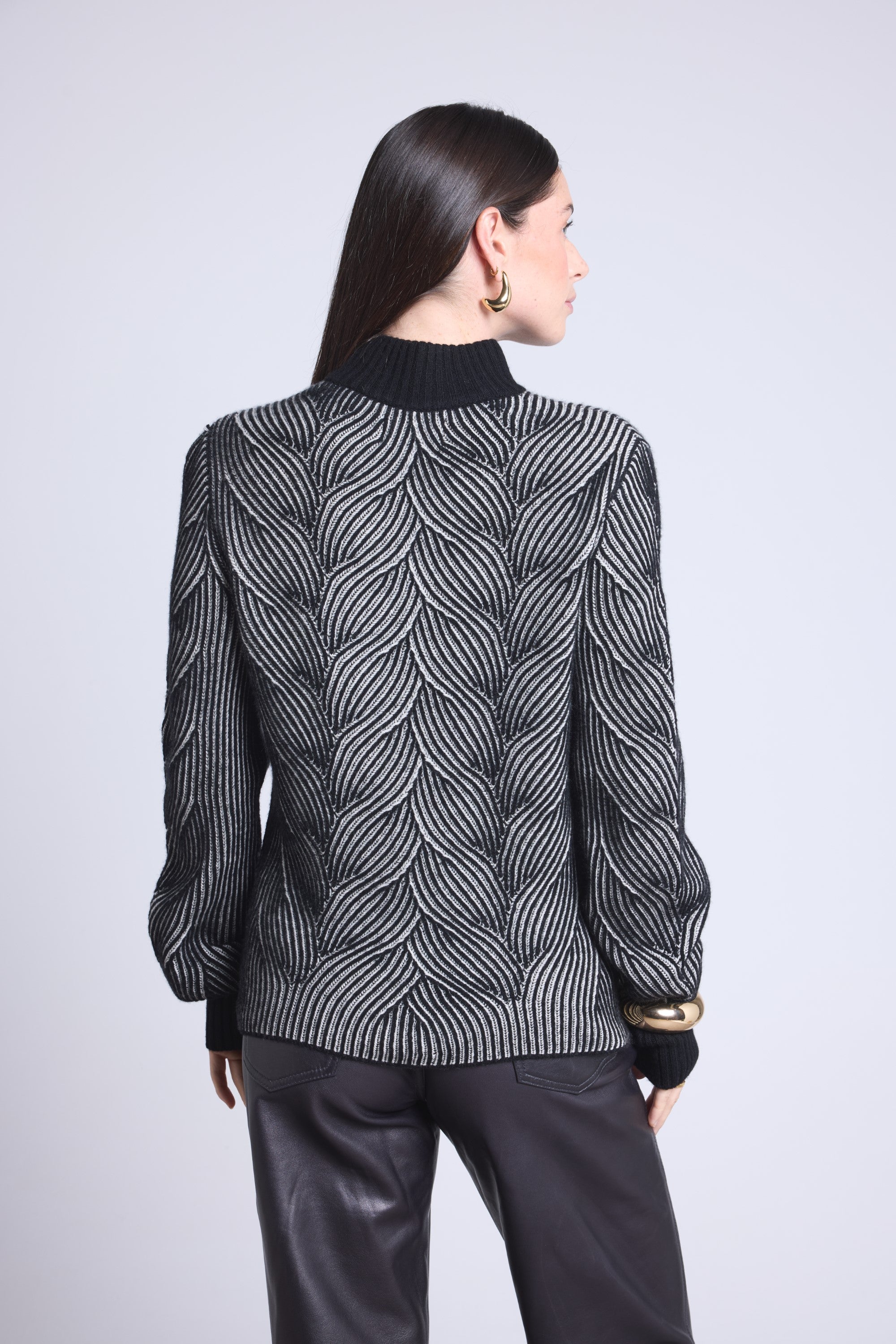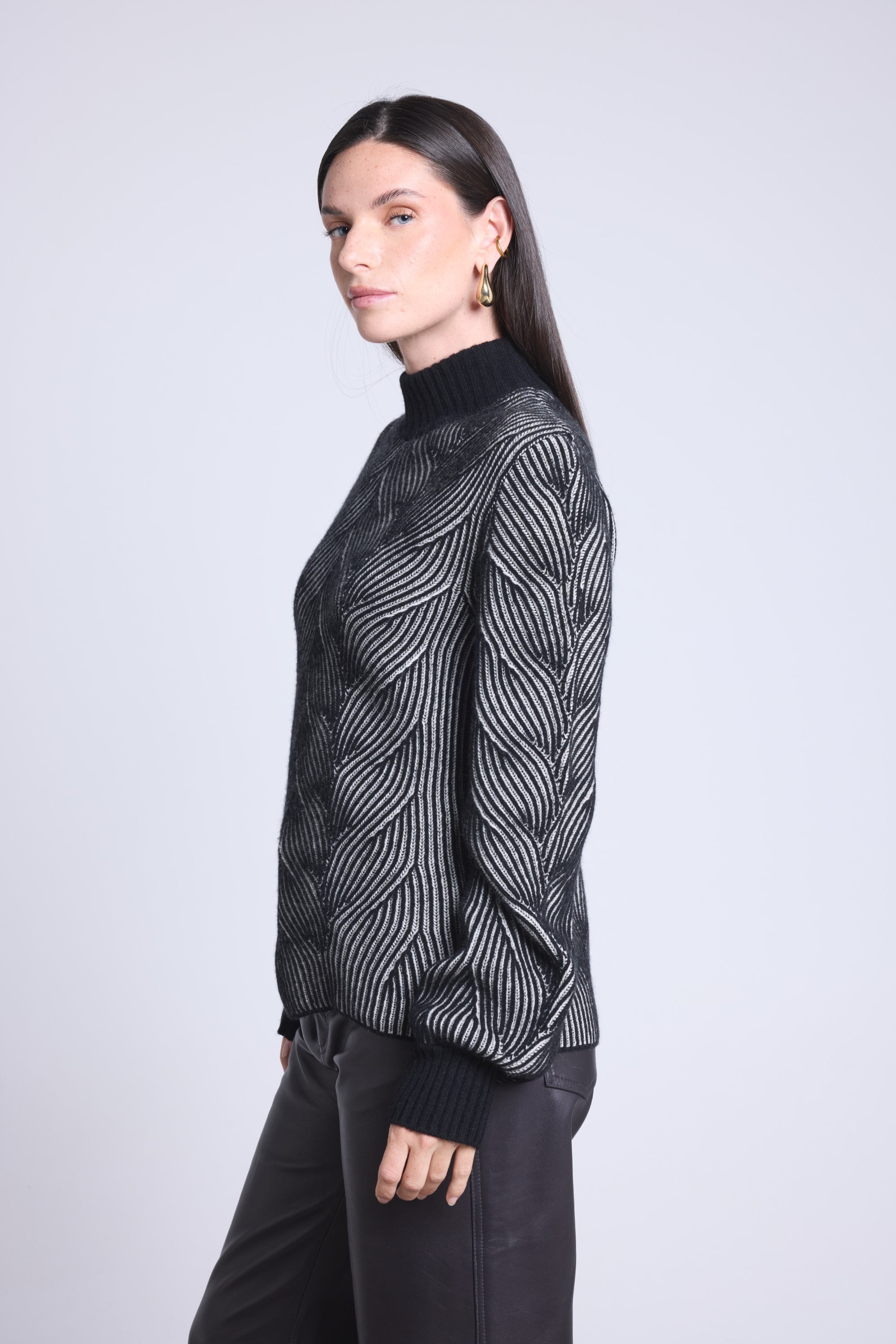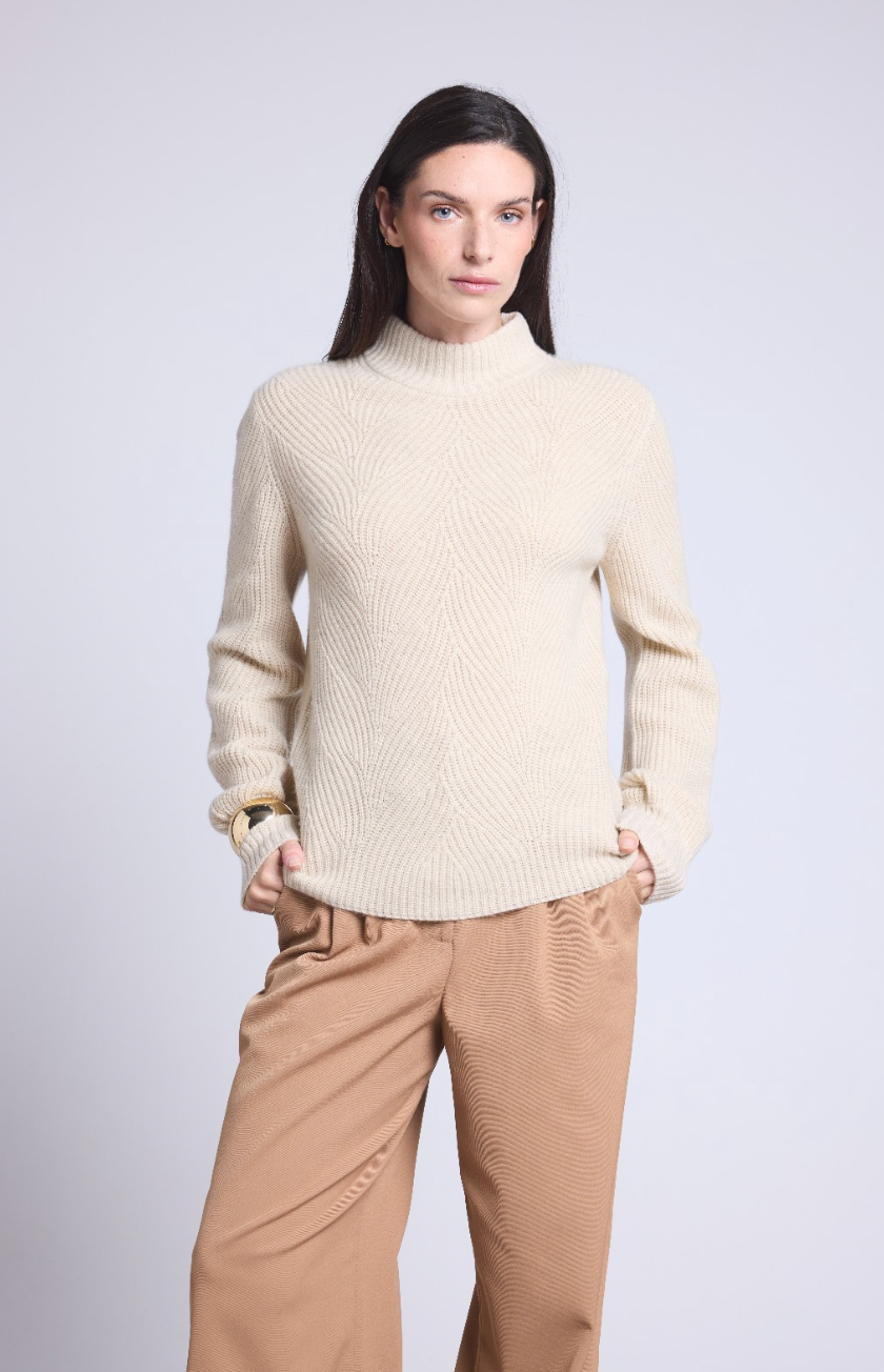 Pull en laine et cachemire, travaillé dans un point fantaisie graphique en relief, créant un jeu de textures élégant et contemporain.