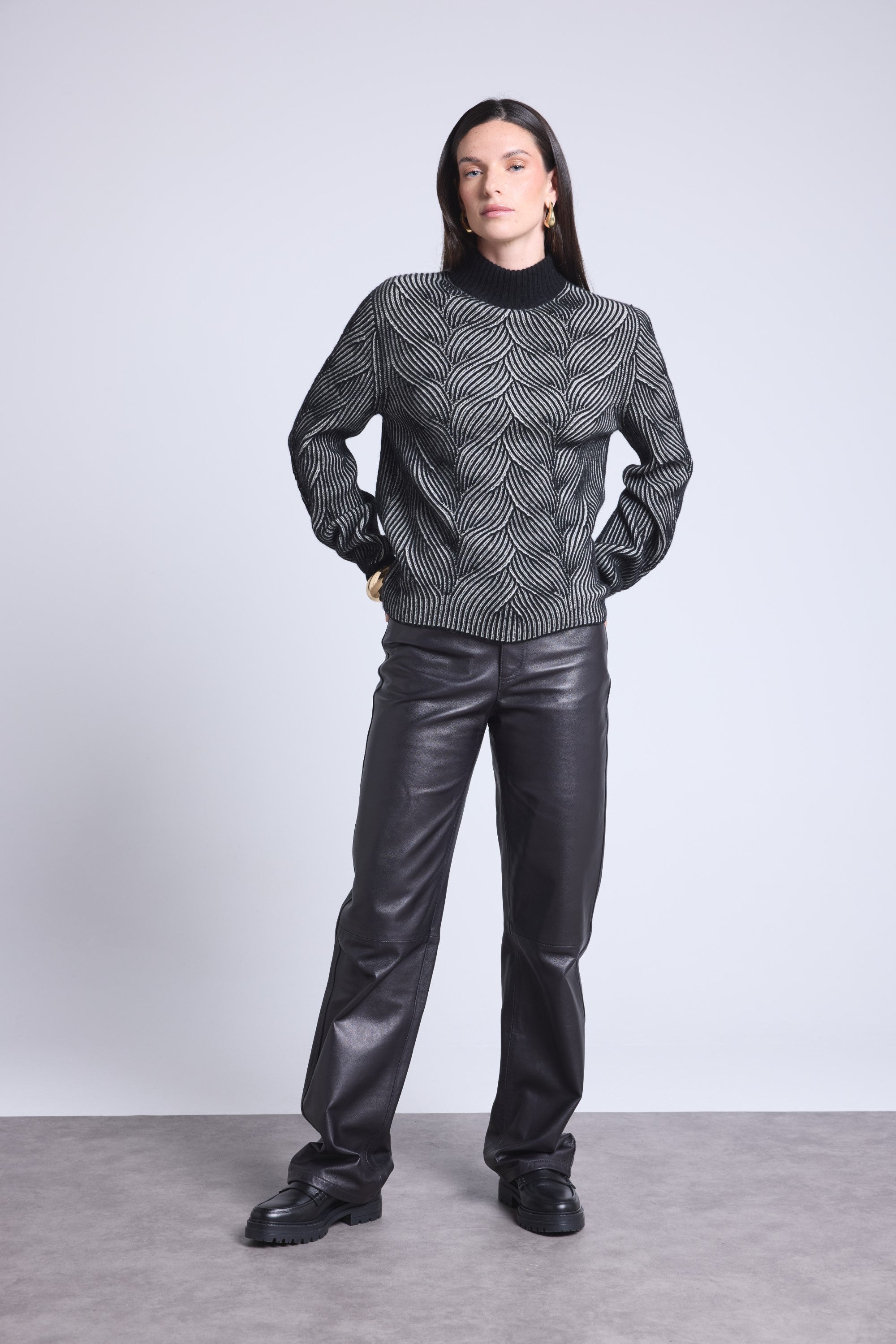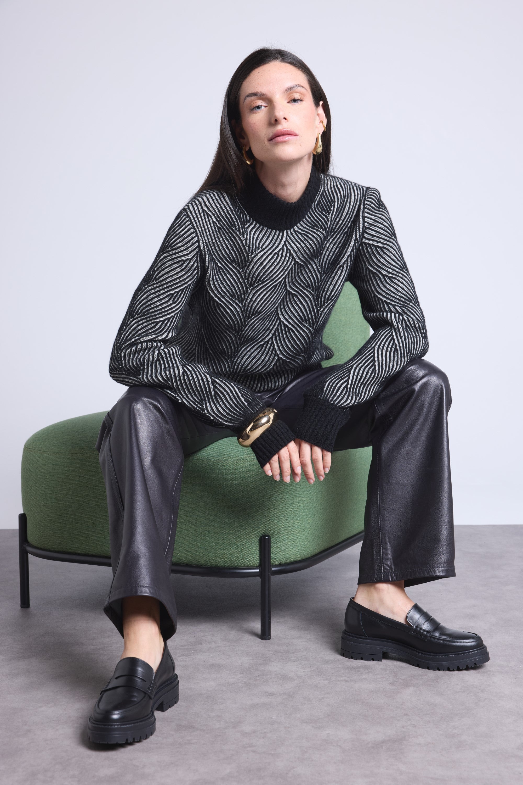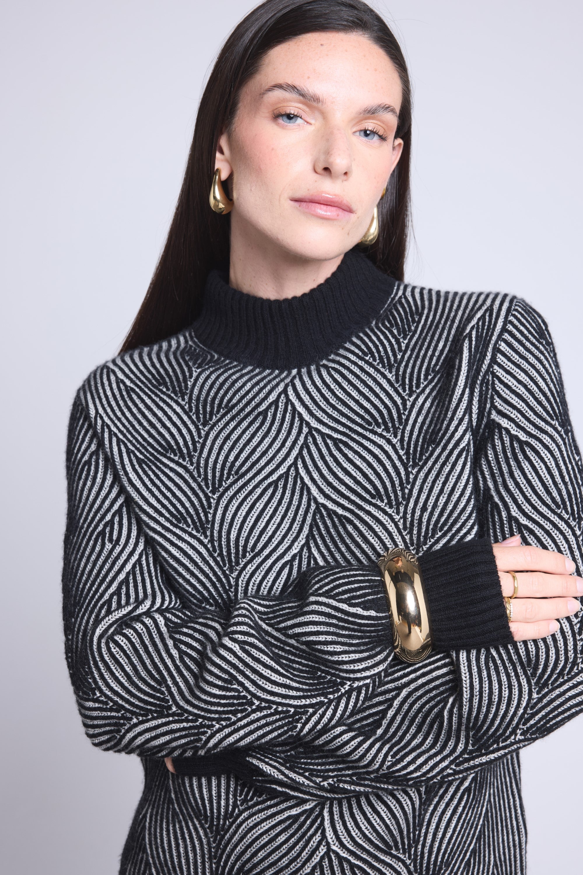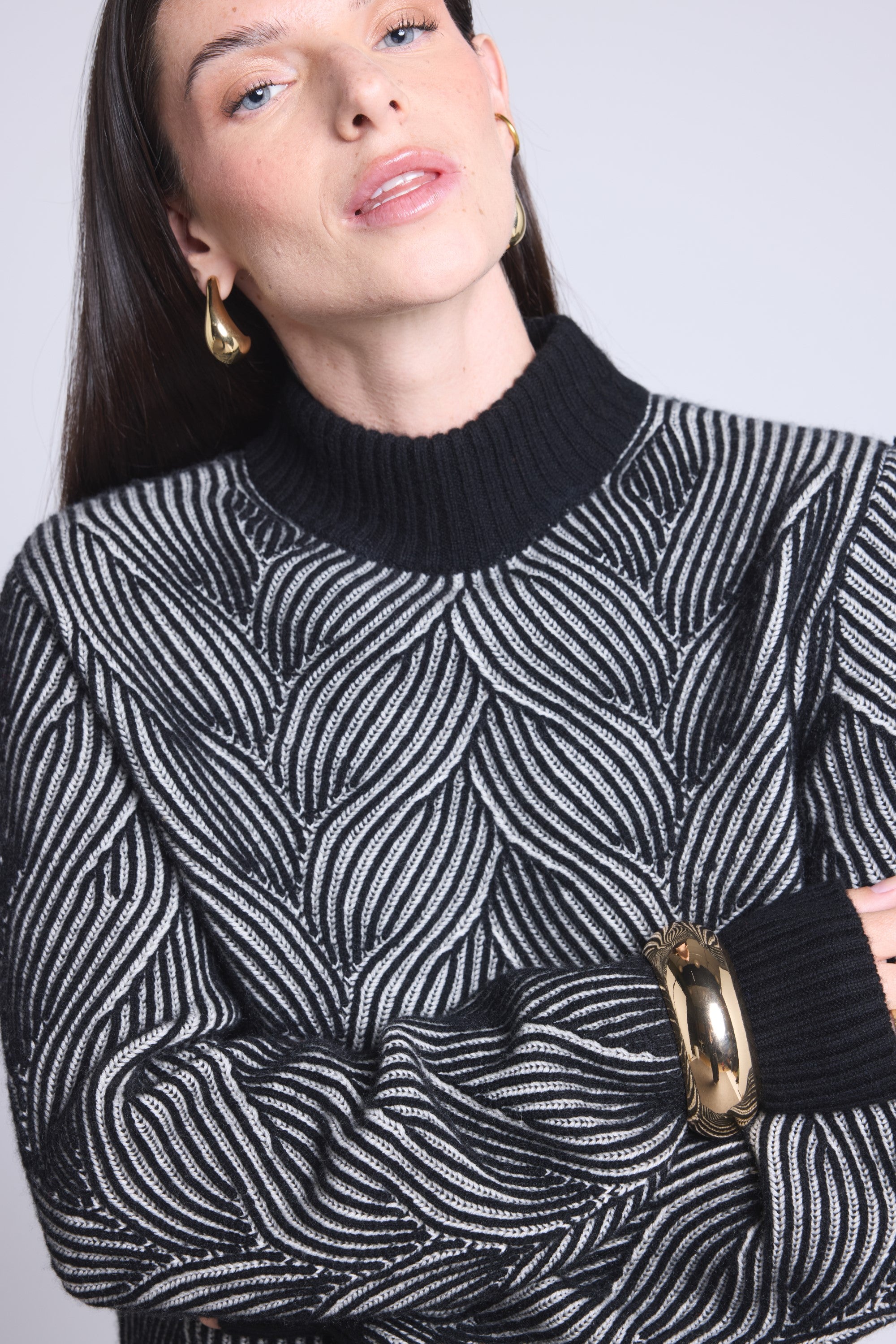 Pull en laine et cachemire, travaillé dans un point fantaisie graphique en relief, créant un jeu de textures élégant et contemporain.